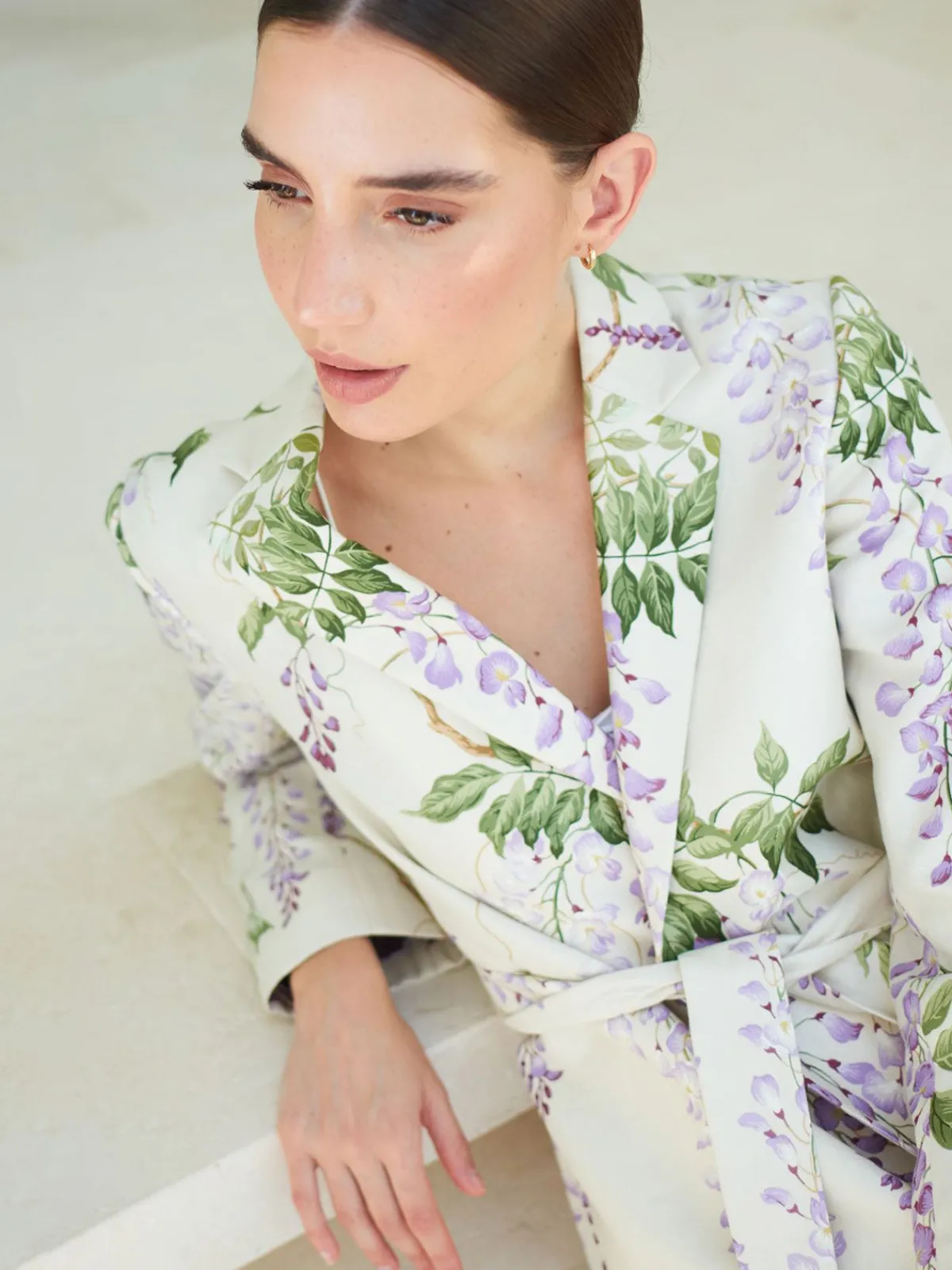 Our Maison Alma Kimono in Purple Wisteria boasts elegance and sophistication in a long sleeve silhouette with removable wrap belt, a notch collar, and narrow lapels. Detailed with side pockets and a hidden breast pocket, this piece is entirely handcrafted by master tailors in Colombia.