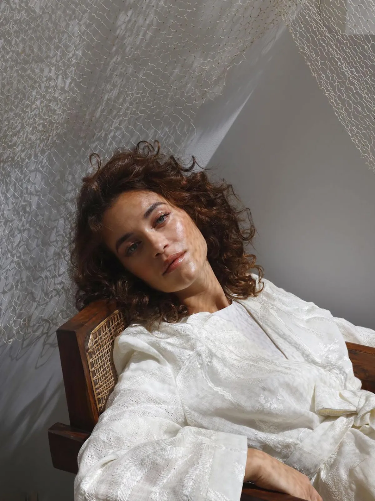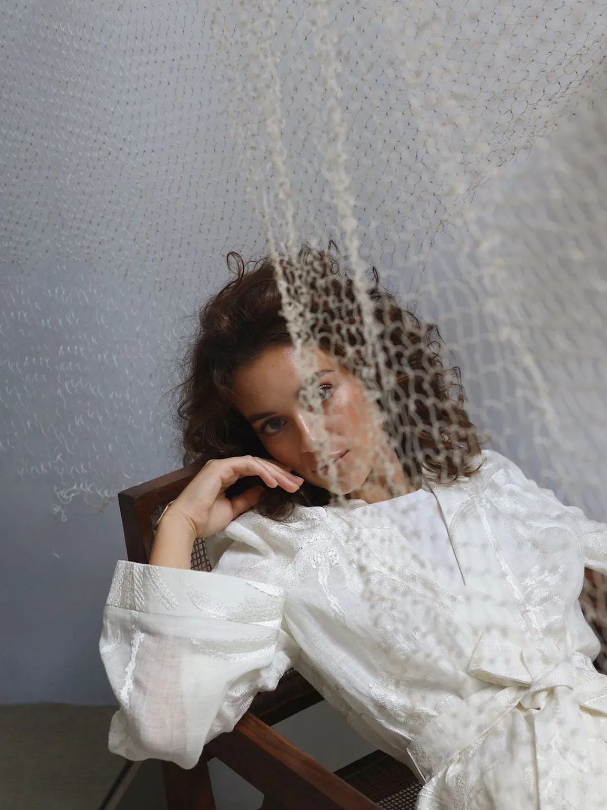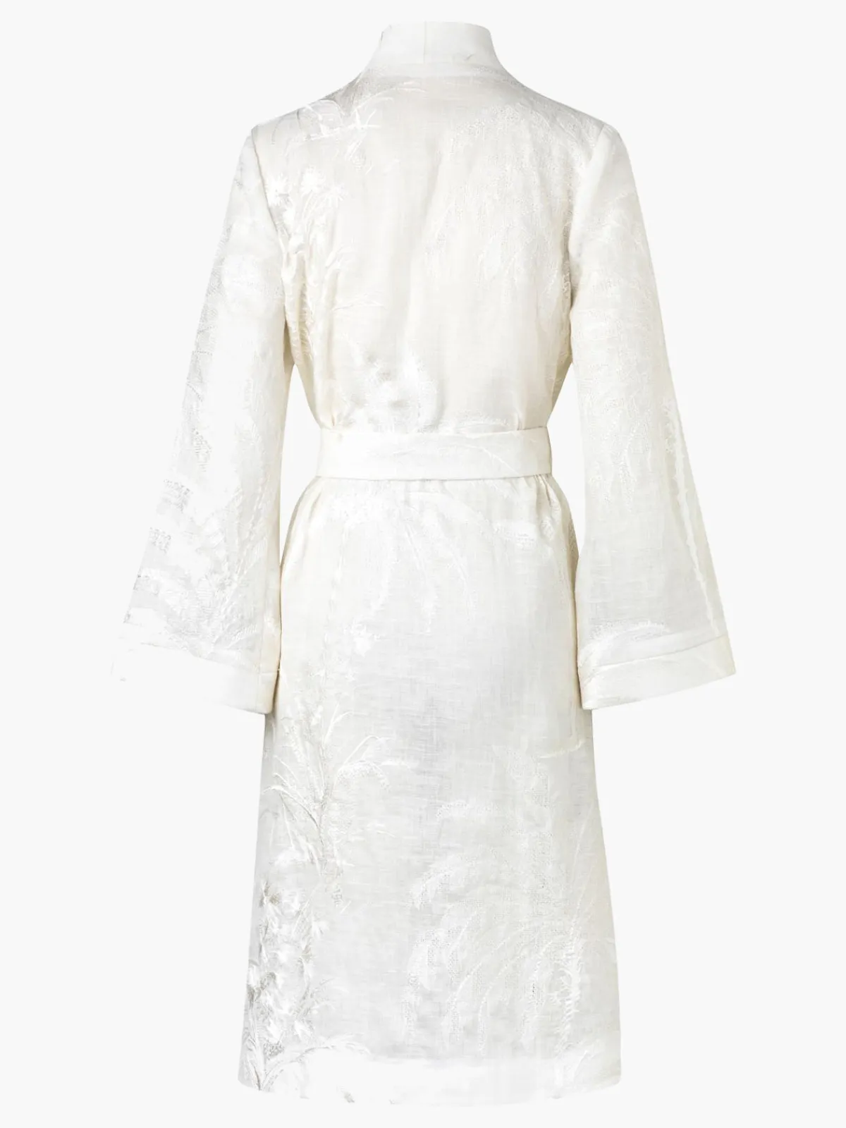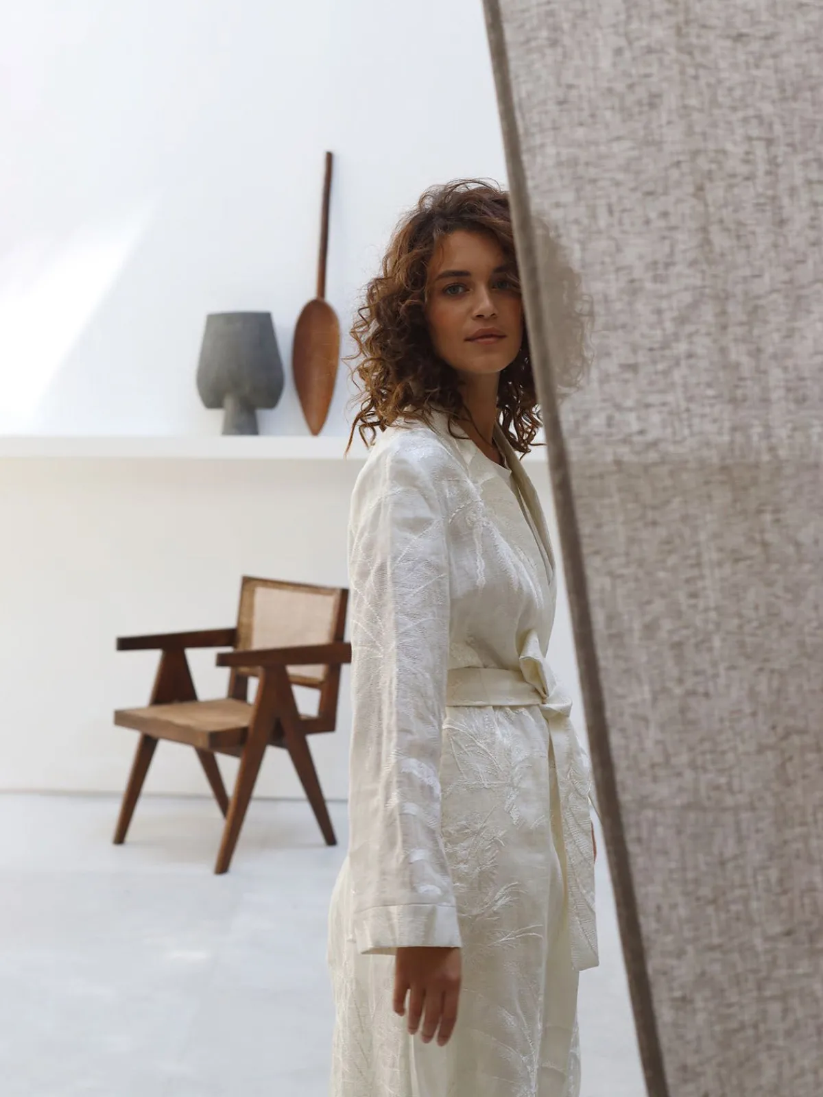 Our Maison Alma Wrap Coat in Playa Blanca boasts a chic look with long sleeves, flared cuffs, and a removable belt that ties at the waist. Detailed with a V-neckline, side pockets, and a hidden breast pocket, this piece is entirely handcrafted by master tailors in Colombia.
