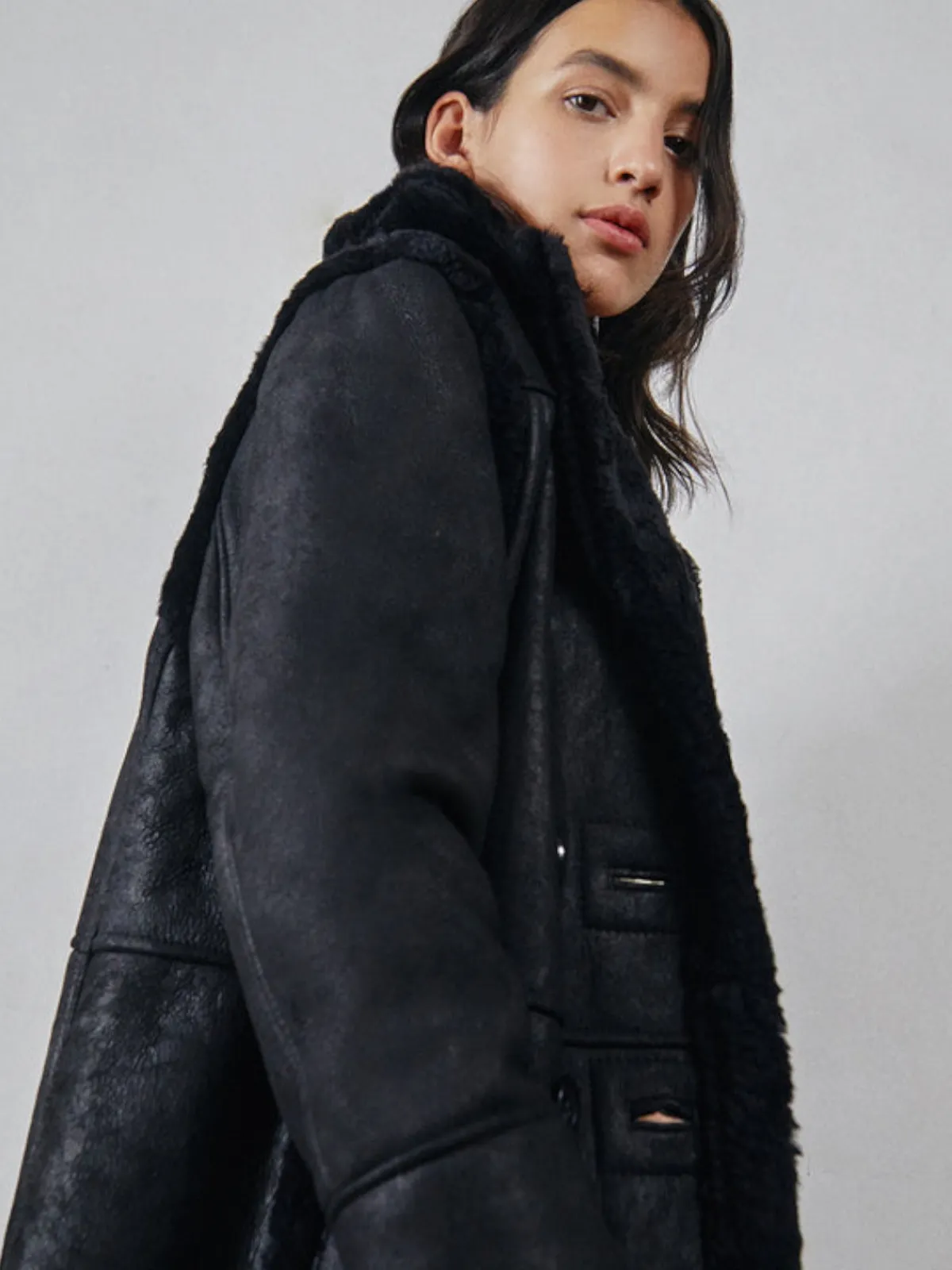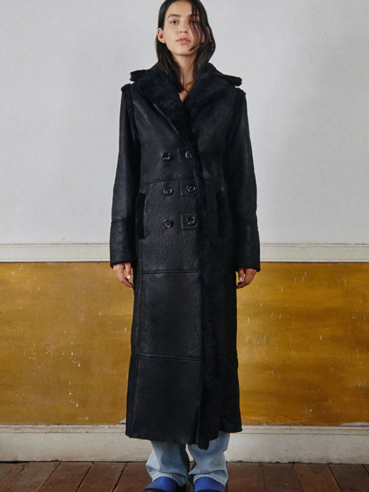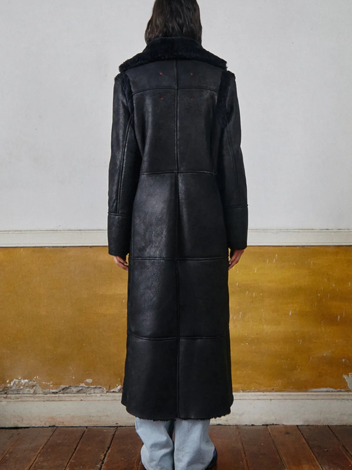 Our Neon Long Coat in Black is crafted from a soft Napa Leather exterior and a cozy fully lined, high-pile shearling interior. This jacket features a water resistant leather treatment with wool details on the shoulders, pockets, and sleeves. Handcrafted by master artisans in Argentina using locally sourced by-product materials.