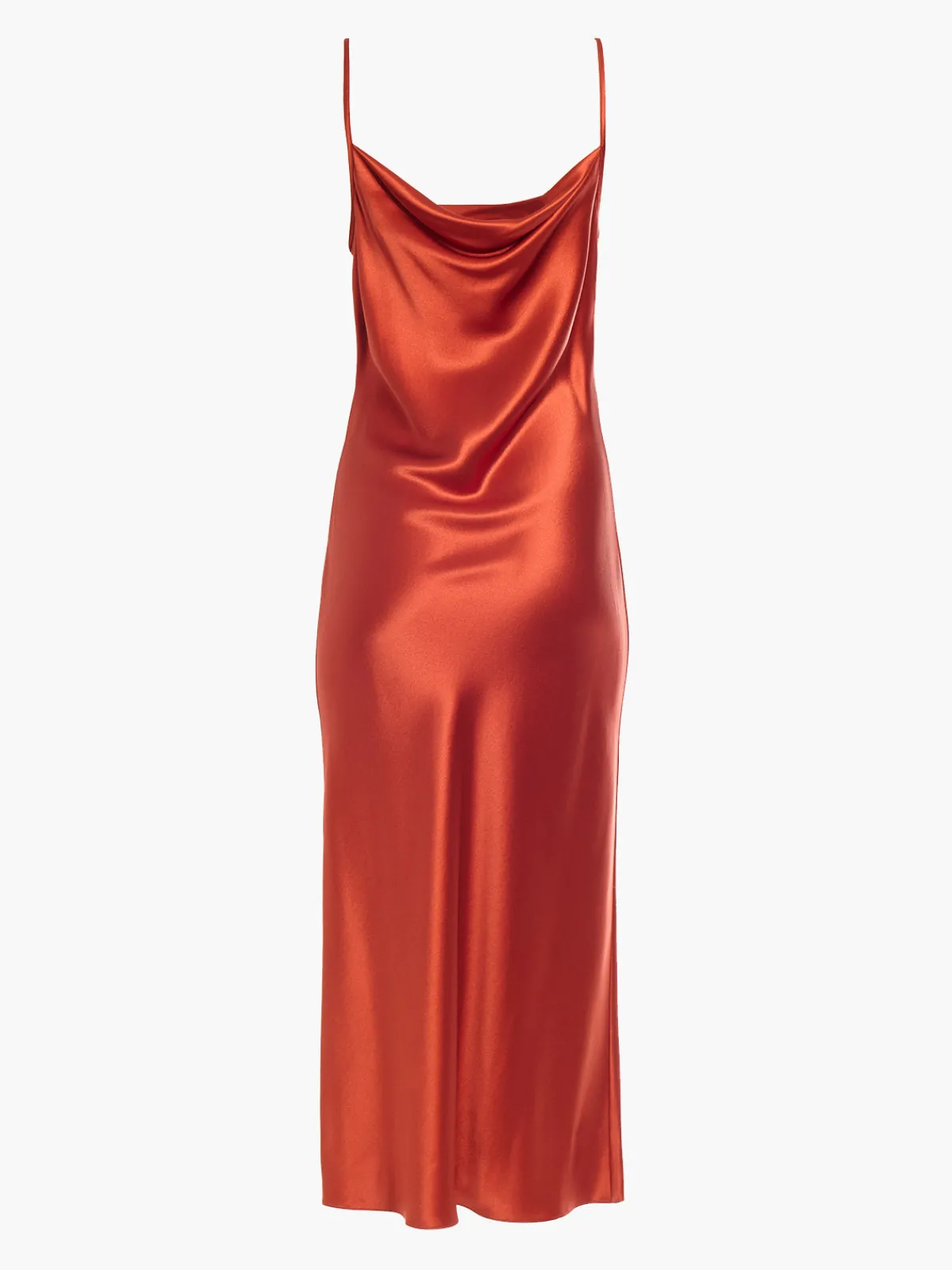 Mi Jong Lee midi dress featuring spaghetti straps and draped detailing at front and back. Handcrafted by artisans in New York City.