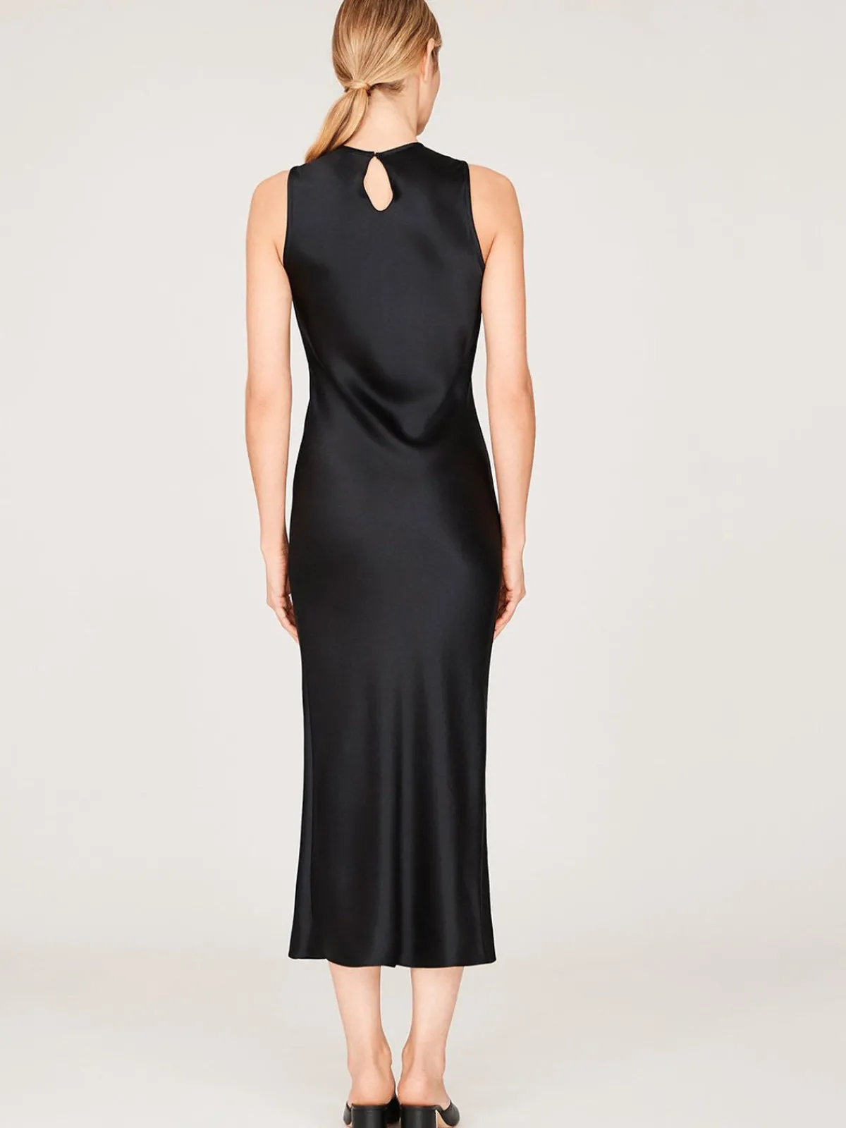 Our Mi Jong Lee Satin Crew Neck Bias Dress in Black flatters in a sleeveless silhouette with a round neckline, a midi length, and a keyhole back with a hook and eye closure. Handcrafted by artisans in our NYC atelier.