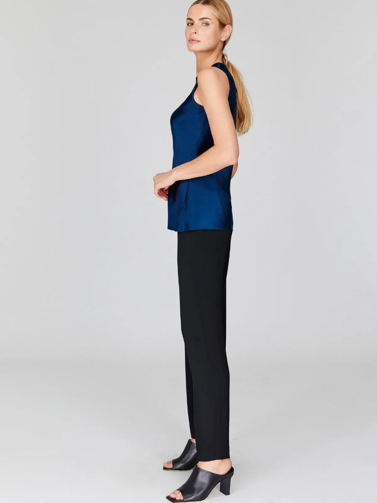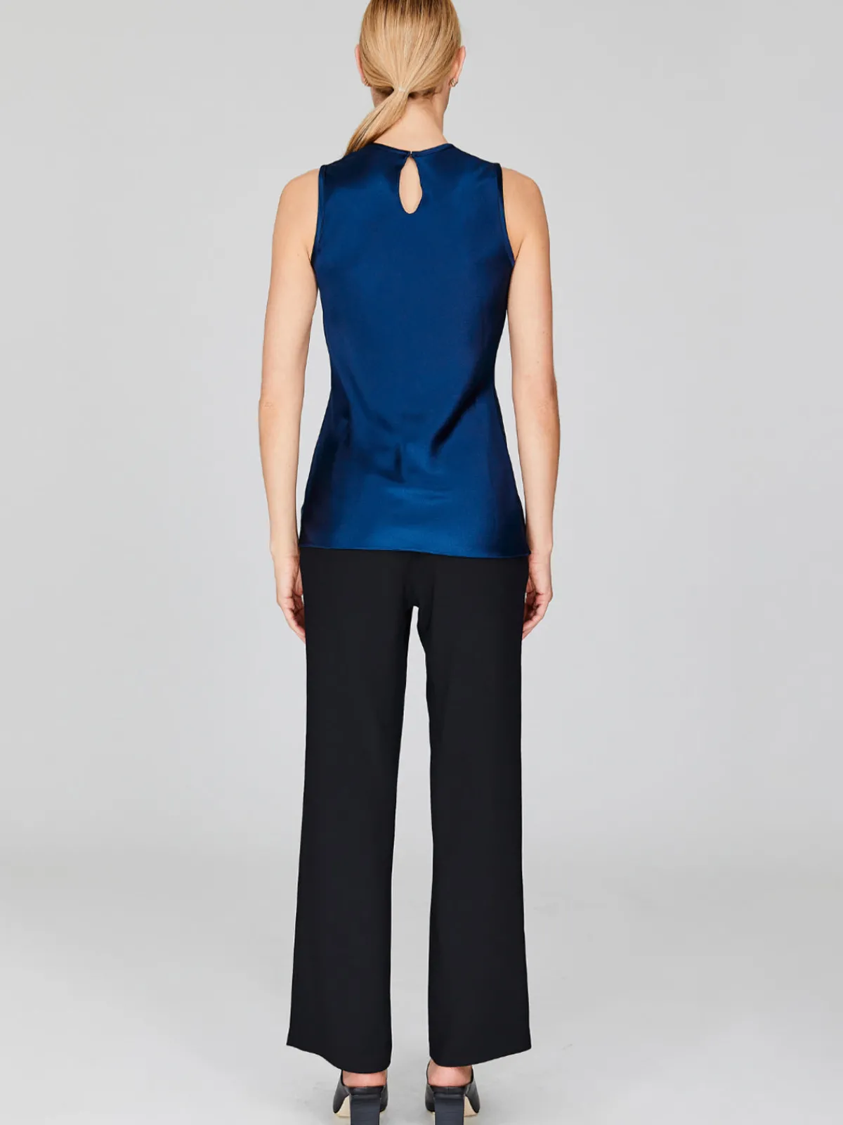 Our Mi Jong Lee Satin Crew Neck Bias Tank in Marine is effortless in a sleeveless silhouette with a round neckline and a keyhole back with a hook and eye closure. Handcrafted by artisans in our NYC atelier.