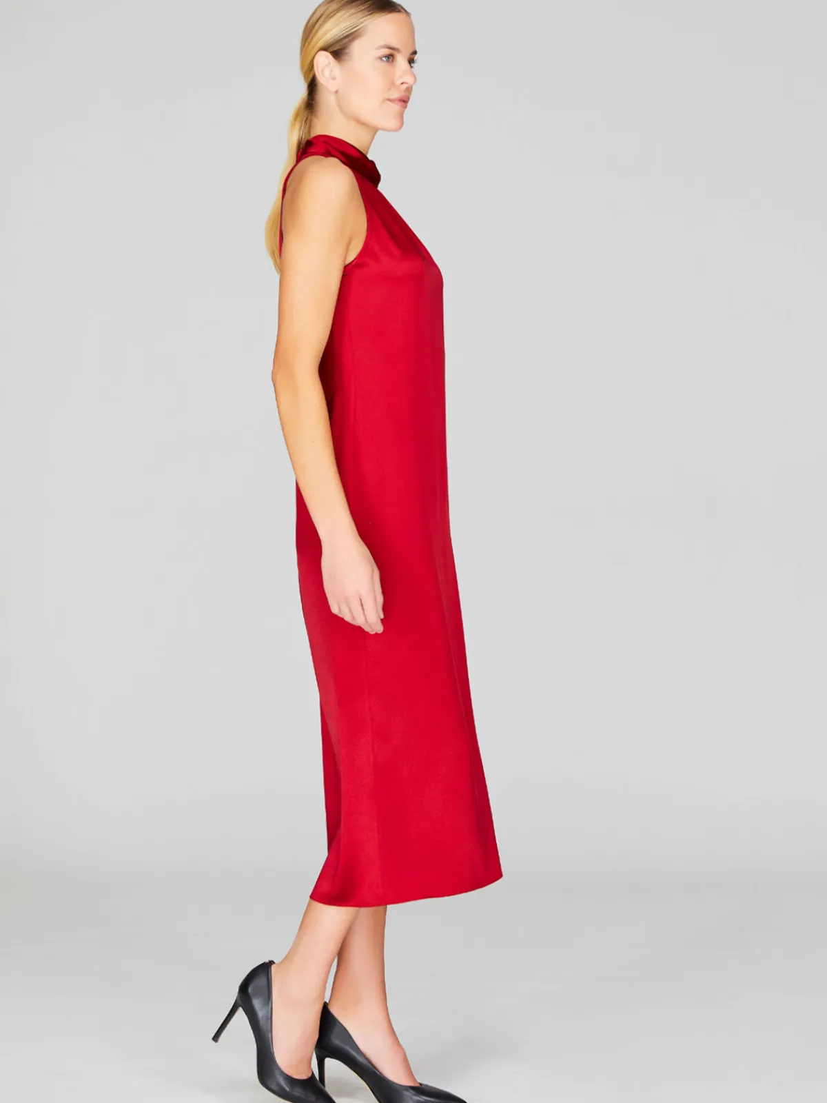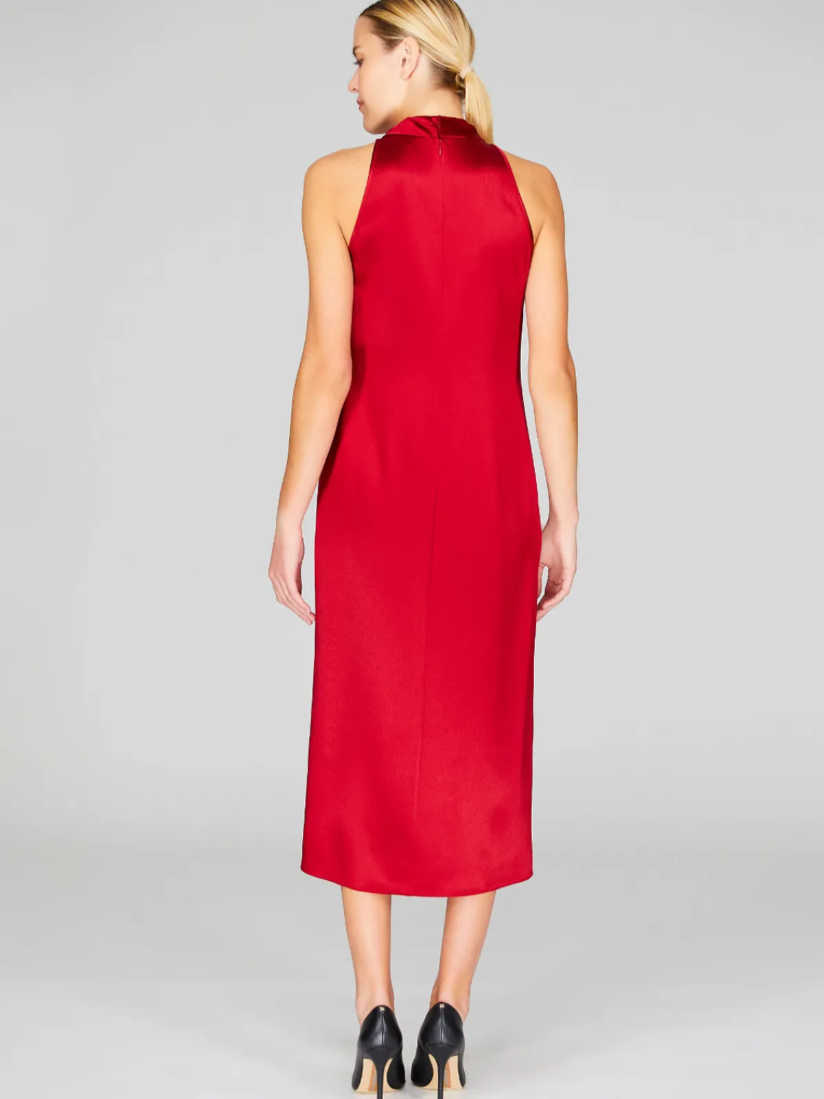 Our Mi Jong Lee Satin High Neck Gathered Dress in Merlot features a sleeveless silhouette in a midi length. It’s detailed with a high mock neckline with a twist detail and an invisible back zipper with a hook and eye closure. Handcrafted by artisans in our NYC atelier.