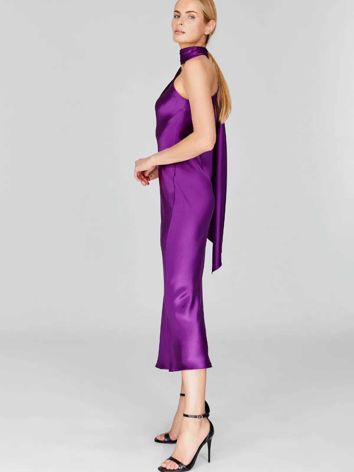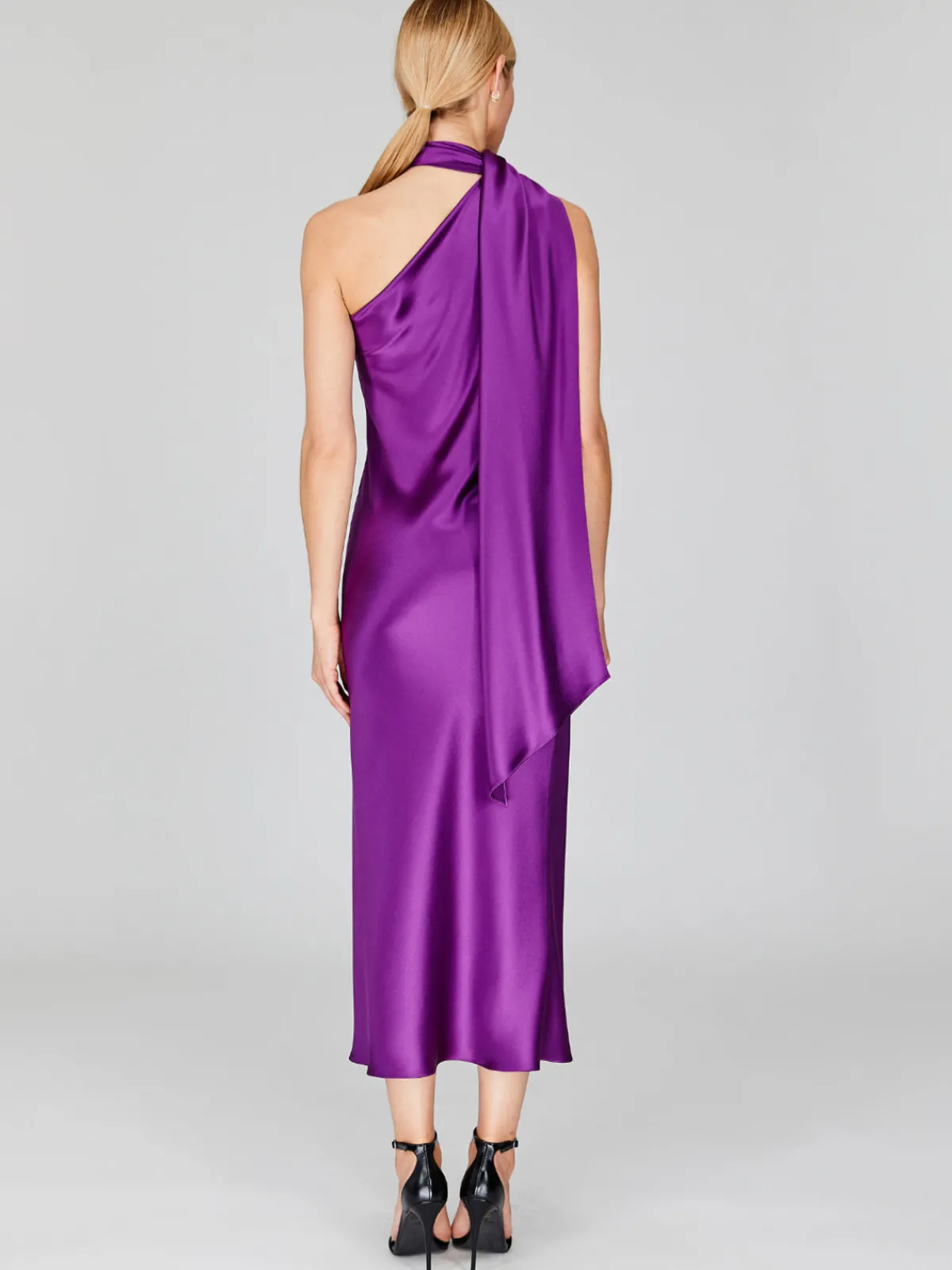 Our Mi Jong Lee Satin One Shoulder Bias Dress With Scarf in Pomegranate features a bias cut silhouette with a sleeveless one shoulder neckline, a midi length, and a scarf that can be draped down the back or wrapped around the neck. Handcrafted by artisans in our NYC atelier.