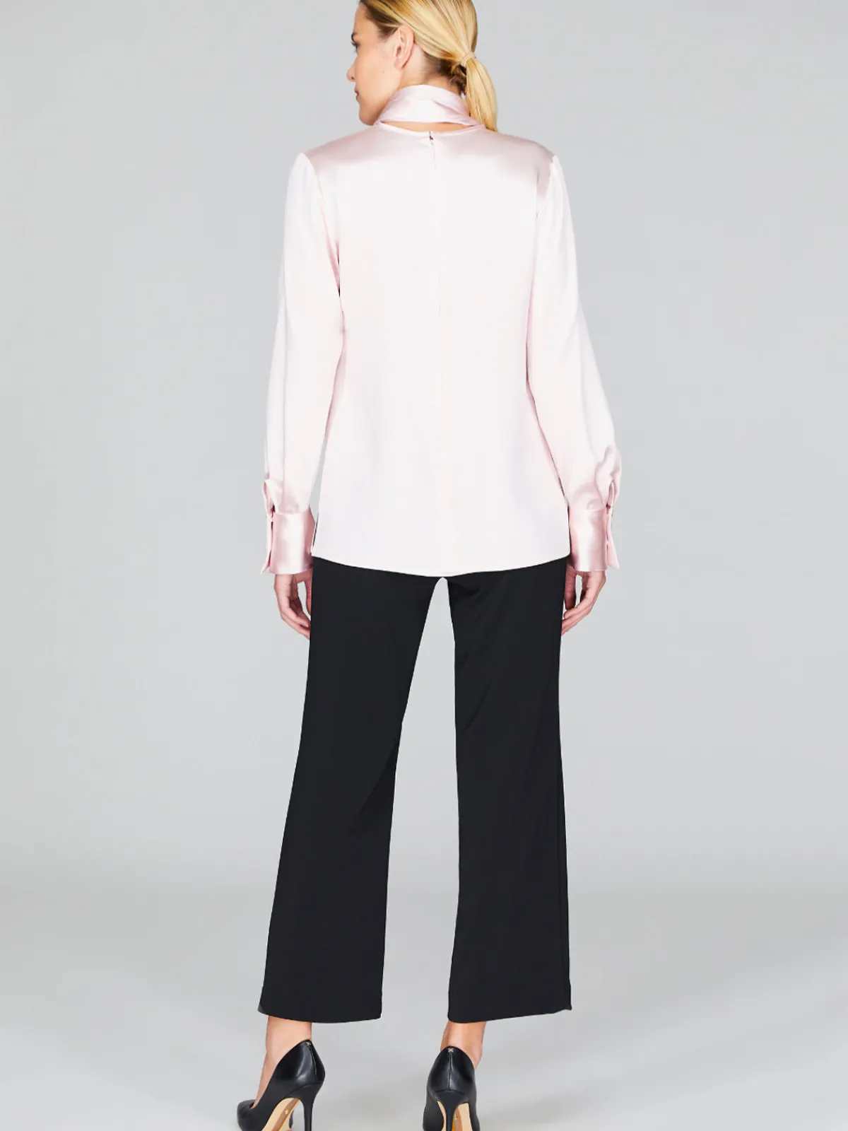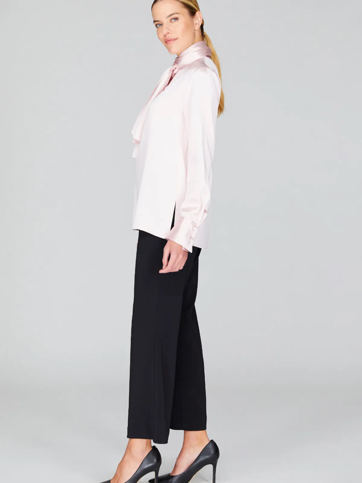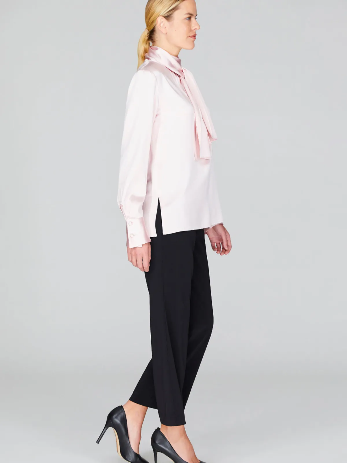Our Mi Jong Lee Satin Tie Neck Blouse With Relaxed Sleeves in Petal features long, loose sleeves with wide buttoned cuffs and a soft tie that can be draped around the neck or tied into a bow. Detailed with an invisible back zipper and a hook and eye closure. Handcrafted by artisans in our NYC atelier.