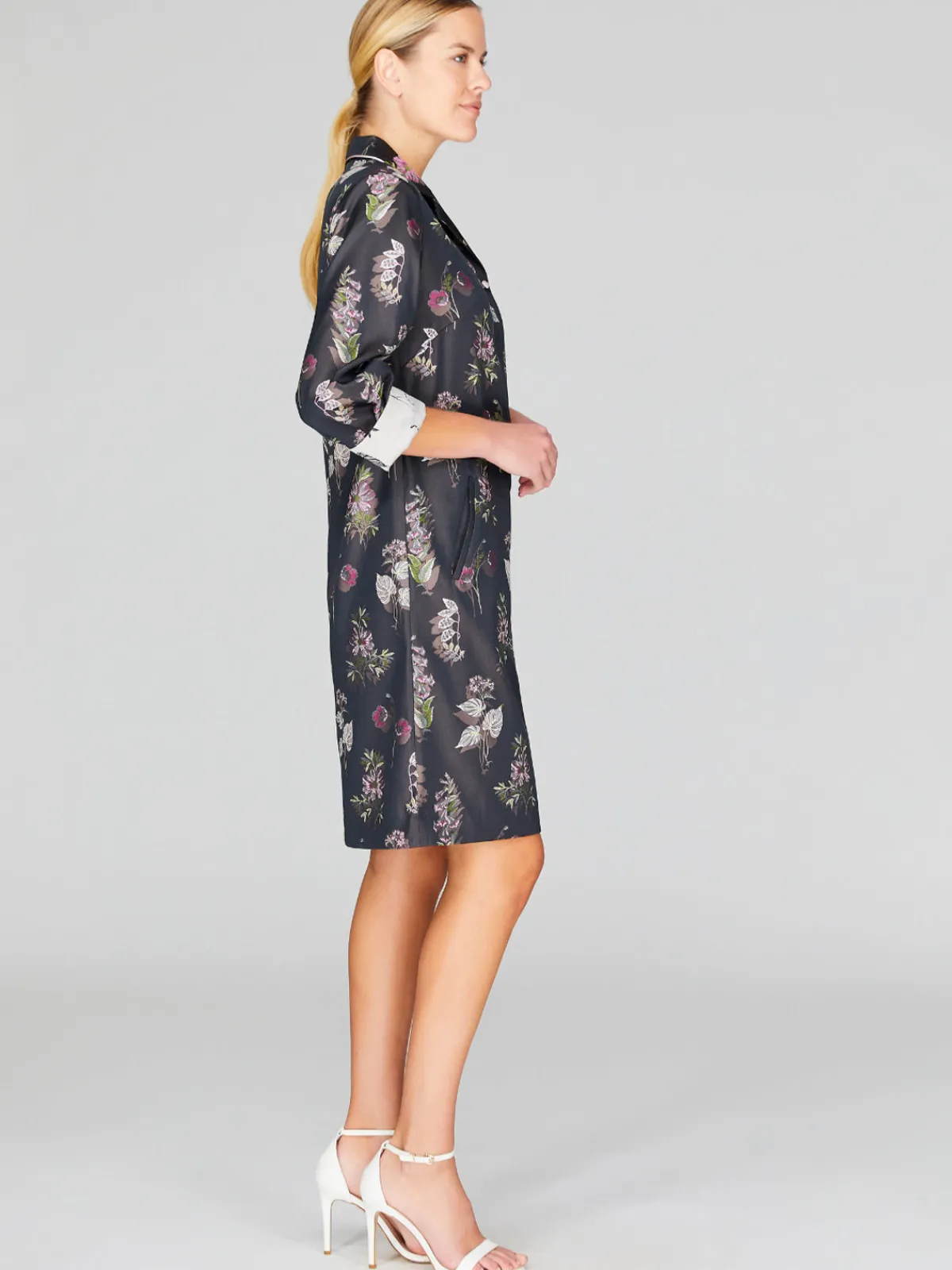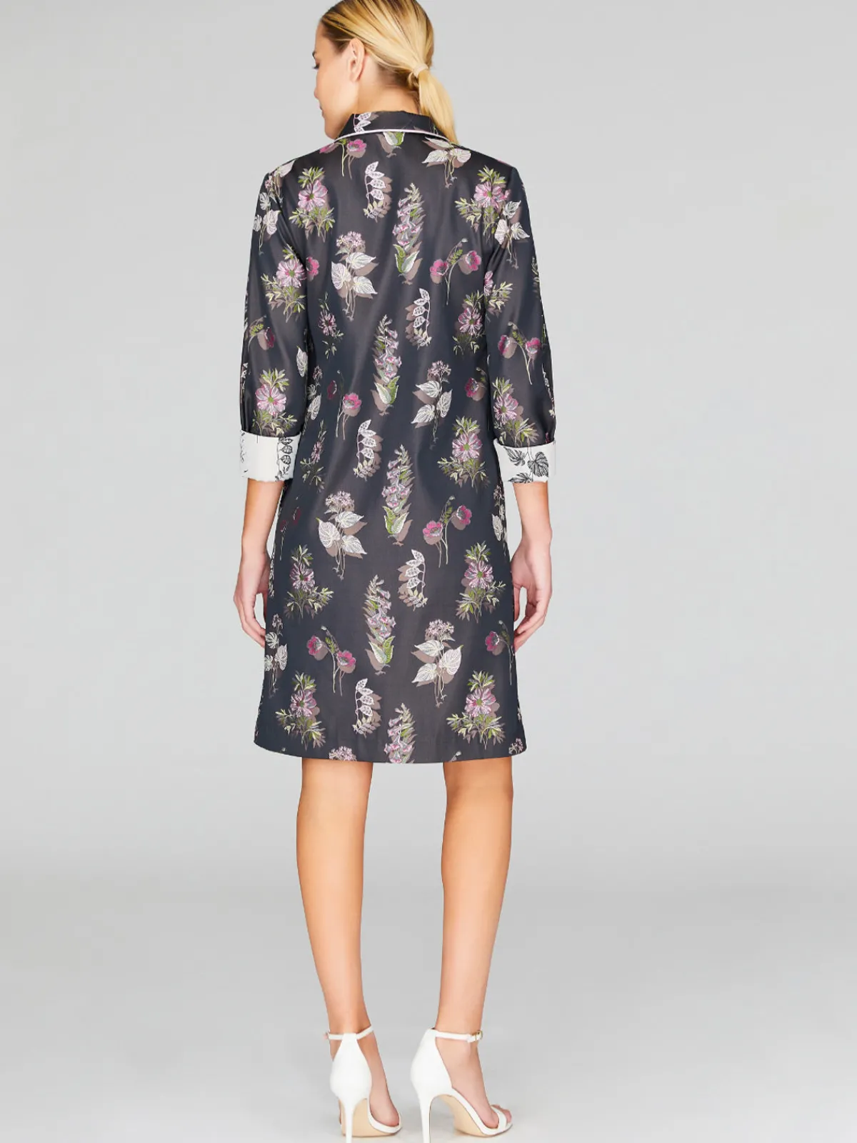 Our Mi Jong Lee Watercolor Botanic Collared Shirt Dress in Pink Combo boasts timeless style in a shift silhouette with a floral jacquard pattern, cuffed sleeves, a collar, side pockets, and a hidden button front placket. Handcrafted by artisans in our NYC atelier.