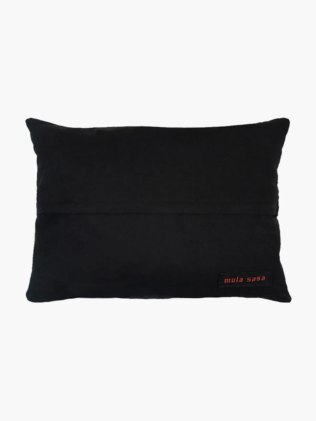 Our Mola Sasa Kuna Cushion in Black/Ivory/Ruby features a bold geometric pattern crafted using ancient techniques of hand-sewing cut layers of fabric. Finished with a zipper closure. Handcrafted by artisans in Colombia.