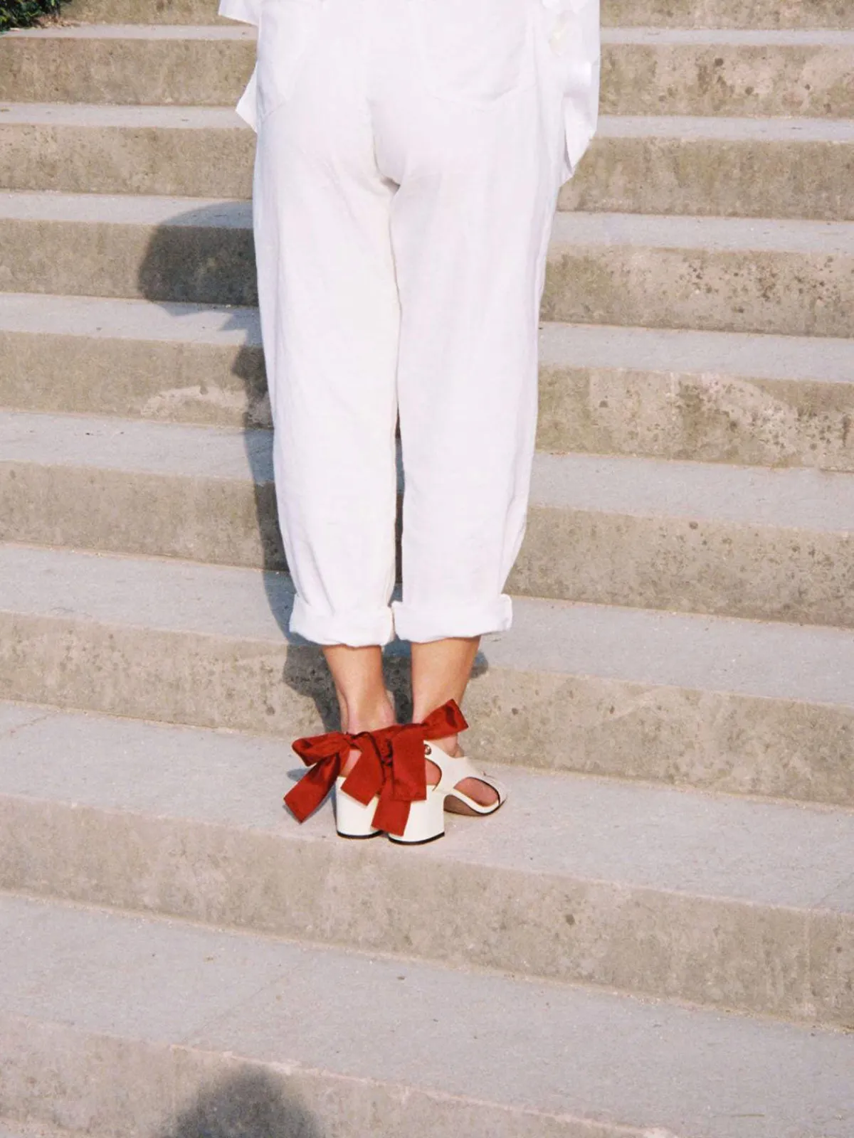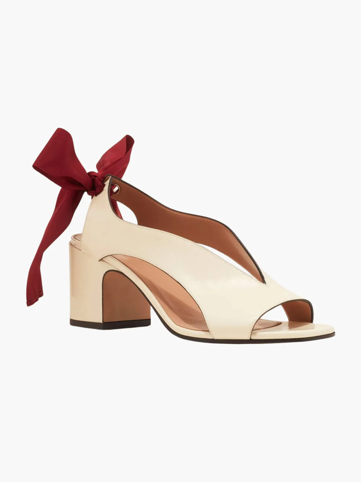 Our Nomasei Adora Sandal in White features an open toe design with a curved V-shape vamp, chunky stacked heels, and a silk ribbon that ties into a bow at the back of the ankle. Fleece-lined memory foam insoles provide all-day comfort. Handcrafted by artisans in Italy.
