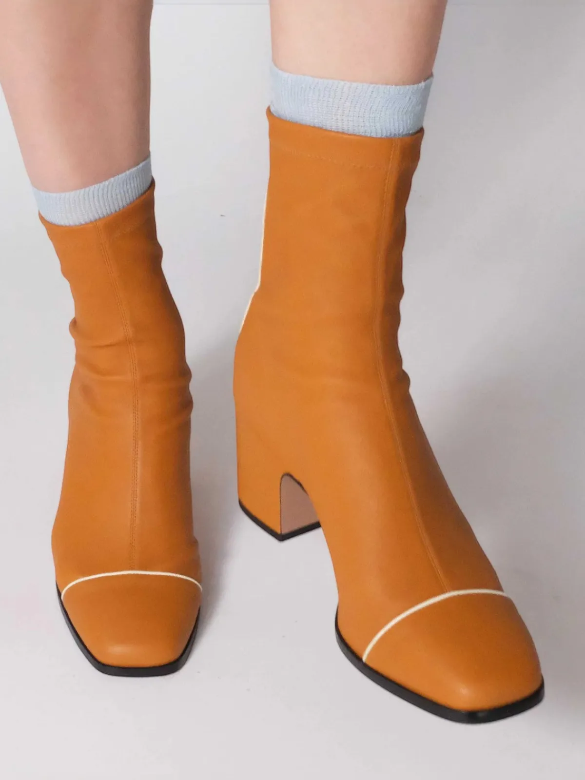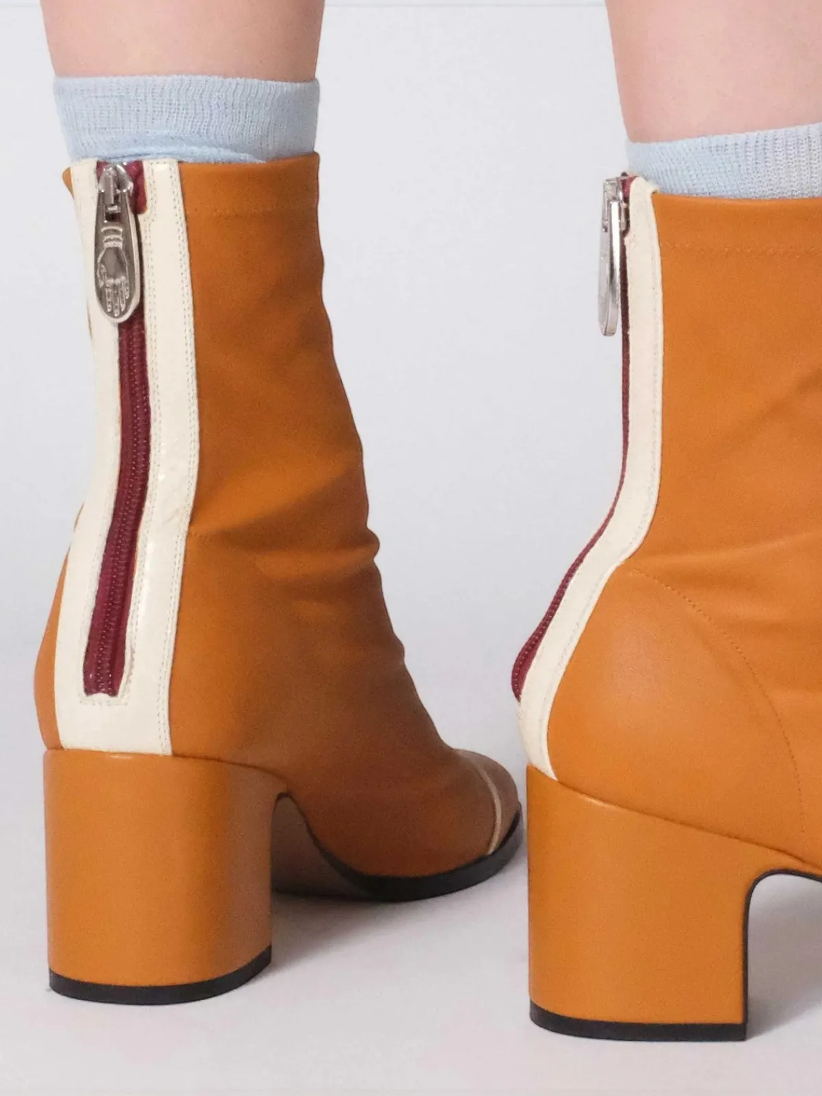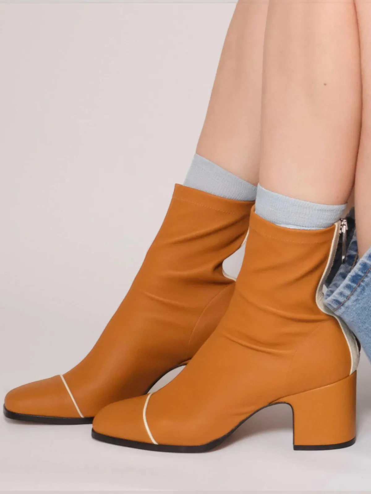 Our Nomasei Aria Ankle Boots in Ochre are cut to fit like a slim sock over the foot and ankle. They’re detailed with rounded toes, chunky heels, and a center back stripe with a back zipper closure. Lined insole with fleece and memory foam for added comfort. Handcrafted by artisans in Italy.
