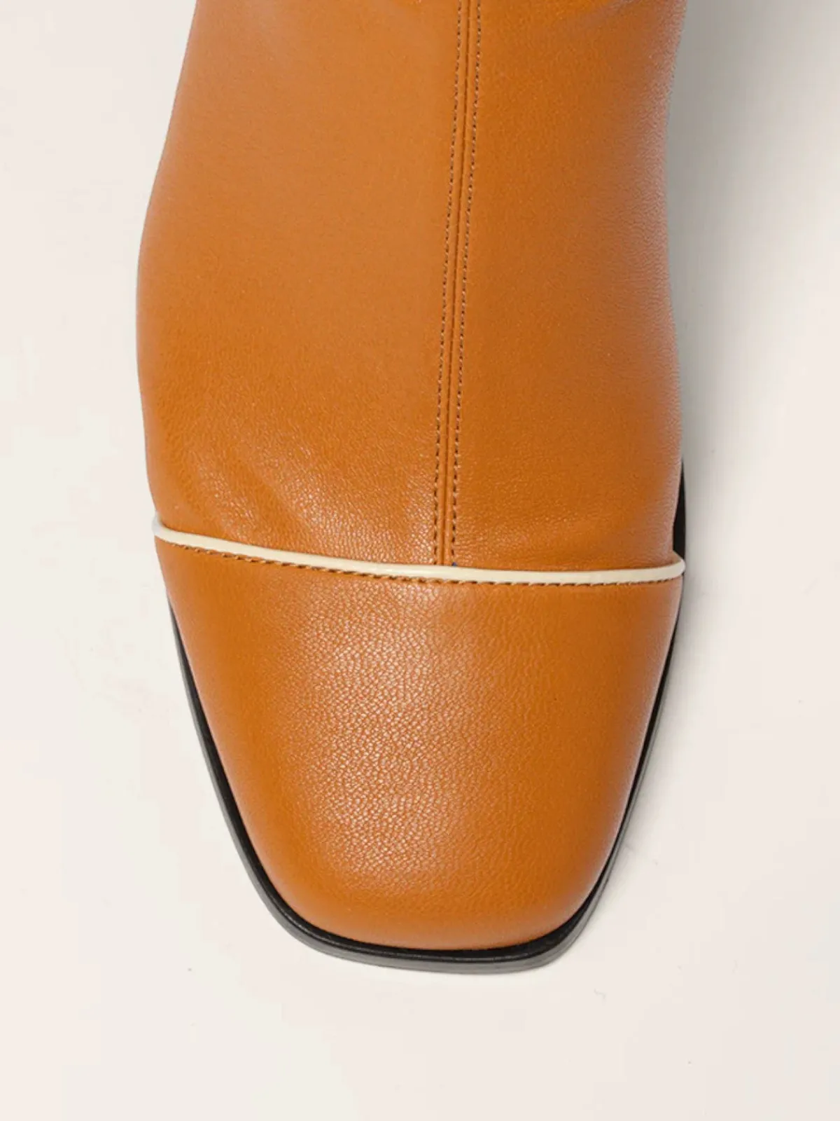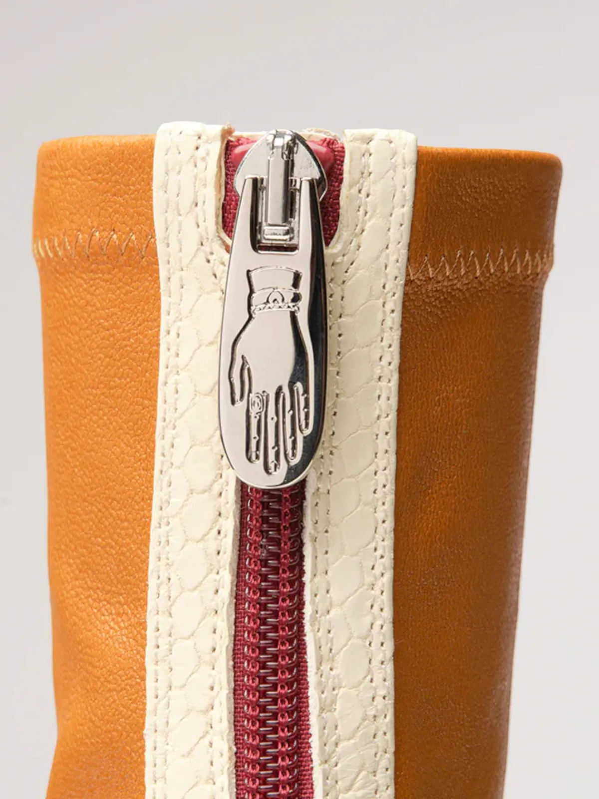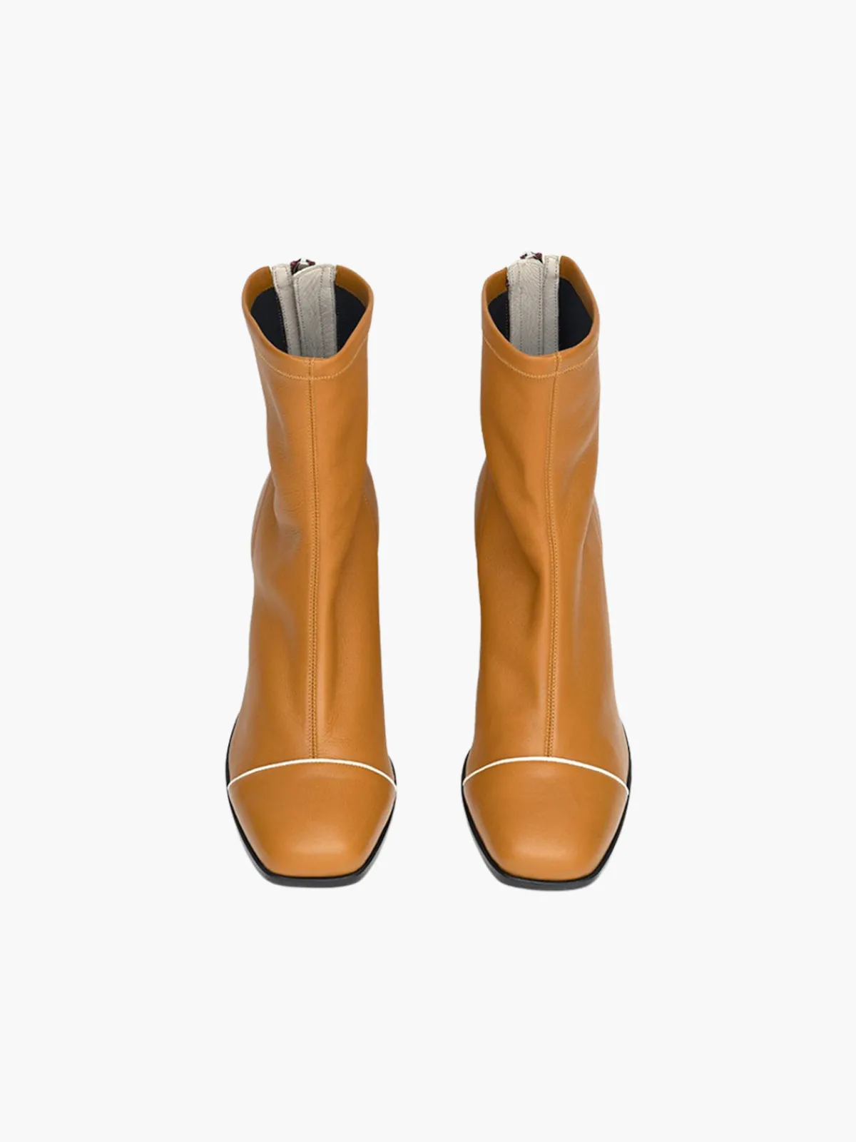 Our Nomasei Aria Ankle Boots in Ochre are cut to fit like a slim sock over the foot and ankle. They’re detailed with rounded toes, chunky heels, and a center back stripe with a back zipper closure. Lined insole with fleece and memory foam for added comfort. Handcrafted by artisans in Italy.
