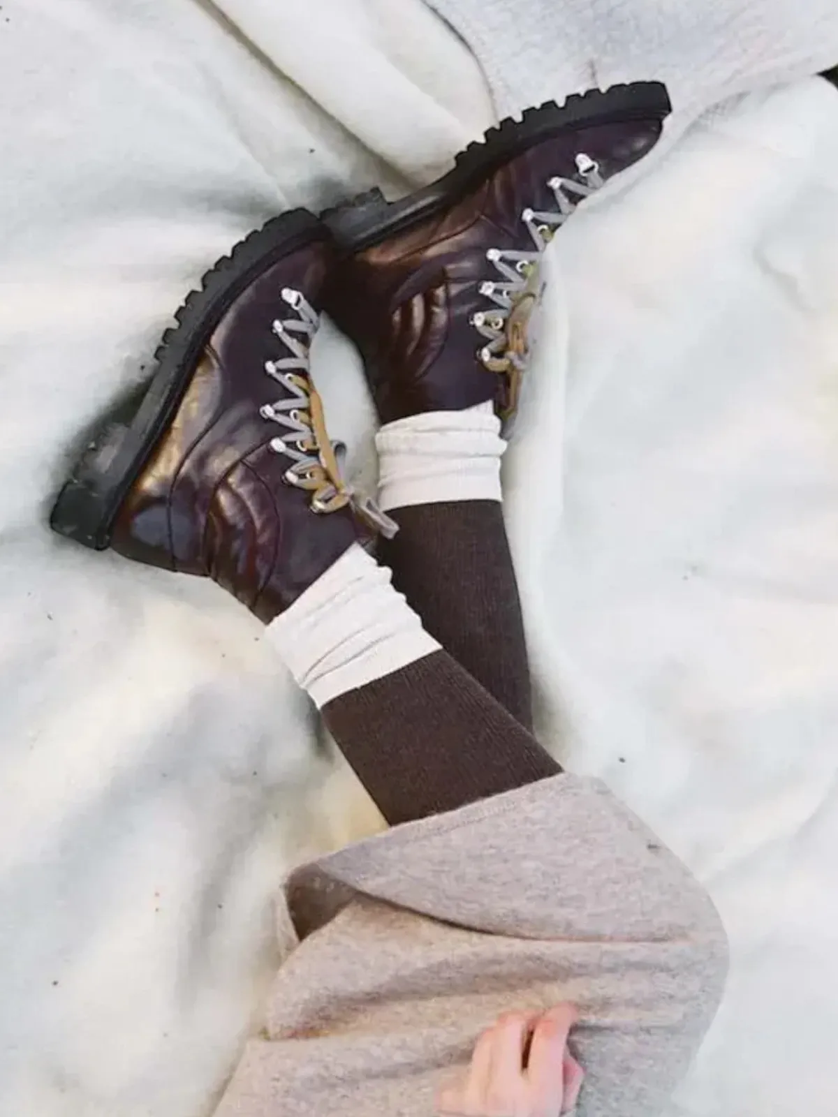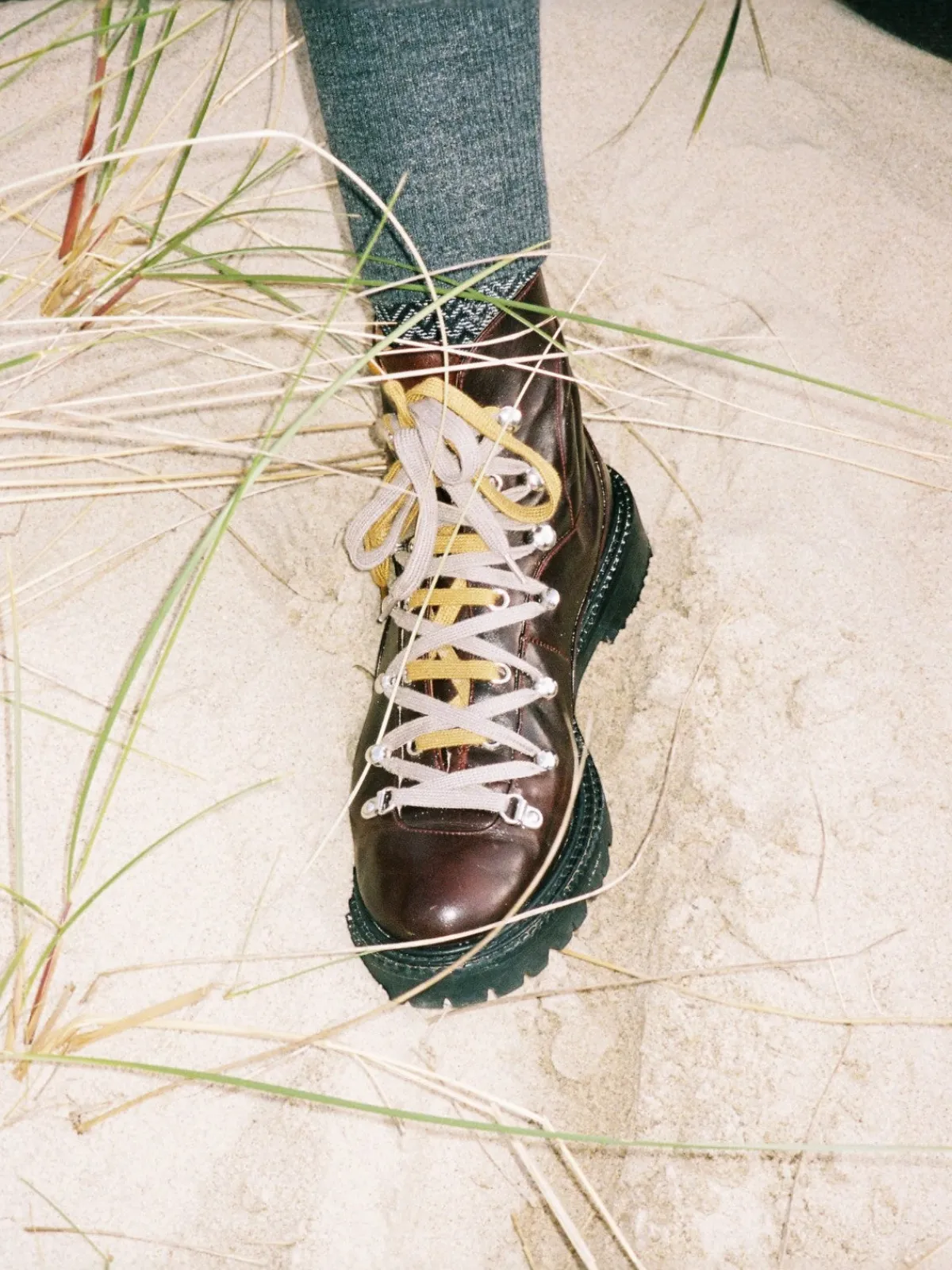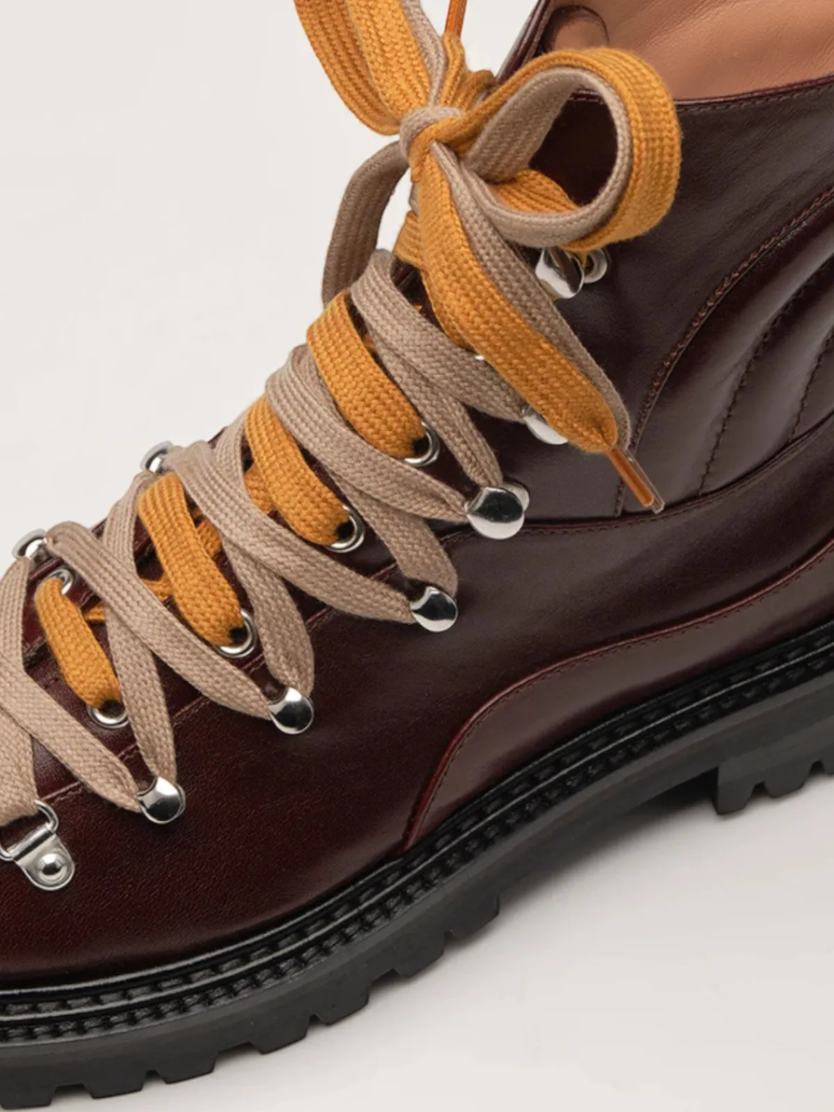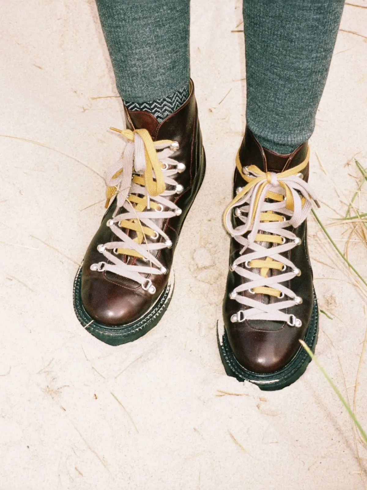 Our Nomasei Slalom Boots in Chestnut features a chunky silhouette with crisscross laces that tie in the front, round toes, stitched details, and rubber and leather outsoles. They’re detailed with a fleece-lined insole with memory foam and cut slightly wide for wearing with thick socks. Handcrafted by artisans in Italy.
