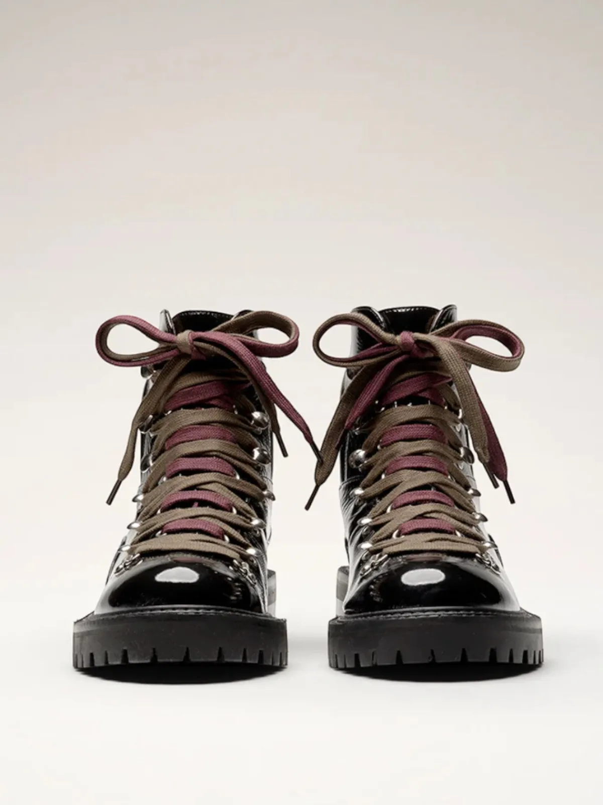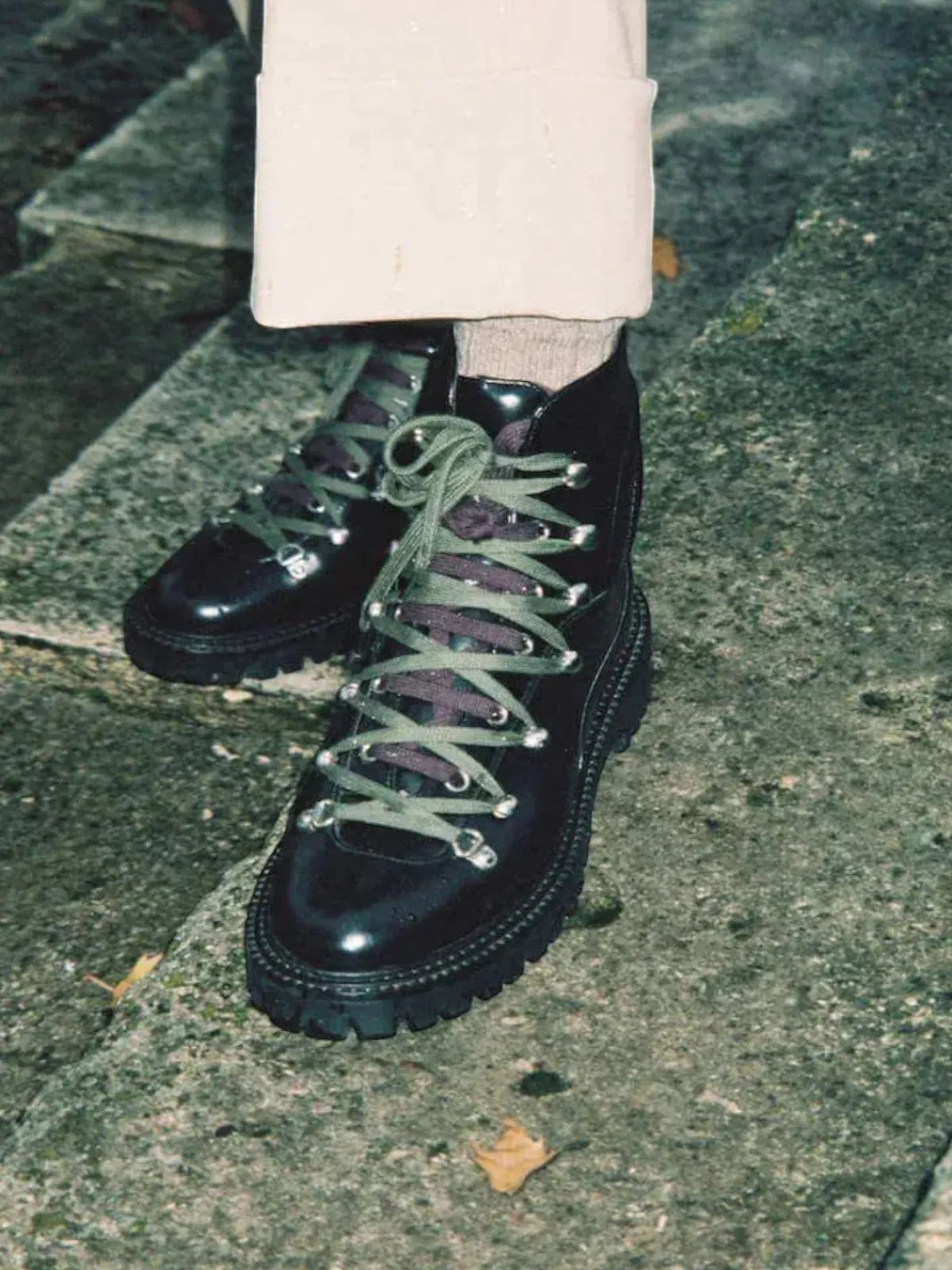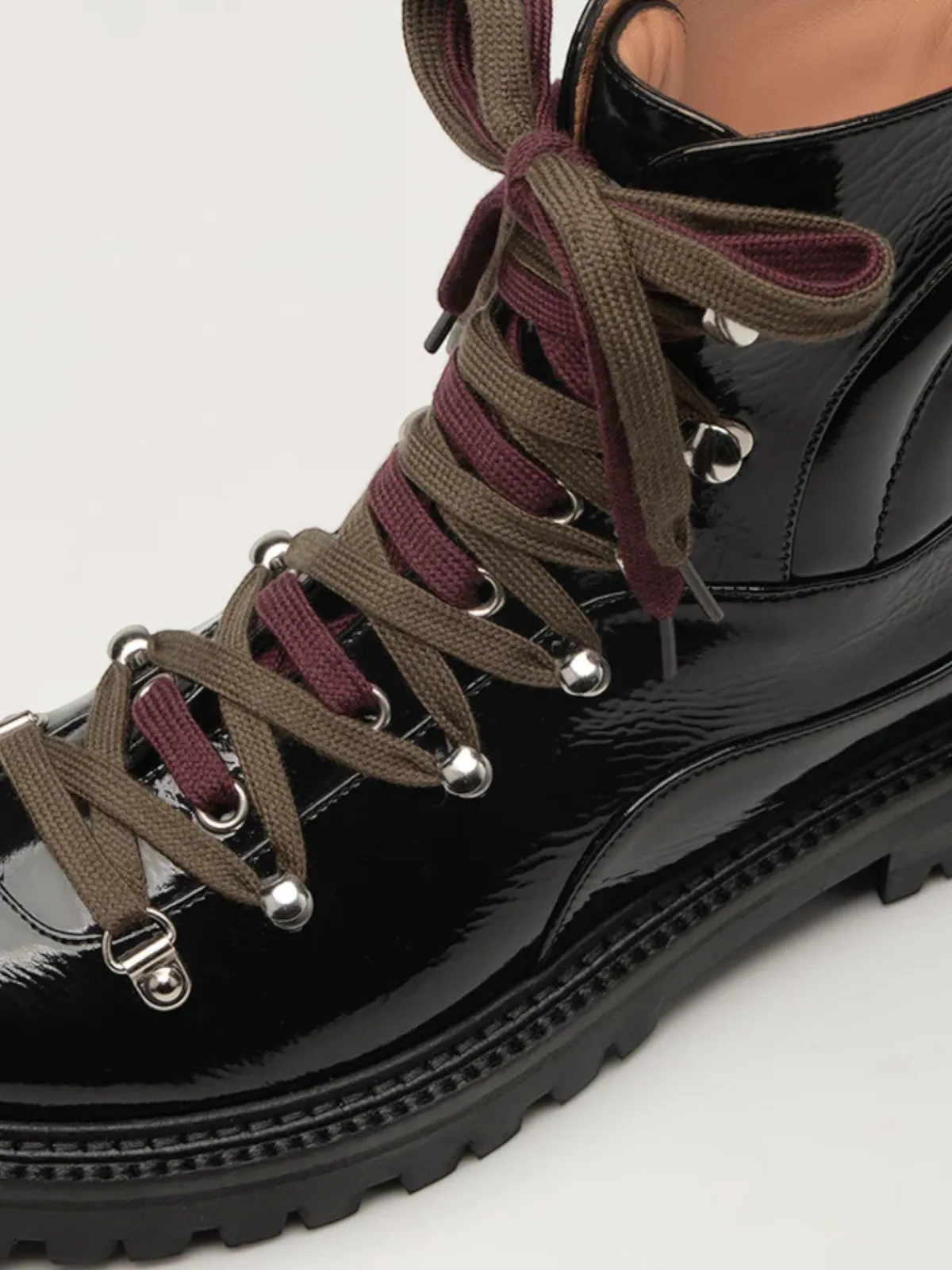 Our Nomasei Slalom Boots in Black Semi Patent Calfskin features a chunky silhouette with crisscross laces that tie in the front, round toes, stitched details, and rubber and leather outsoles. They’re detailed with a fleece-lined insole with memory foam and cut slightly wide for wearing with thick socks. Handcrafted by artisans in Italy.