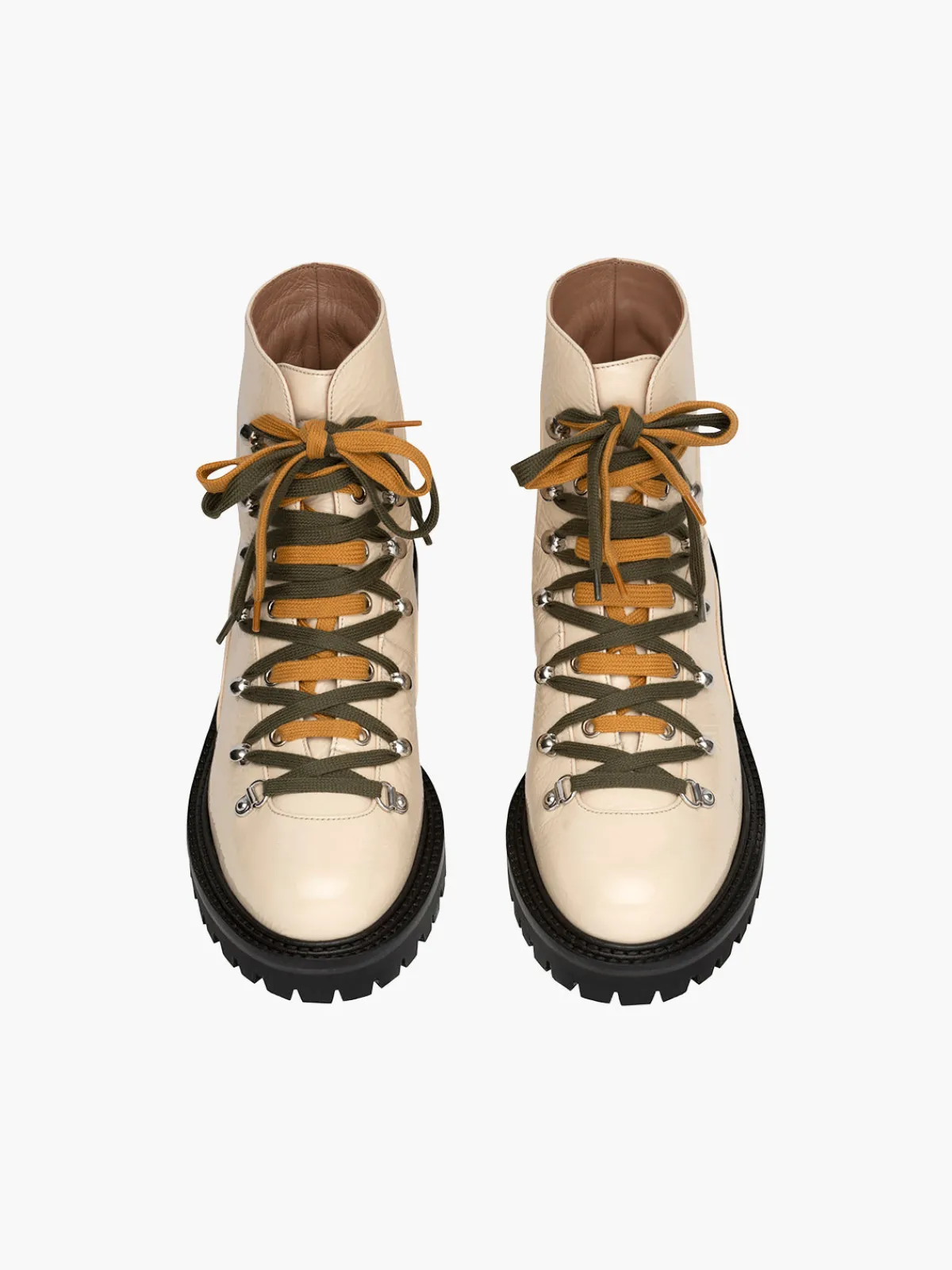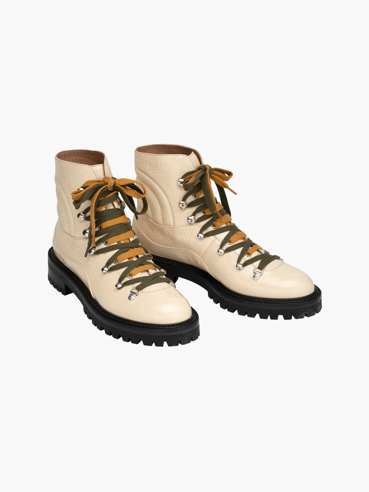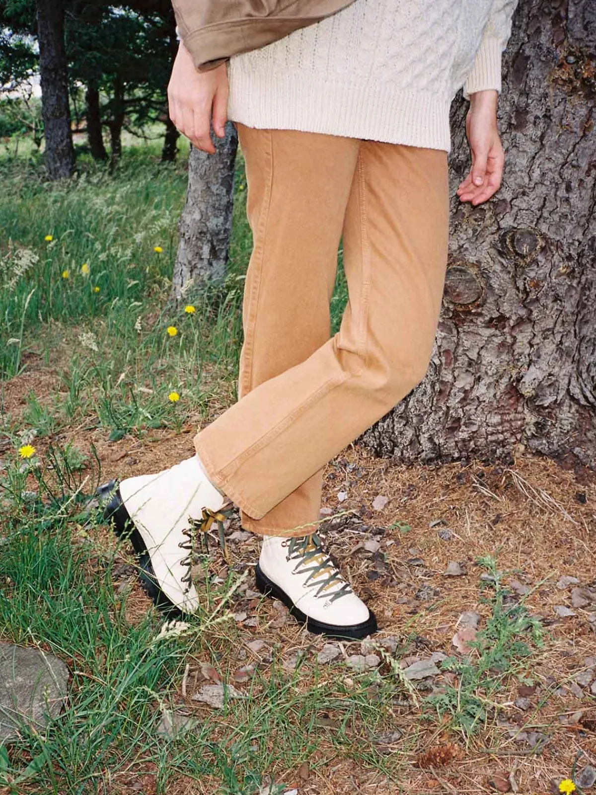 Our Nomasei Slalom Boots in White features a chunky silhouette with crisscross laces that tie in the front, round toes, stitched details, and rubber and leather outsoles. They’re detailed with a fleece-lined insole with memory foam and cut slightly wide for wearing with thick socks. Handcrafted by artisans in Italy.