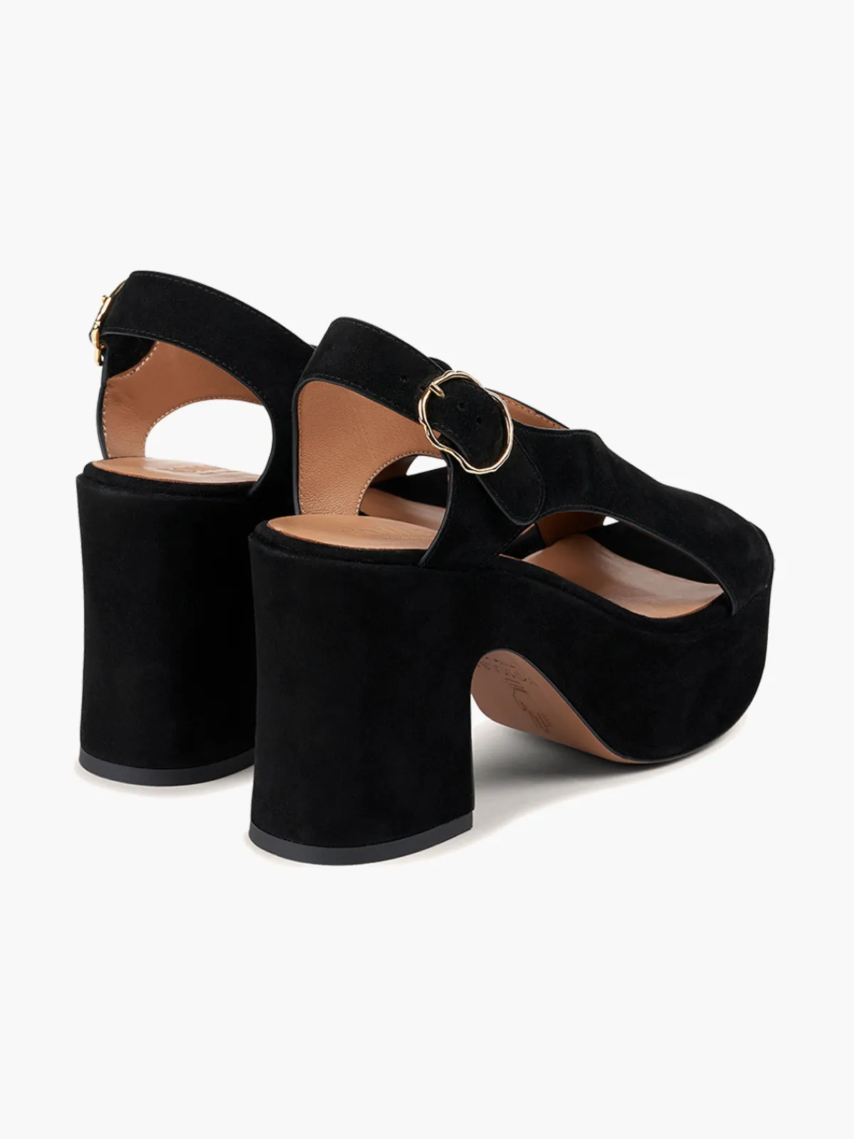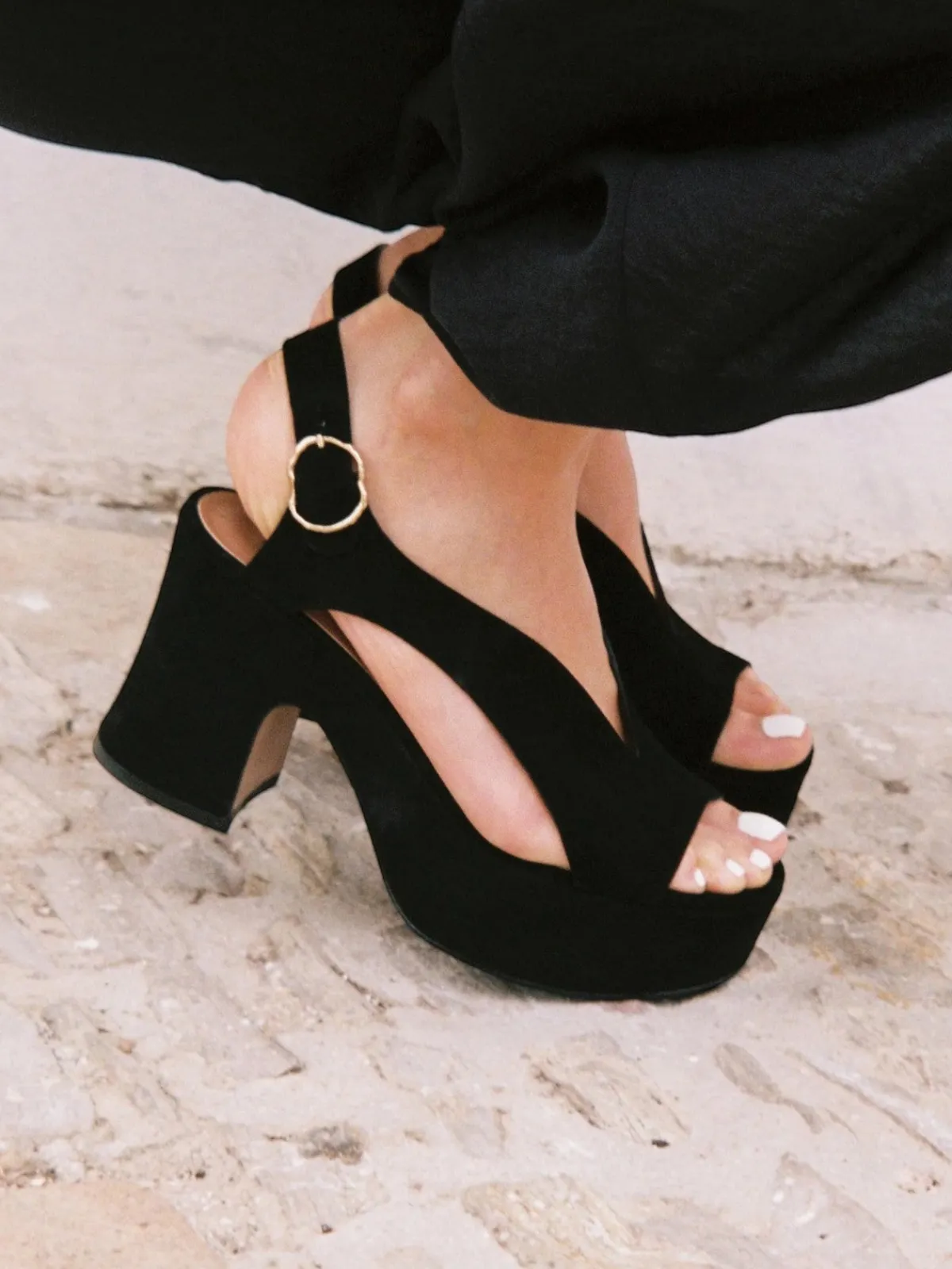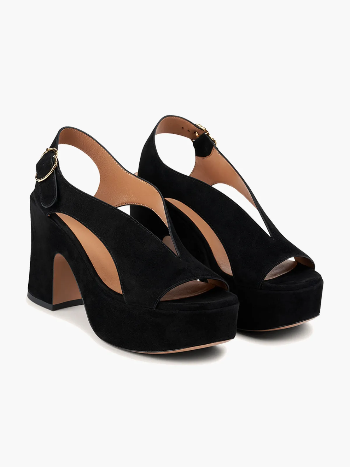 Our Nomasei Taxi Sandals in Black Suede boast style and comfort in a low-impact design with a 4.5cm arch, a thick block heel, open toes, and a brass buckle accent. Handcrafted by artisans in Italy.