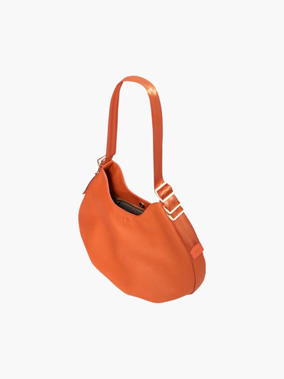Our Nora Lozza Bubble Bag in Orange is an exquisite bag crafted with a magnetic metallic clasp, finished in a luxurious golden hue. Its thoughtfully designed interior boasts multiple compartments, including a zippered pocket and a dedicated cellphone pocket, ensuring effortless organization. The adjustable strap, made from matching fabric, offers a comfortable shoulder fit, while the soft suede lining enhances its refined elegance, making this bag the perfect complement to any sophisticated look. Handcrafted by artisans in Colombia.