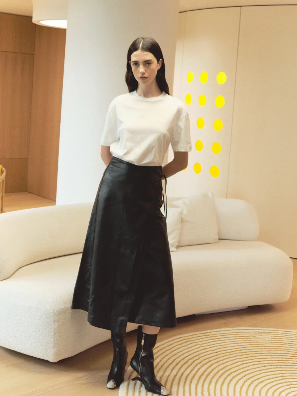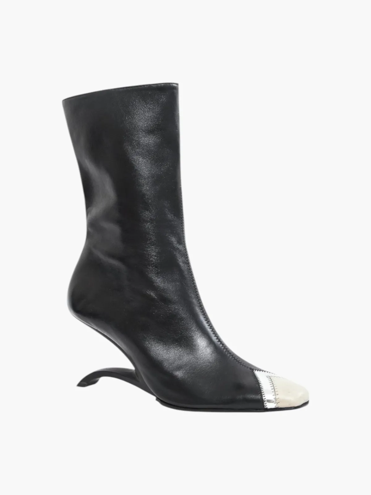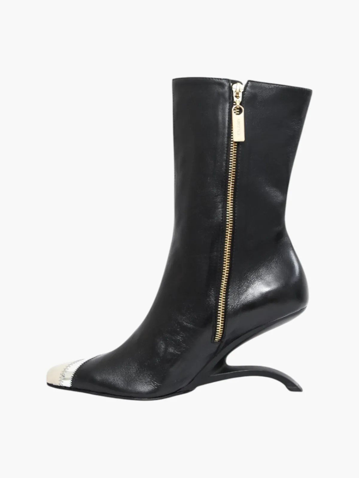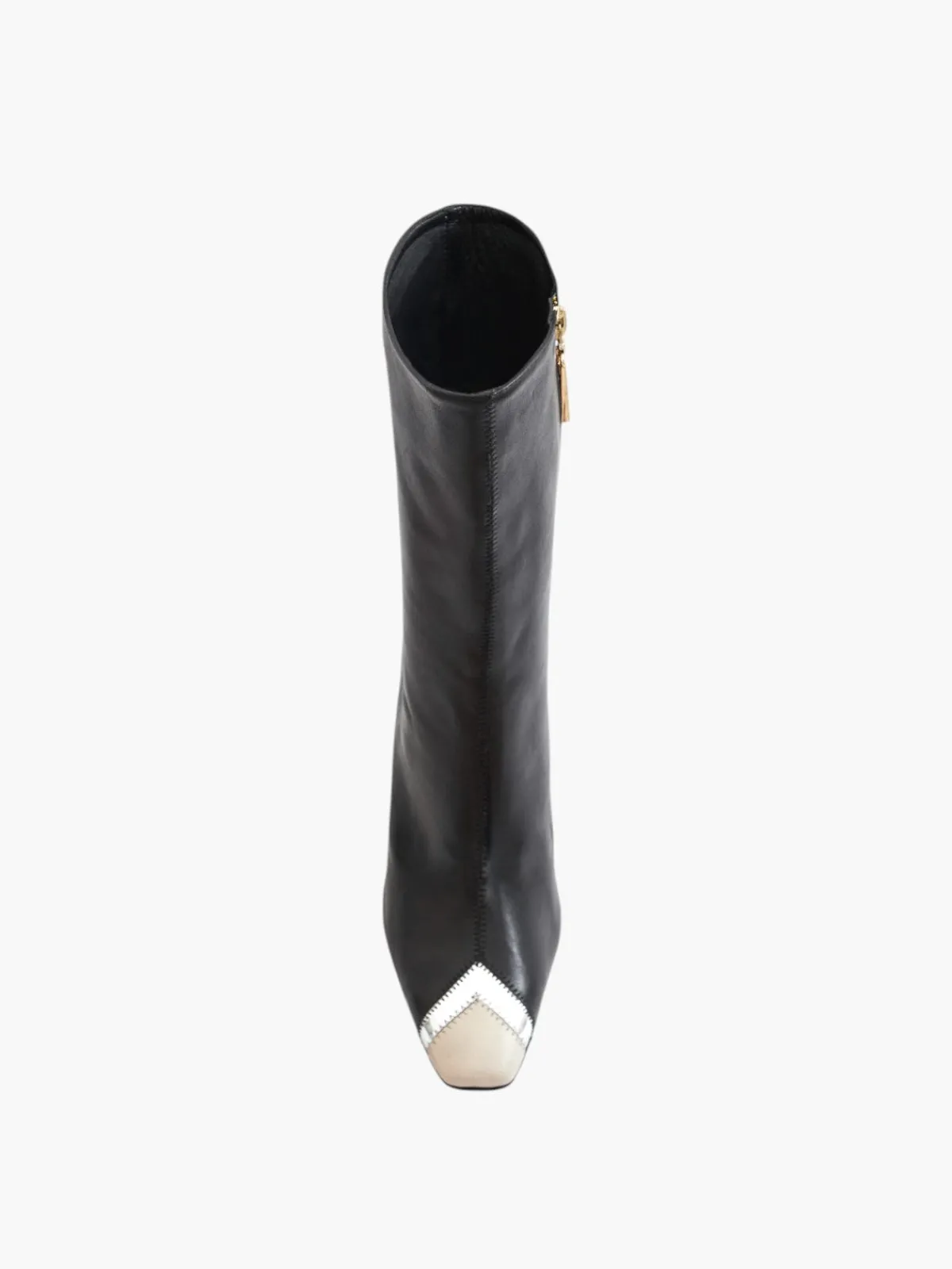 Our Nora Lozza Cosmos Boot in Black is a mid-calf leather boot, where opulent PW leather is elegantly paired with reflective silver mirror leather, creating a striking and bold contrast. A metallic zipper with a refined gold-tone finish runs along the side, enhancing the design with a touch of sophistication, while a discreet gold logo at the top adds a subtle yet luxurious detail. Set upon a V-shaped heel, these boots are lined with the finest badana leather, ensuring both comfort and timeless elegance with every step. Handcrafted by artisans in Colombia.