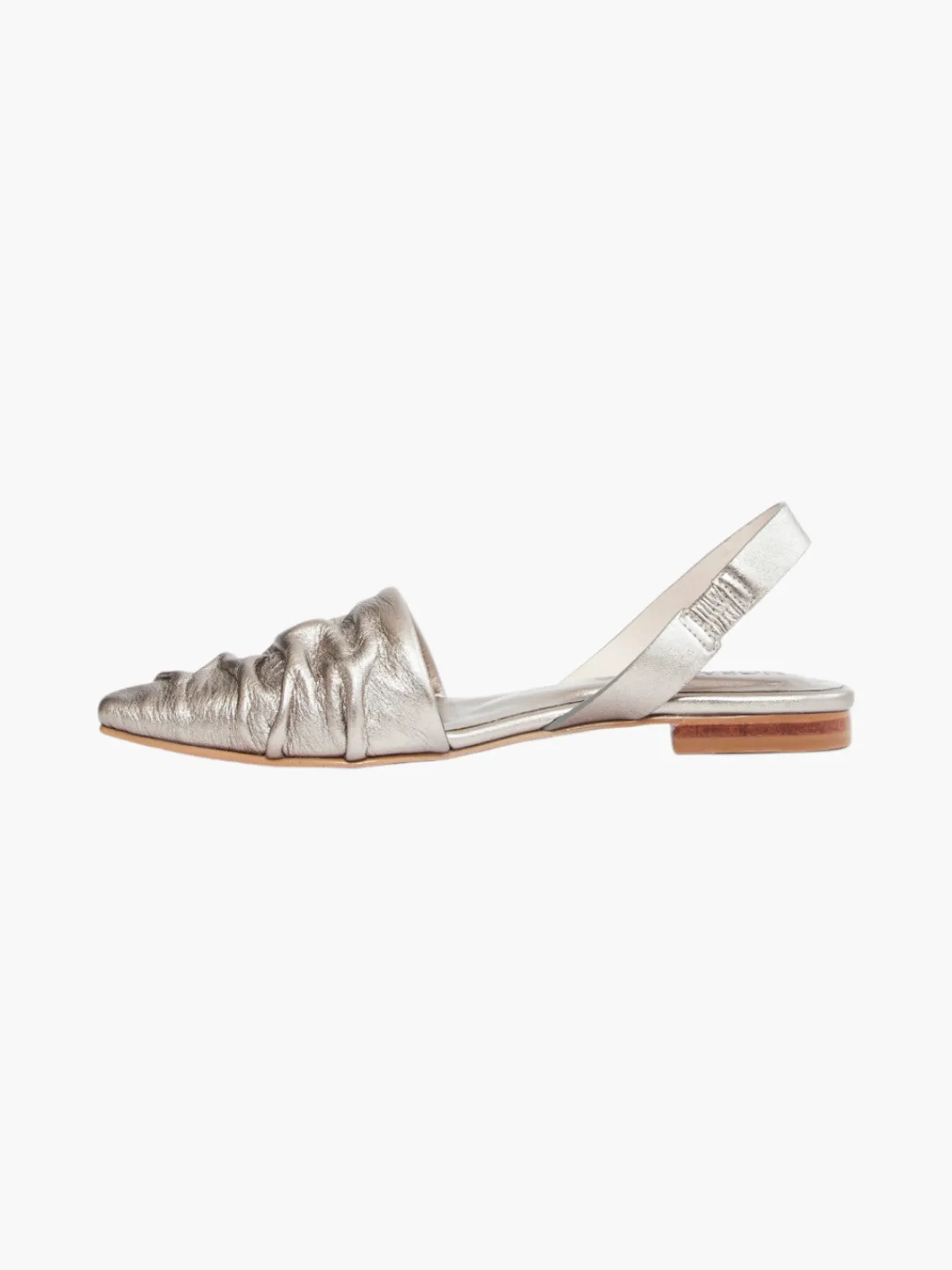 Our Forma Ballerina in Silver is crafted from luxurious silver leather, these ballerina flats feature a chic pointed toe and a wide, adjustable heel secured with elastic for a flawless fit. Lined with soft natural suede for enhanced comfort, and set upon a refined 1.5 cm heel, these shoes effortlessly combine sophisticated style with practical elegance, making them ideal for any occasion. Handcrafted by artisans in Colombia.