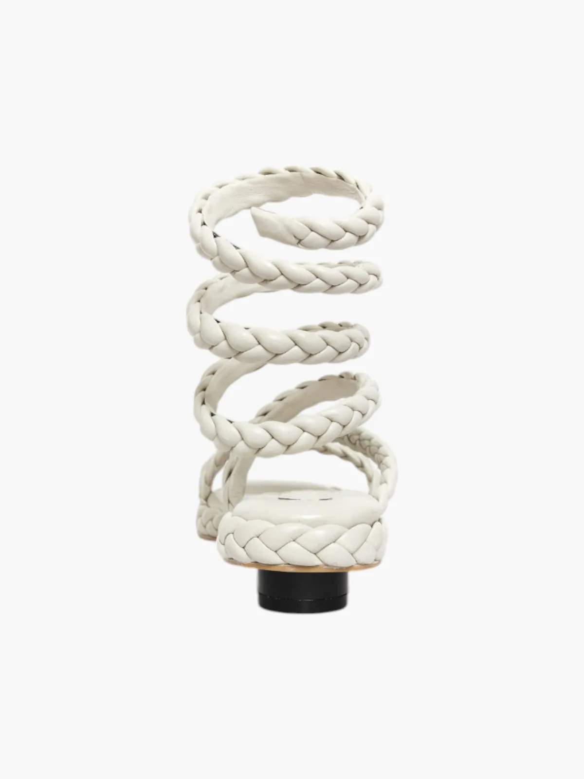 Our Nora Lozza Maya Sandal in White is a chic wrap-around ankle flat crafted from intricately woven leather braids that encircle the sandal, offering a refined yet effortless design. The ultra-comfortable padded sole ensures all-day wearability, making it the perfect combination of style and comfort. Ideal for summer events and vacation outings, this leather sandal features a slinky ankle strap and decorative stitching that adds a touch of sophistication. Resting on a 2.5 cm cylindrical heel, it provides just the right amount of elevation without compromising on ease. Handcrafted by female artisans in Colombia.