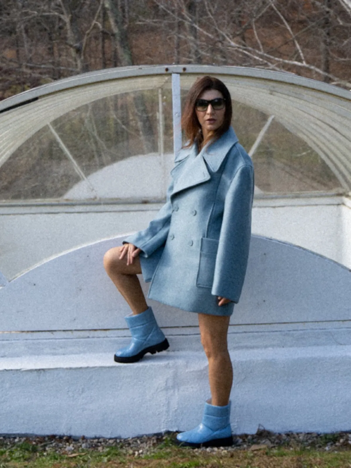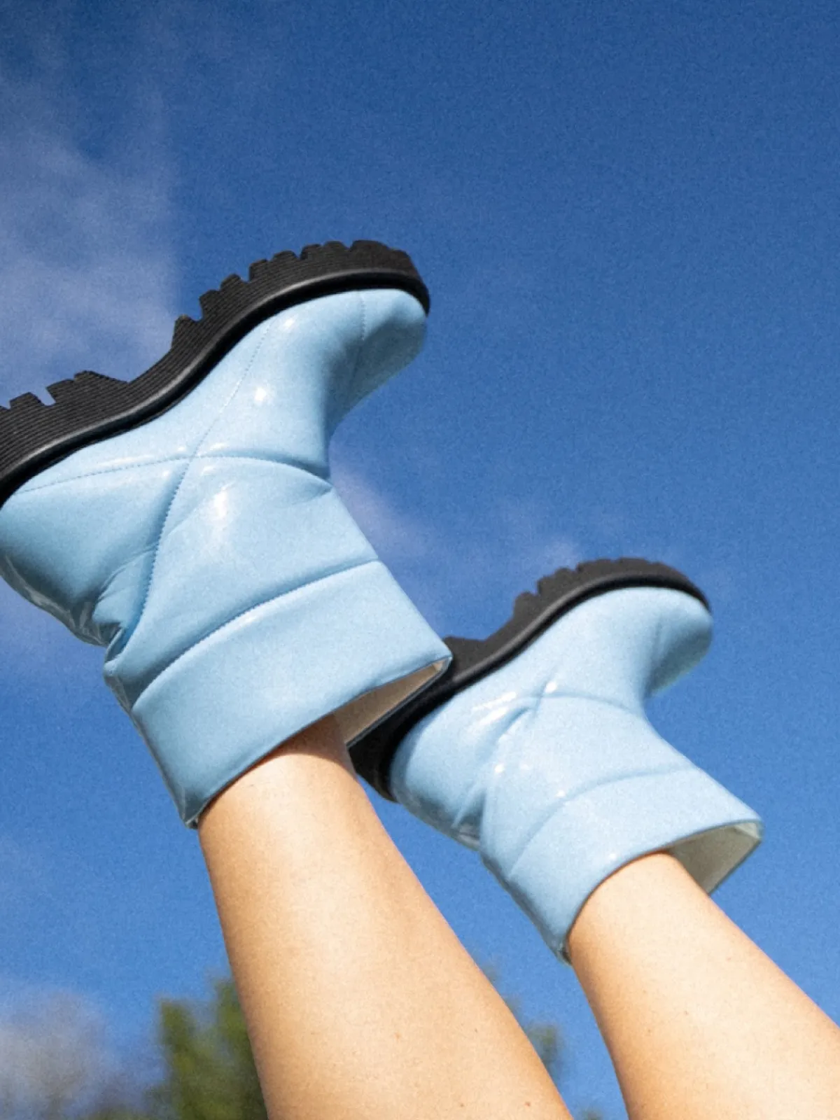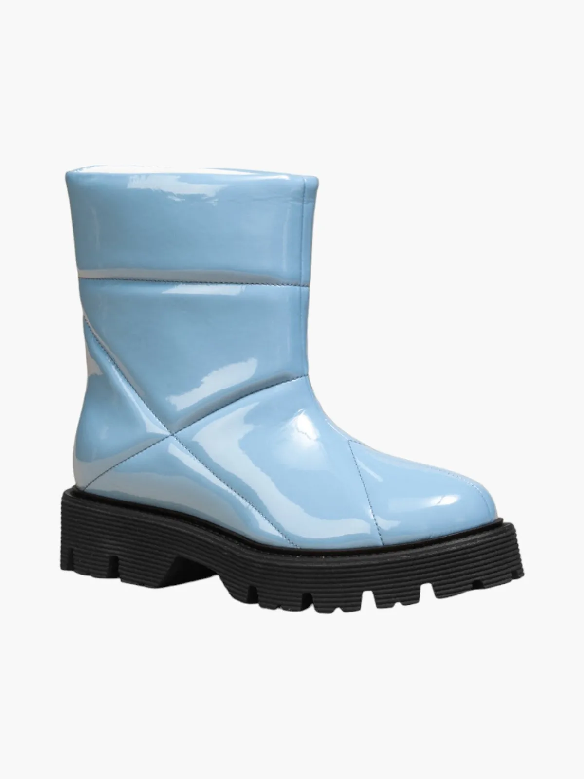 Our O2 Monde Damu Boot in Azure Patent is a pull-on bootie was crafted from aquilted water-resistant vegan patent and a lug-sole for comfort.Handcrafted by artisans in Italy.