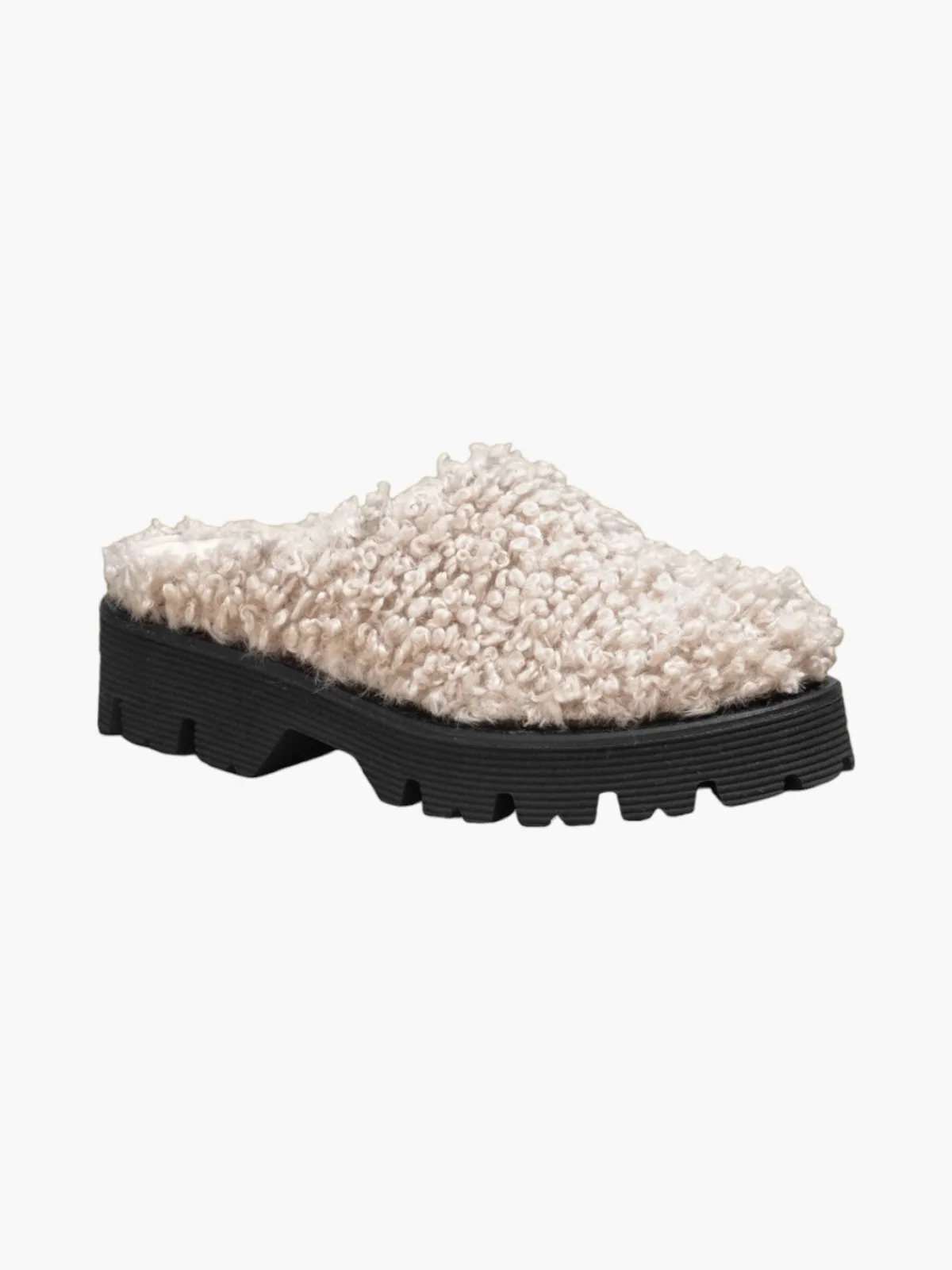 Our O2 Monde Hebo Mule Shearling in Beige is a cozy slip on shearling mule. This mule features a slight platform with grip so you can wear them outside of the house.Handcrafted by artisans in Italy.