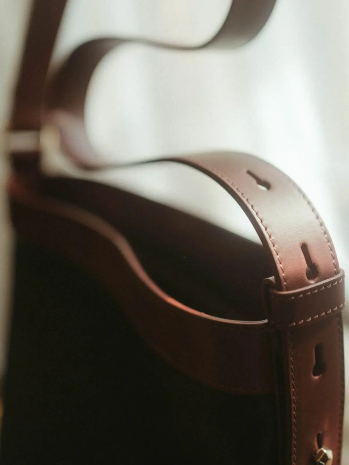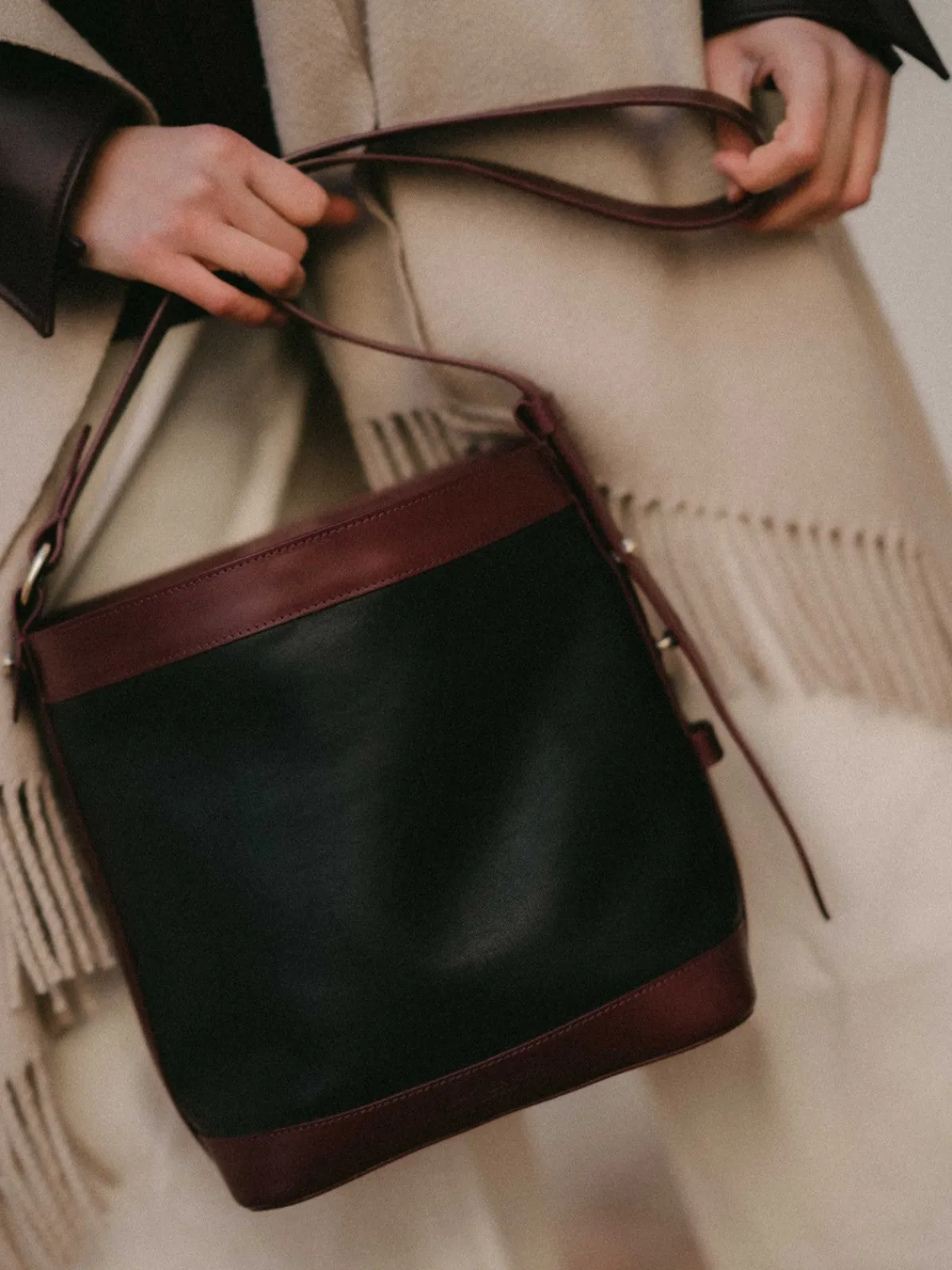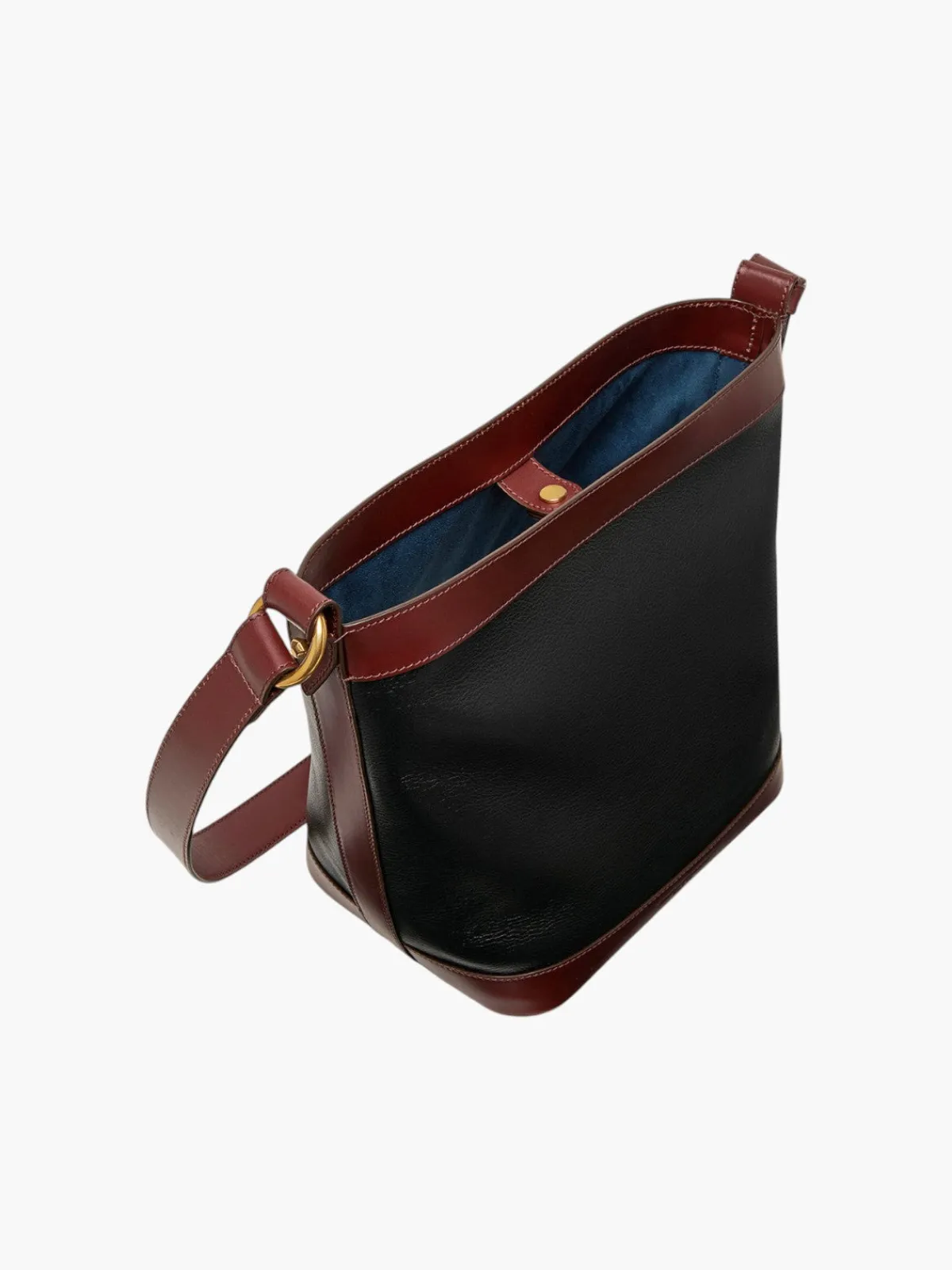 Our ODP Collection Medium Bucket Bag in Black Mogano is a leather bucket bag featuring a brown leather trim. The bag has gold tone hardware and an adjustable shoulder strap so it can be worn as a crossbody. The bag fits a wallet, phone, and other essentials. Handcrafted by artisans in Italy.