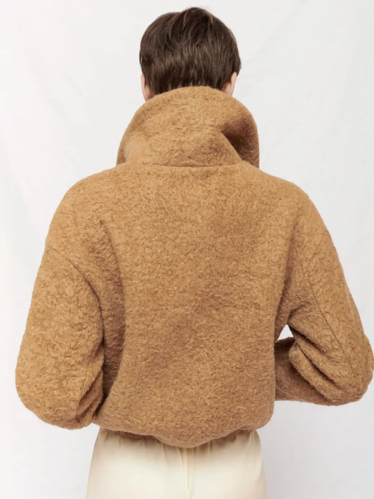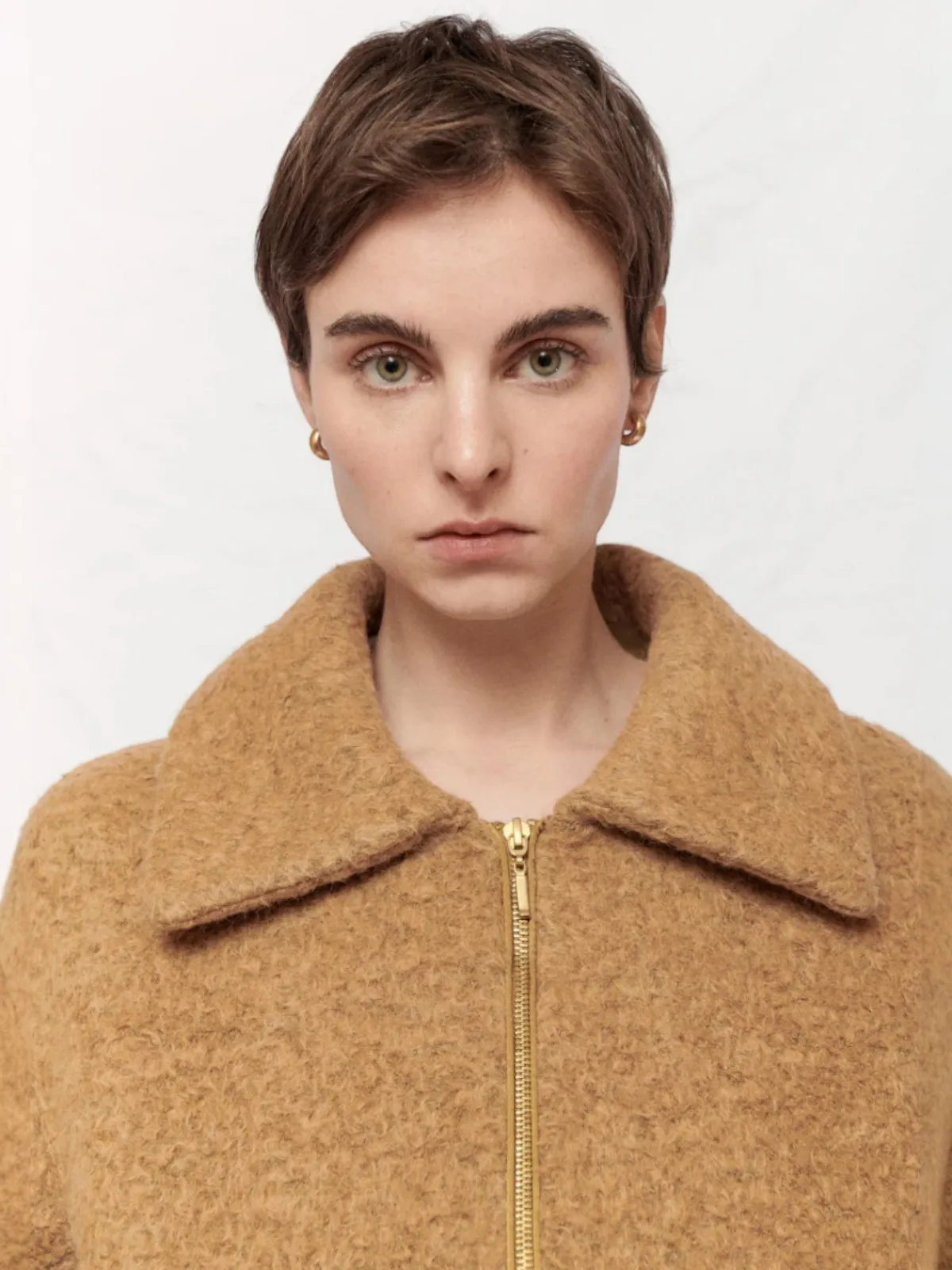 Our Olistic Kyo Bomberis a refined sportswear-inspired short bomber jacket, crafted from a blend of upcycled wool and luxurious llama fiber. It is thoughtfully designed with two functional pockets, complemented by a gold zipper and collar, adding a touch of elegance to its athletic aesthetic. Handcrafted by artisans in Portugal.
