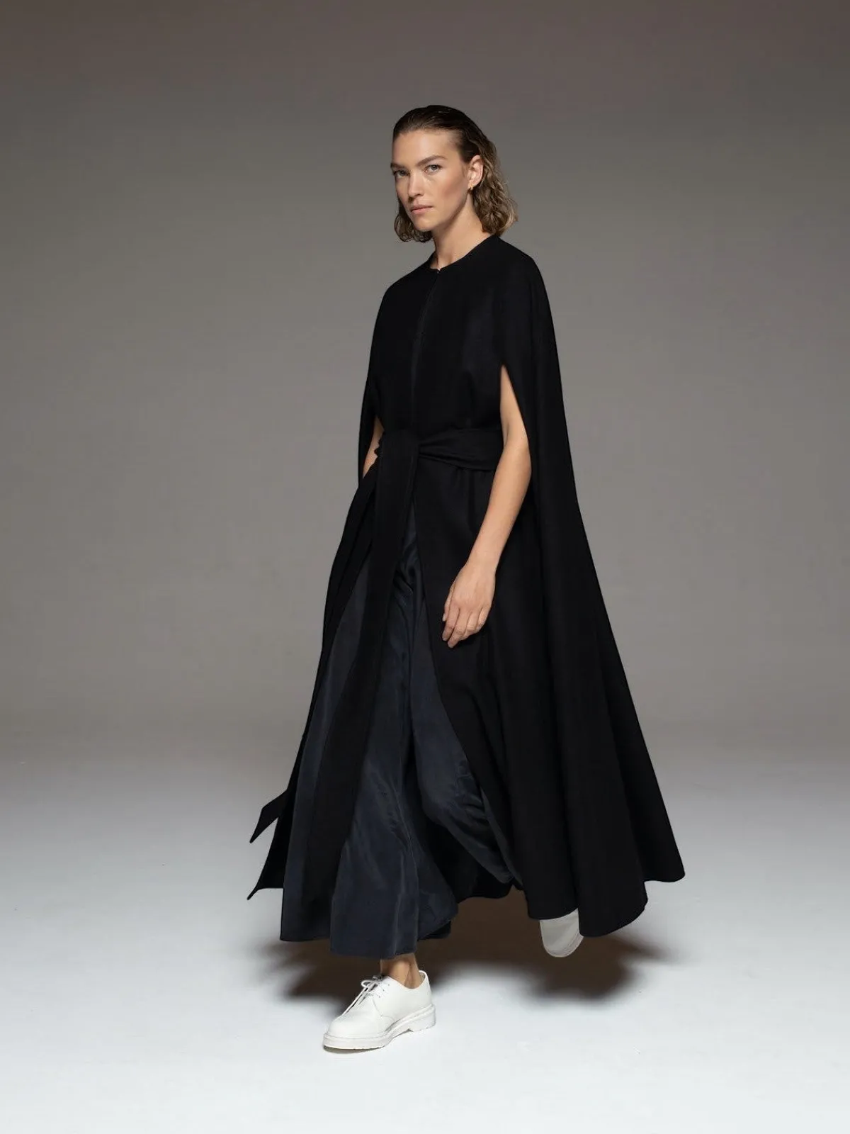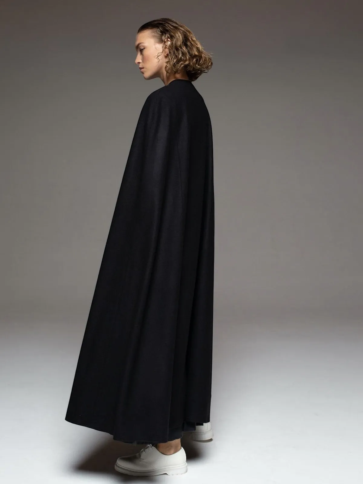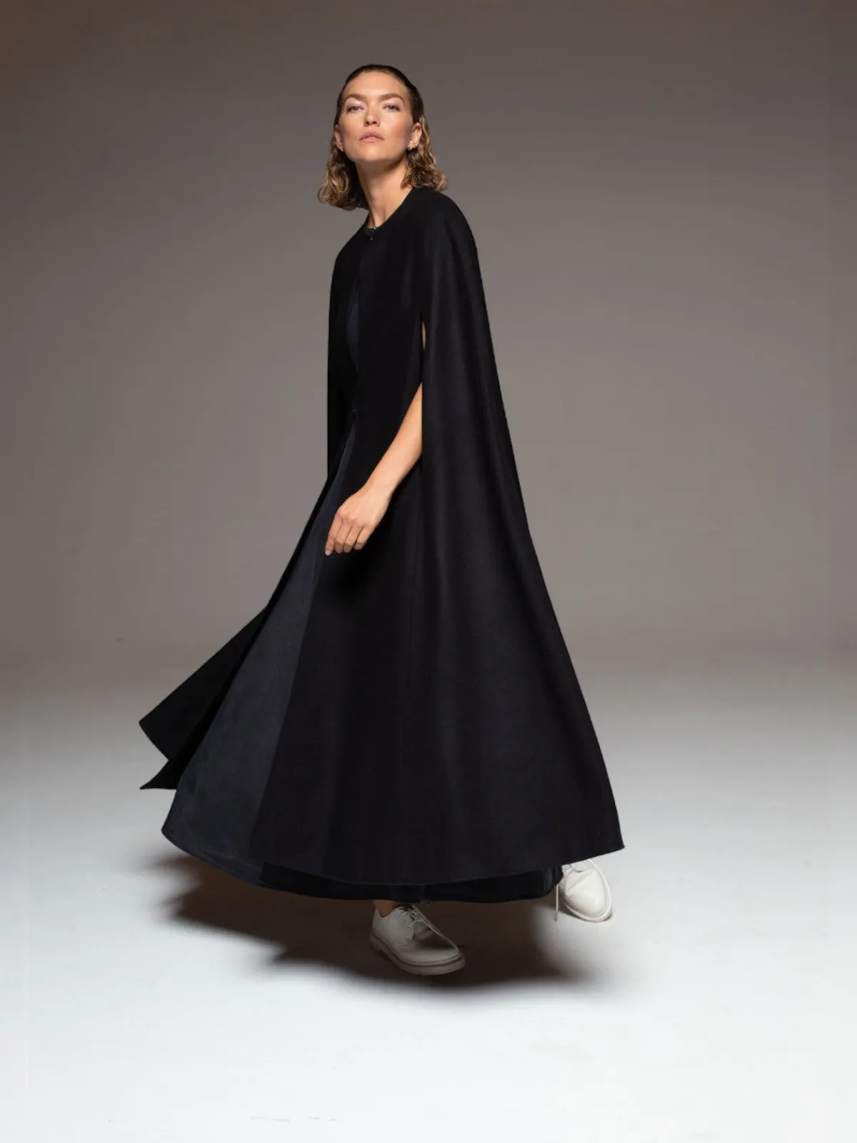 Our Olistic Musca Cape is a long, elegant winter cape is designed to drape effortlessly over both daytime and evening attire, offering a refined layer of warmth. Crafted by hand from Burel wool—an exquisite, high-quality virgin wool—this women’s cape features a subtly elevated collar and a beautifully tailored silhouette. Lined for added comfort, it is distinguished by its relaxed fit at the shoulders, functional arm slits, and secure hooks at the collar and chest. Handcrafted by artisans in Portugal.
