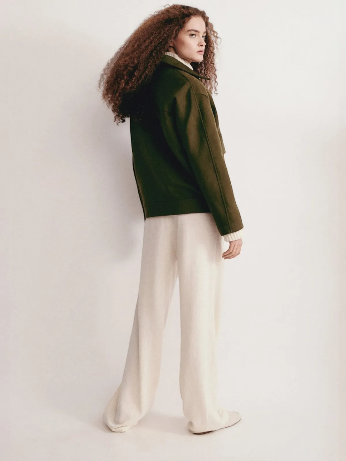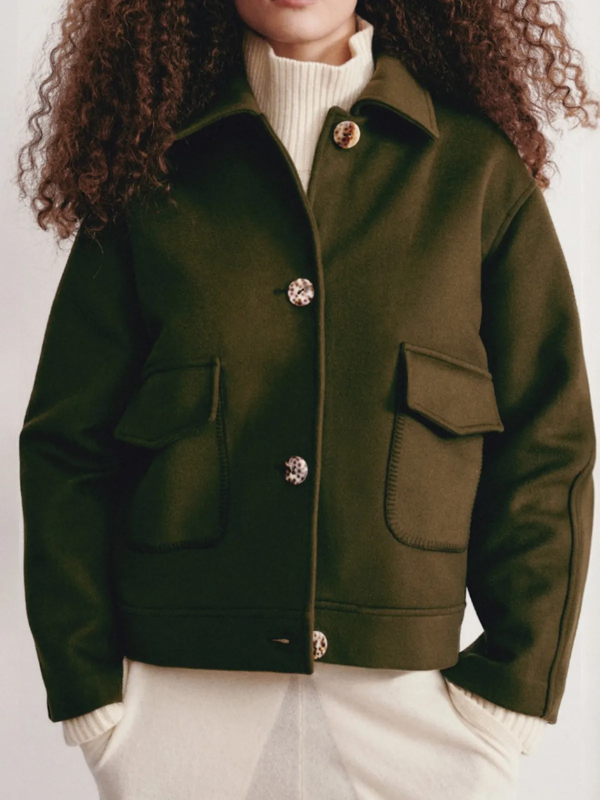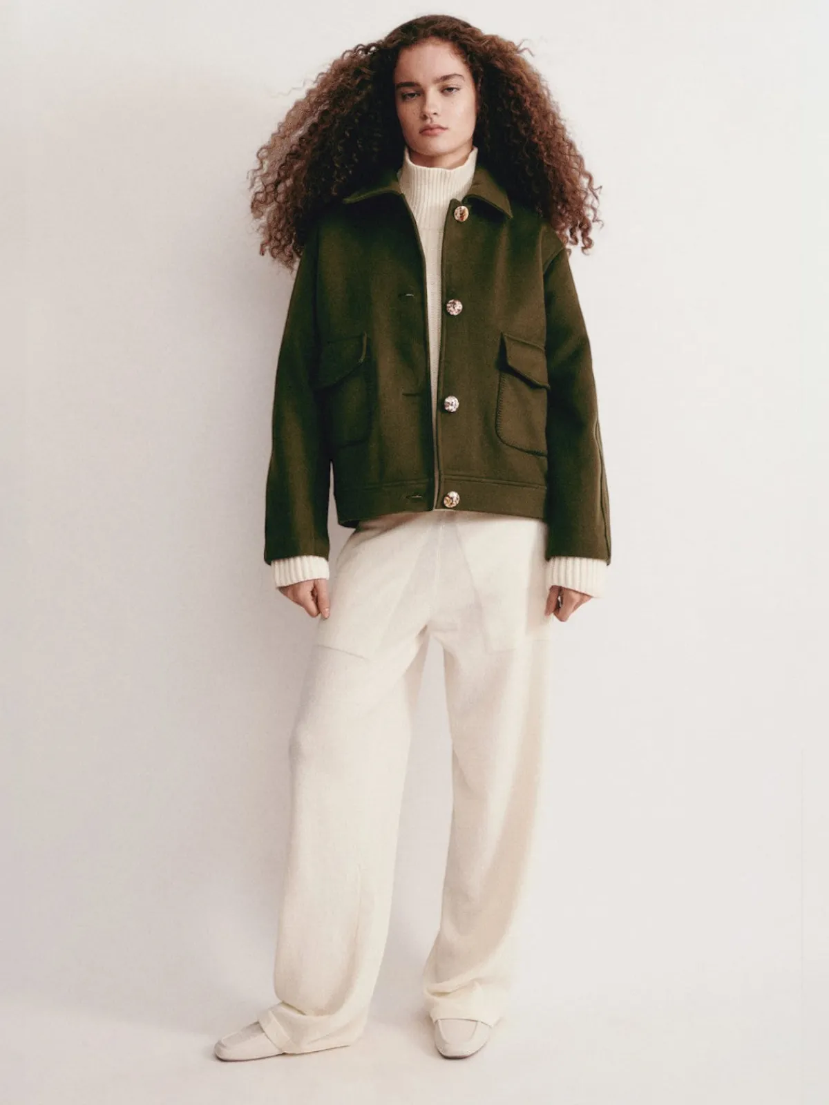 Our Olistic Rocca Bomber in Khaki is crafted from a refined wool and cashmere blend, the Rocca bomber jacket is a timeless, seasonless piece designed for effortless wear. Its drop-shoulder silhouette exudes relaxed sophistication, while the classic collar, two embroidered snap-flap pockets, and GOTS-certified shell buttons add subtle yet distinctive details. Handcrafted by artisans in Portugal.