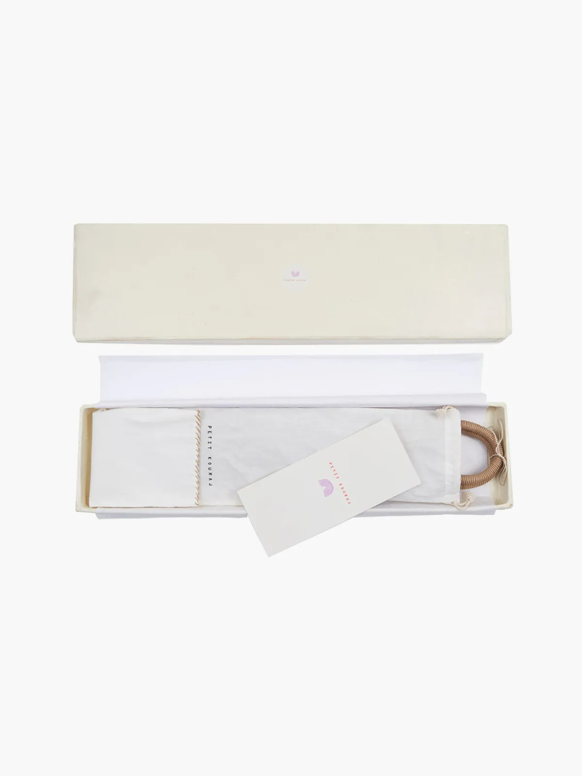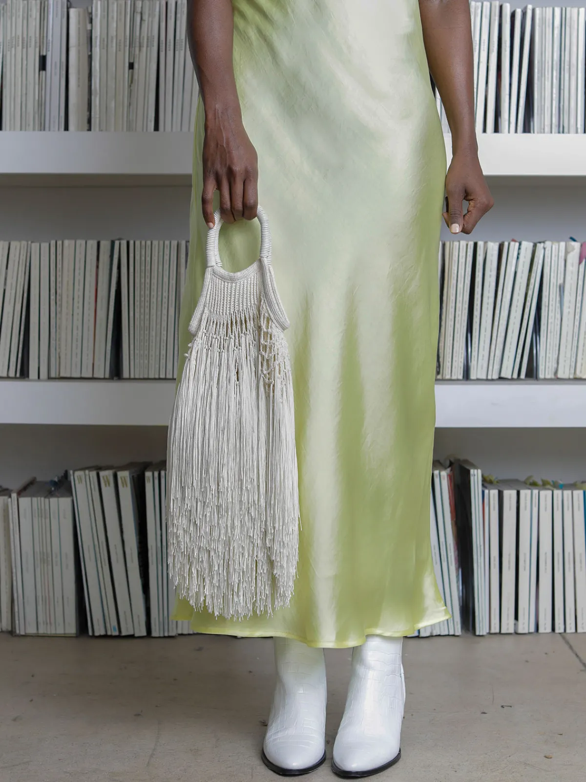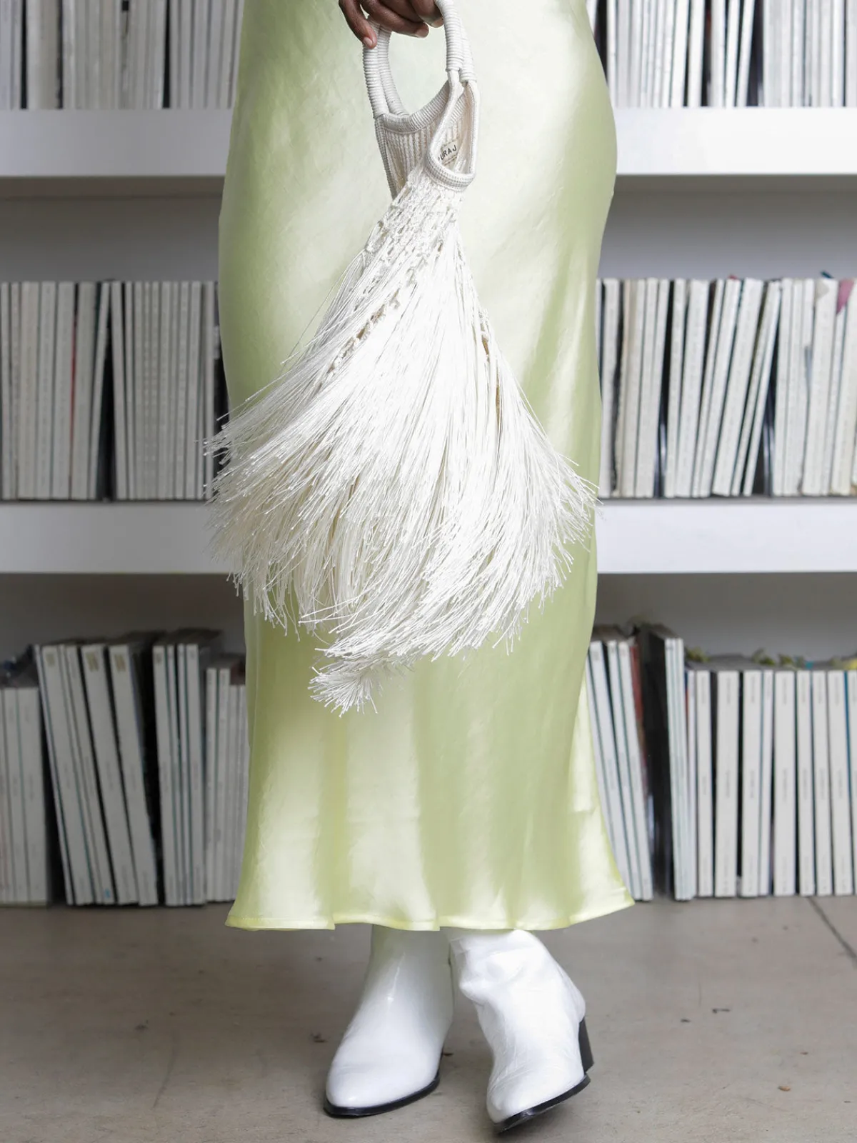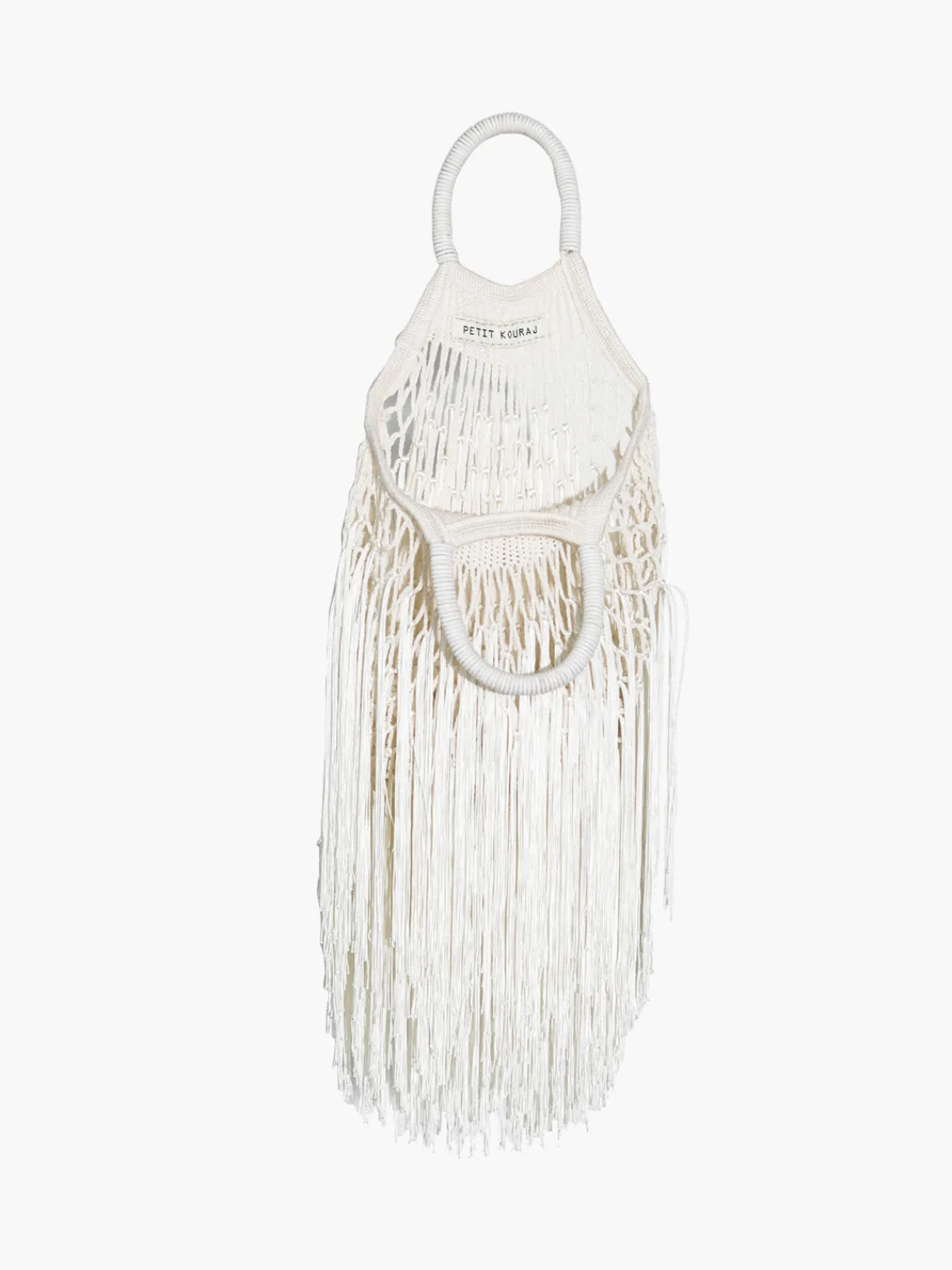Our Petit Kouraj Mini Fringe Bag in Ecru features an ecru cotton net bag with 8″ ecru rayon fringe individually sewn on and a 100% genuine leather handle. These unique bags flow with any movement and form to any item placed inside, but always return to their original shape.