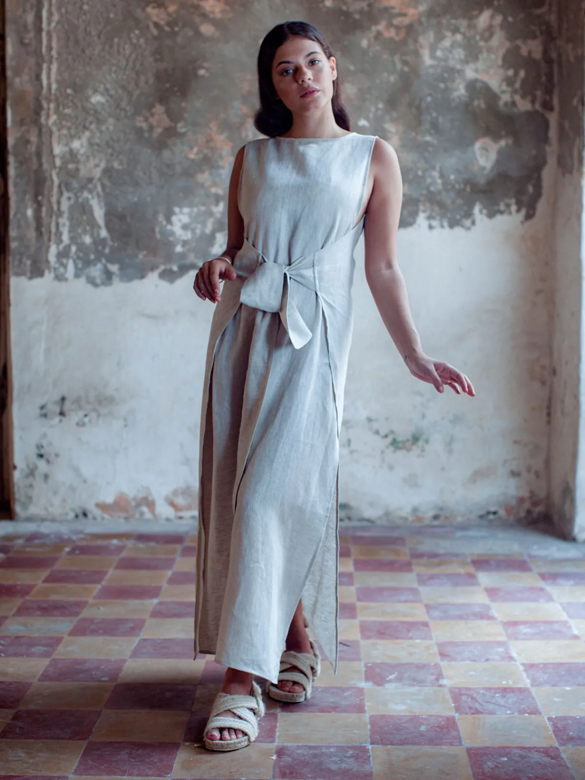 Our Sancte Camelia Dress in Beige is casual yet chic in a sleeveless silhouette with a round neckline. This maxi dress is detailed with a wrap that ties at the waist and high slits on each side. Handcrafted by female artisans in Colombia.