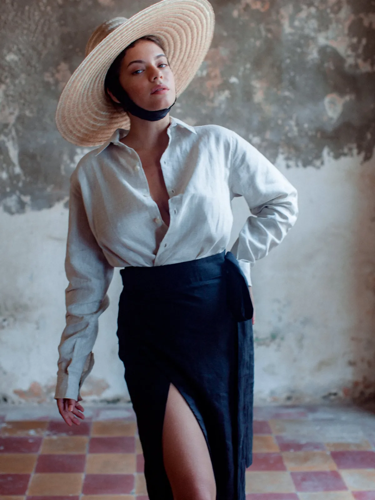 Our Sancte Damas Skirt in Black features a wrap silhouette with a high waist and a self-fabric sash that ties on one hip. The midi length and side slit make it easy to dress up or dress down for day or night. Handcrafted by female artisans in Colombia.