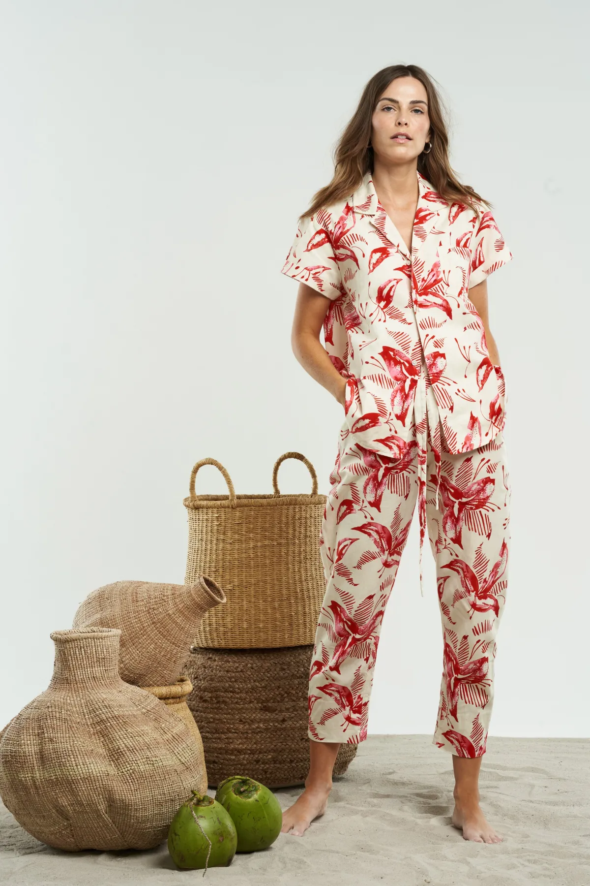 Our Sigal Hawaiian Shirt in Cayena features a boxy silhouette with short sleeves, a button front placket, and a patch pocket on the left chest. Pair with the Cayena Paper Bag Pants for a perfectly coordinated set. Handcrafted in India featuring hand-drawn designs digitally printed to cut water waste and reduce overproduction.