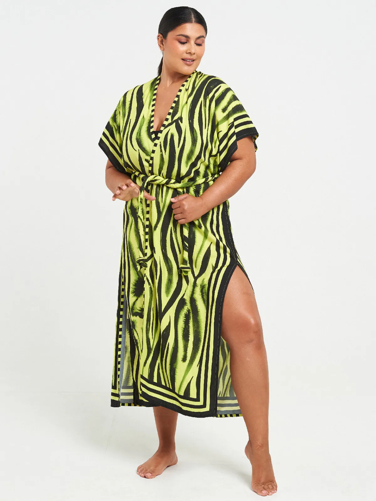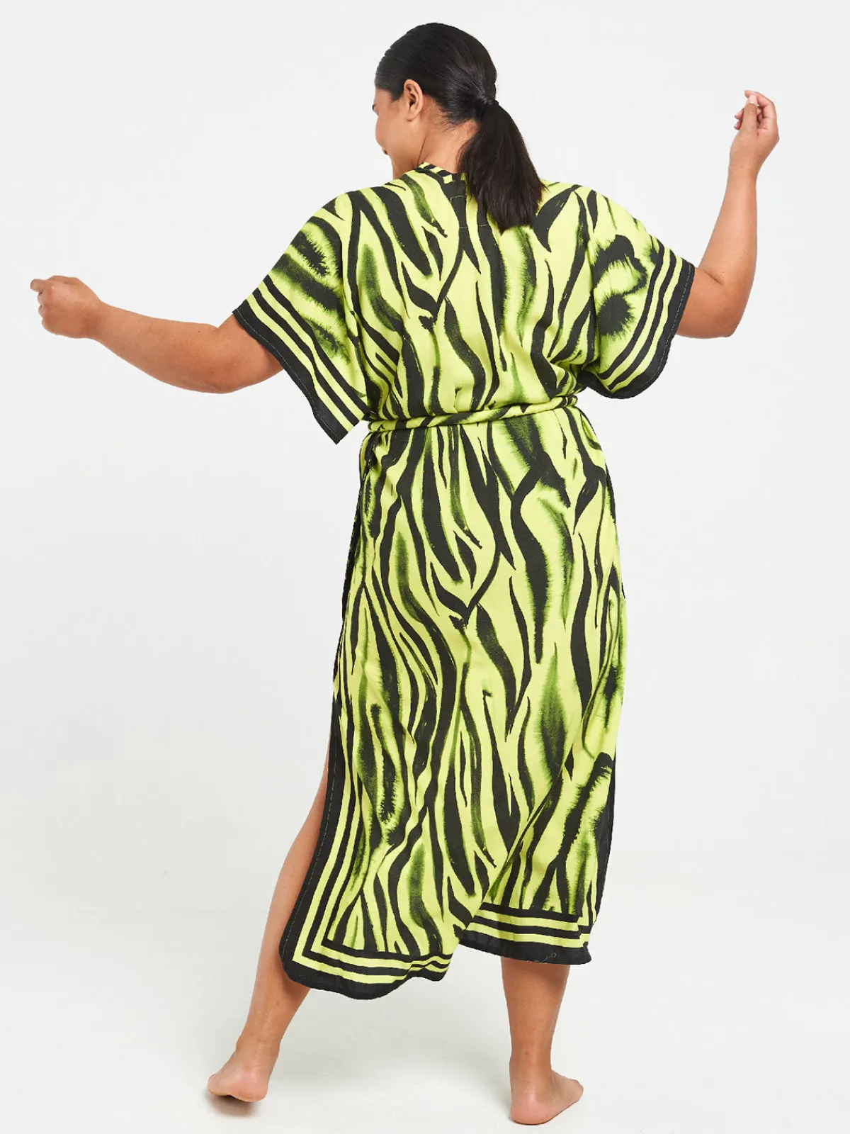 Our Sigal Neon Zebra Long Kimono features a maxi silhouette with wide short sleeves, an open front, side slits, and an optional corded belt to tie at the waist. Handcrafted in India featuring hand-drawn designs digitally printed to cut water waste and reduce overproduction.