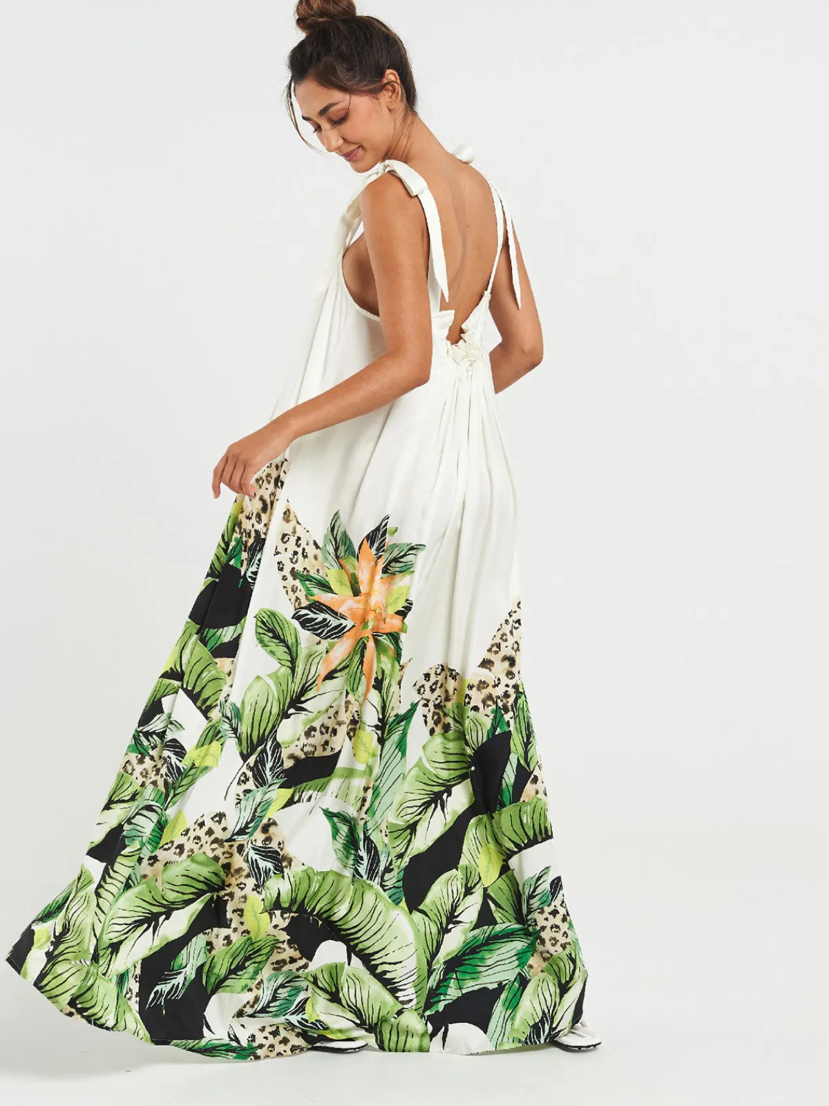 Our Sigal Long Open Back Dress in Selvafeatures a flowing maxi silhouette with ruched details at the neck, a low back, and adjustable straps that can be knotted or tied into bows. Handcrafted in India featuring hand-drawn designs digitally printed to cut water waste and reduce overproduction.