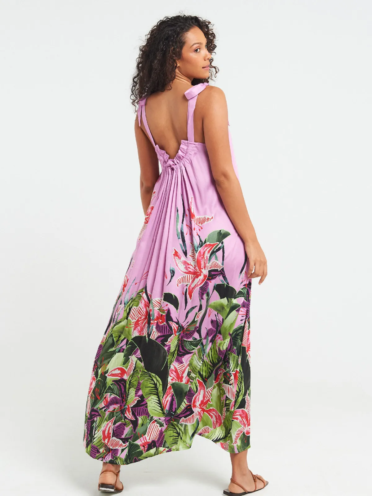 Our Sigal Long Open Back Dress in Hawaiian Lily features a flowing maxi silhouette with ruched details at the neck, a low back, and adjustable straps that can be knotted or tied into bows. Handcrafted in India featuring hand-drawn designs digitally printed to cut water waste and reduce overproduction.