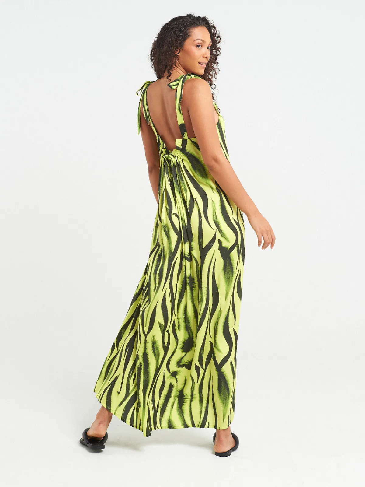 Our Sigal Neon Zebra Long Open Back Dress features a flowing maxi silhouette with ruched details at the neck, a low back, and adjustable straps that can be knotted or tied into bows. Handcrafted in India featuring hand-drawn designs digitally printed to cut water waste and reduce overproduction.