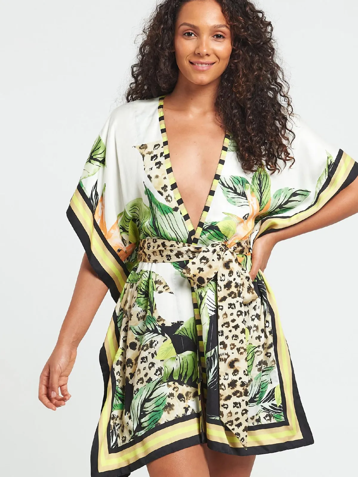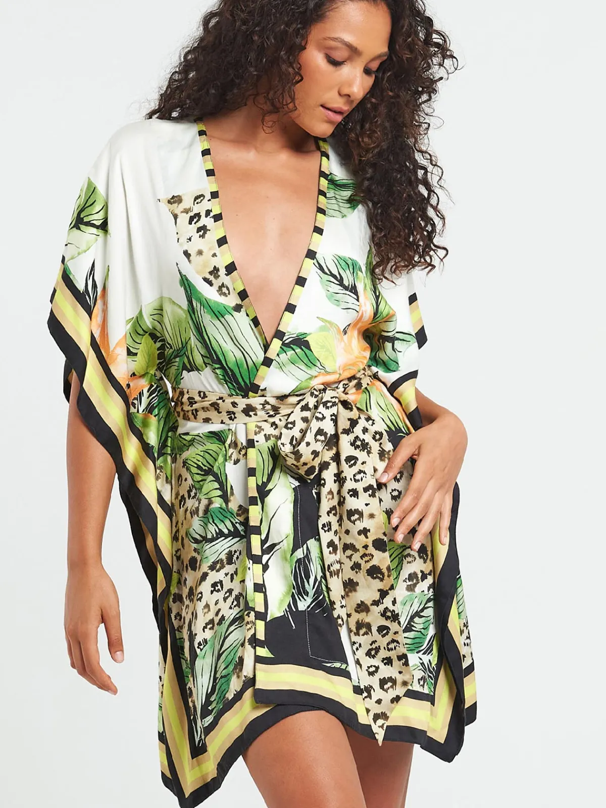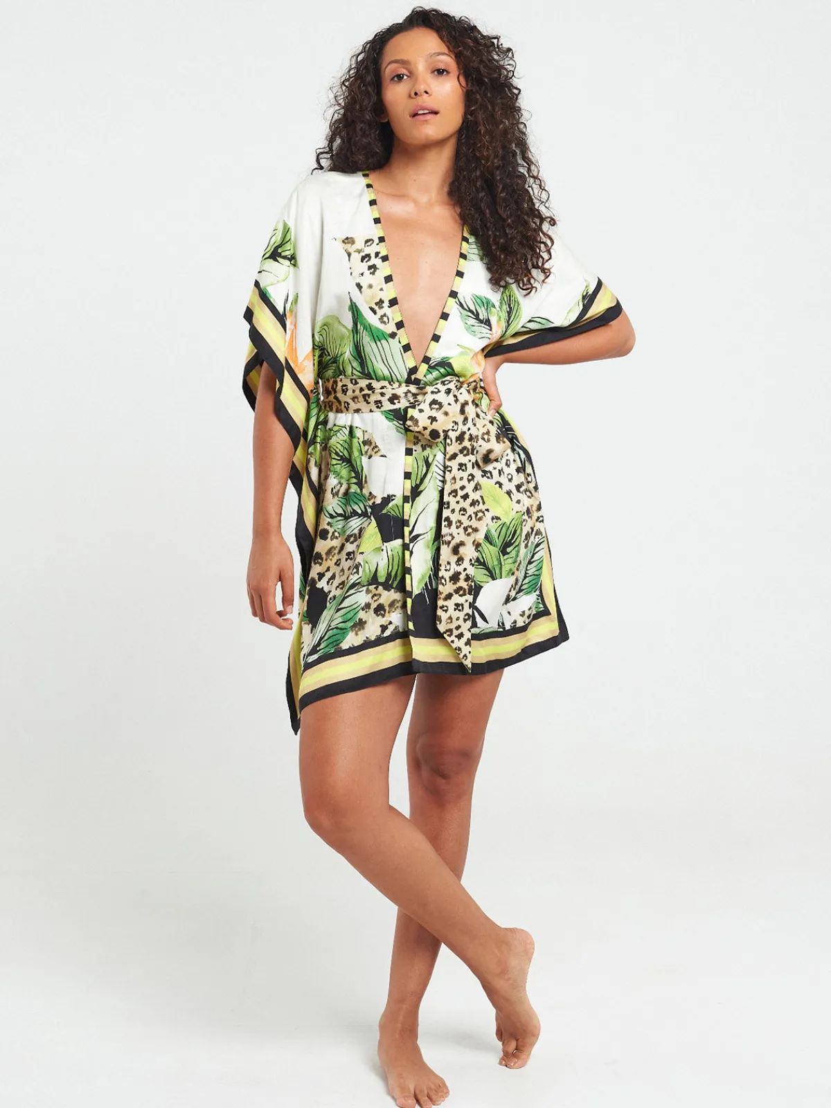 Our Sigal Short Kimono in Selvafeatures a relaxed silhouette with short, wide sleeves, an open front, and a tie belt to close it at the waist. Wear as a swimsuit coverup or a casual wrap dress. Handcrafted in India featuring hand-drawn designs digitally printed to cut water waste and reduce overproduction.