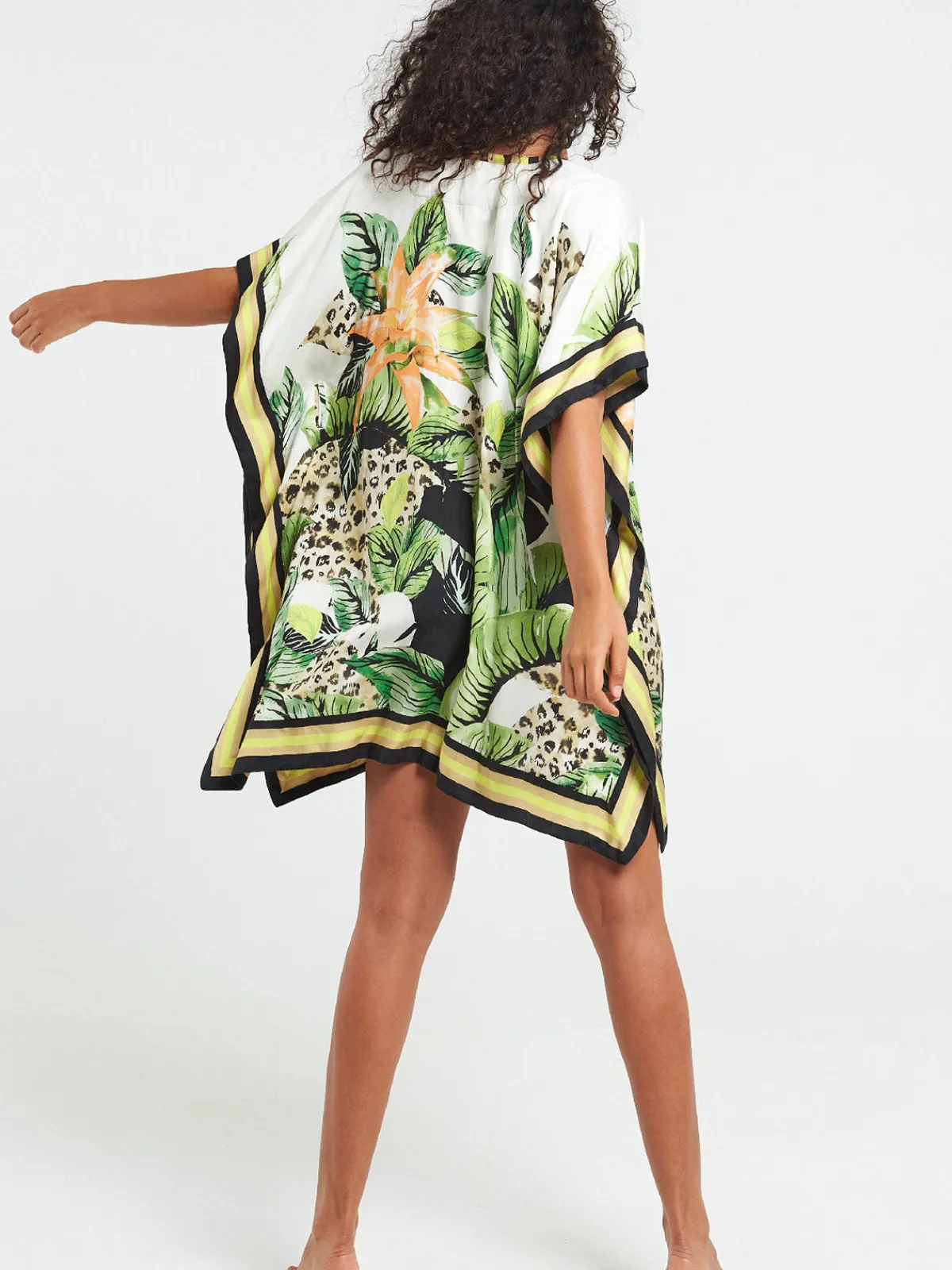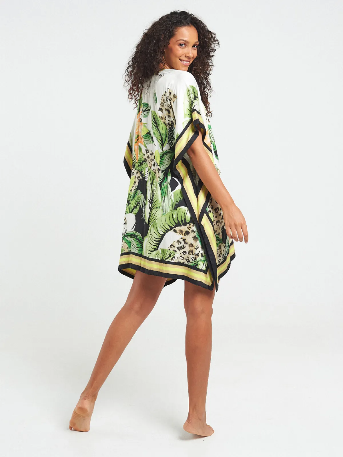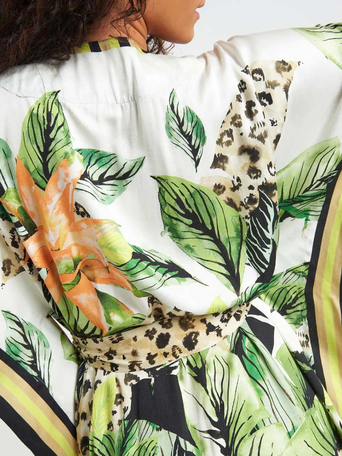 Our Sigal Short Kimono in Selvafeatures a relaxed silhouette with short, wide sleeves, an open front, and a tie belt to close it at the waist. Wear as a swimsuit coverup or a casual wrap dress. Handcrafted in India featuring hand-drawn designs digitally printed to cut water waste and reduce overproduction.