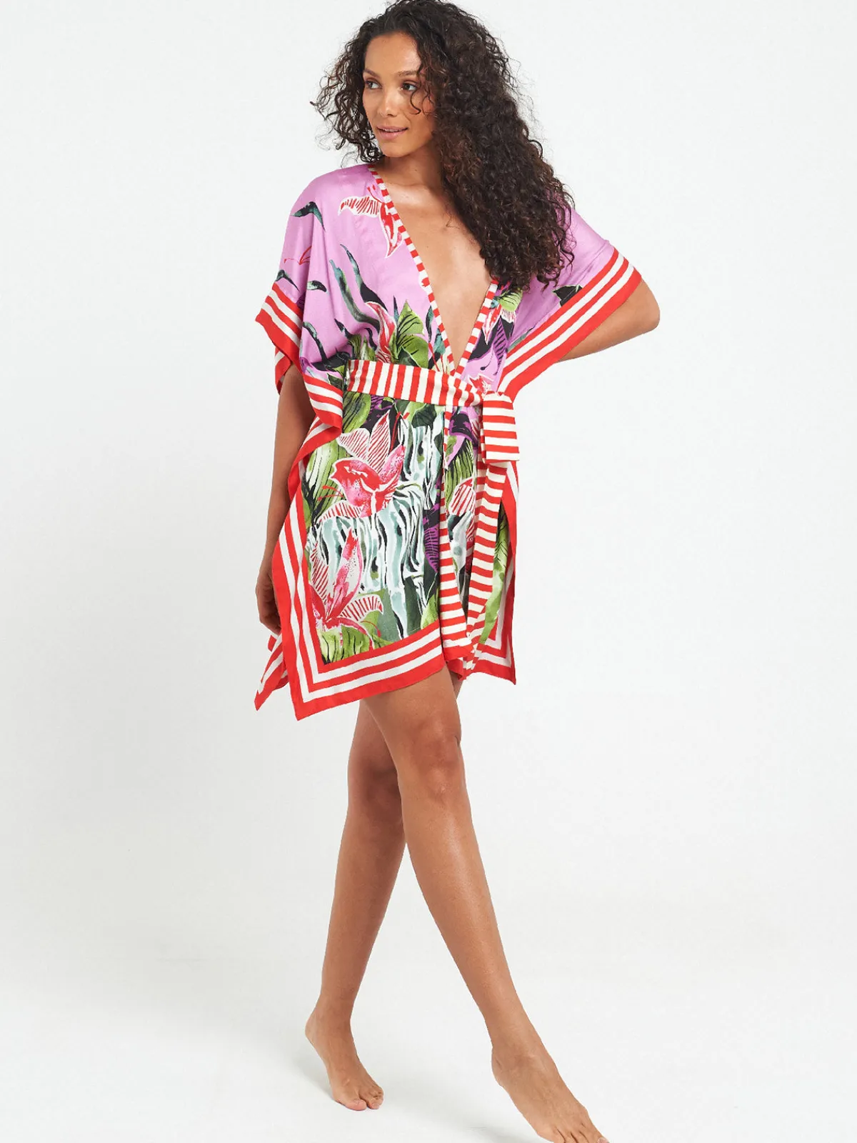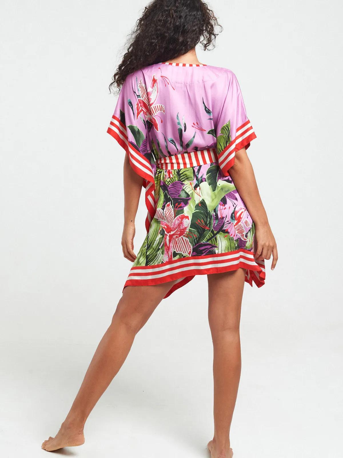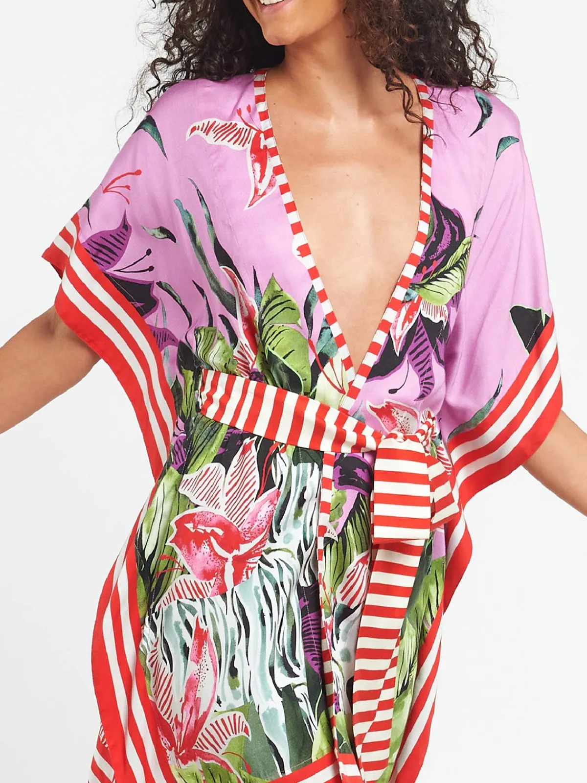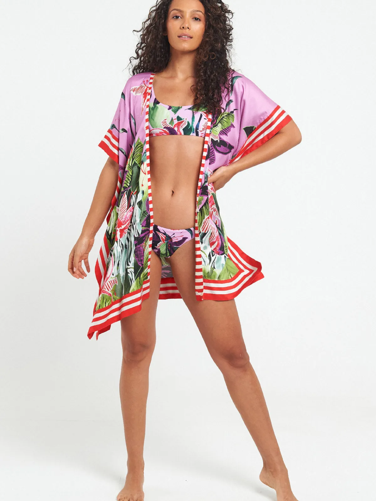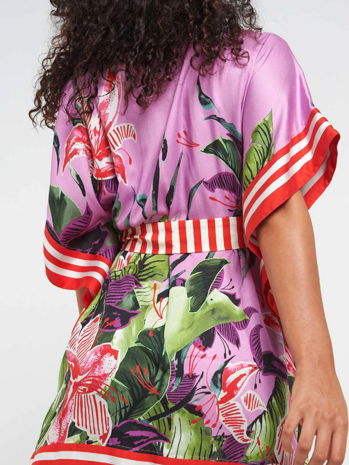 Our Sigal Short Kimono in Hawaiian Lilyfeatures a relaxed silhouette with short, wide sleeves, an open front, and a tie belt to close it at the waist. Wear as a swimsuit coverup or a casual wrap dress. Handcrafted in India featuring hand-drawn designs digitally printed to cut water waste and reduce overproduction.