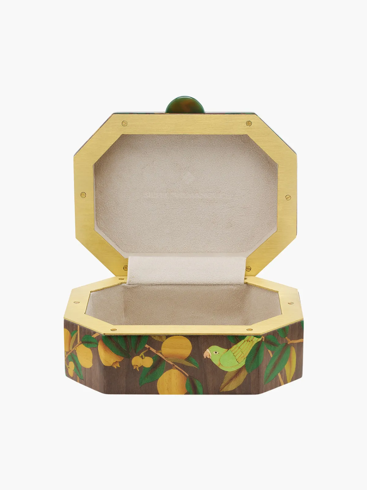 Features a multi-sided design with a hinged lid and an allover guava and parrot pattern inspired by the botanical drawings of early Colombian explorers. The wood for these pieces was sourced from fallen growth in the Amazon. Handcrafted by artisans in Brazil.