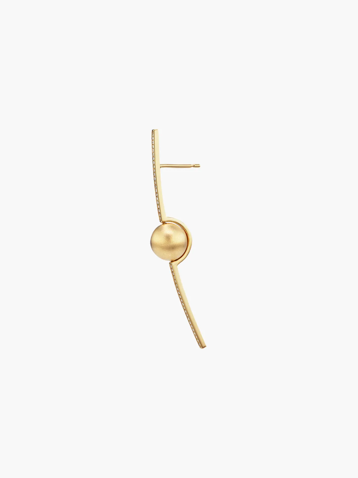 TEJEN x FASHIONKIND drop earrings with gold ball hugged by a diamond-accented bar. Handcrafted by artisans in India’s first and only Fairmined-certified facility using Fairmined Gold.
