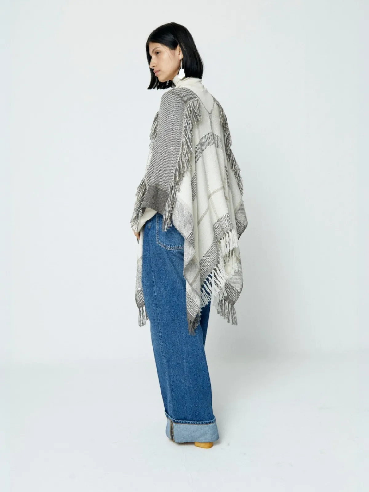 Our Tejido Simone Poncho in Natural embodies a flowing, graceful silhouette, adorned with intricate detailing that evokes soft, earthy tones. The fringed edges enhance its texture and movement, adding a subtle yet sophisticated flair to the design. Handcrafted by female artisans in Peru using locally sourced sustainable materials.