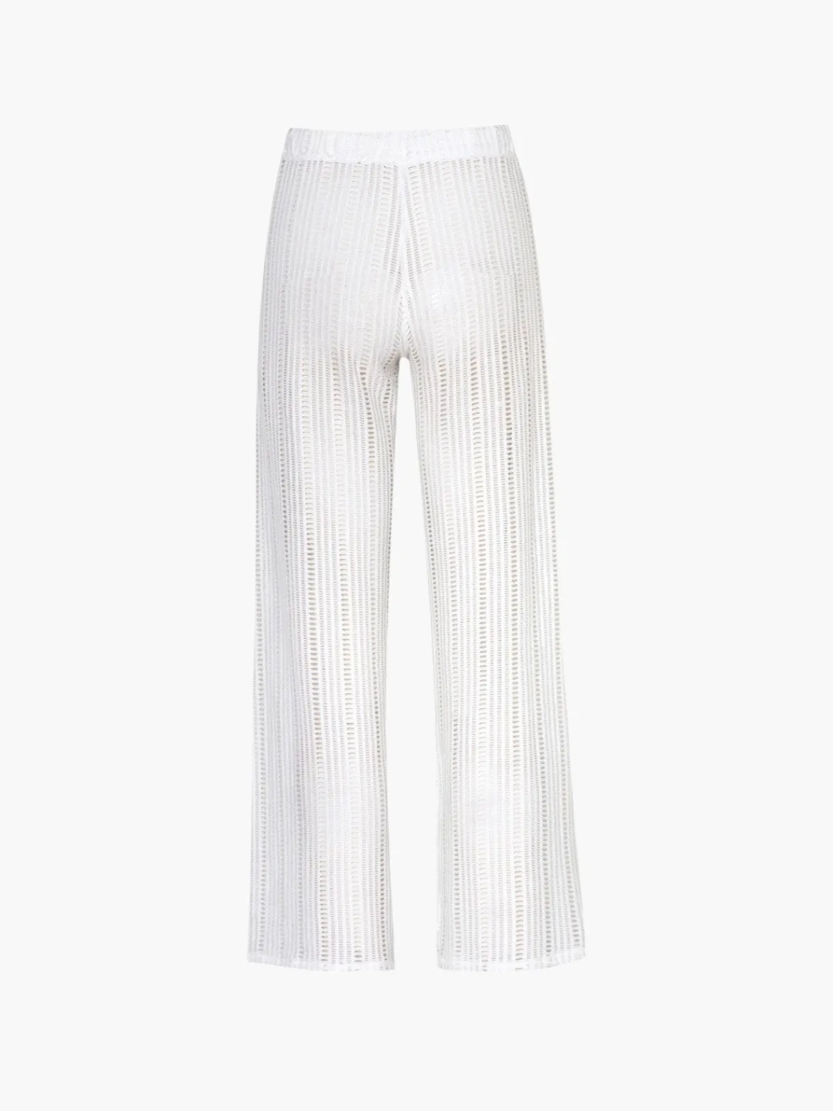 Our Verdelimon Adele Trousers in Ivory Geometric are a pair of mid rise pants made with a crochet detailing. The pants have wide flowy legs with an adjustable elastic waistband. You can wear the pants as a cover up at the beach or pool. Handcrafted by female heads of households in Colombia.