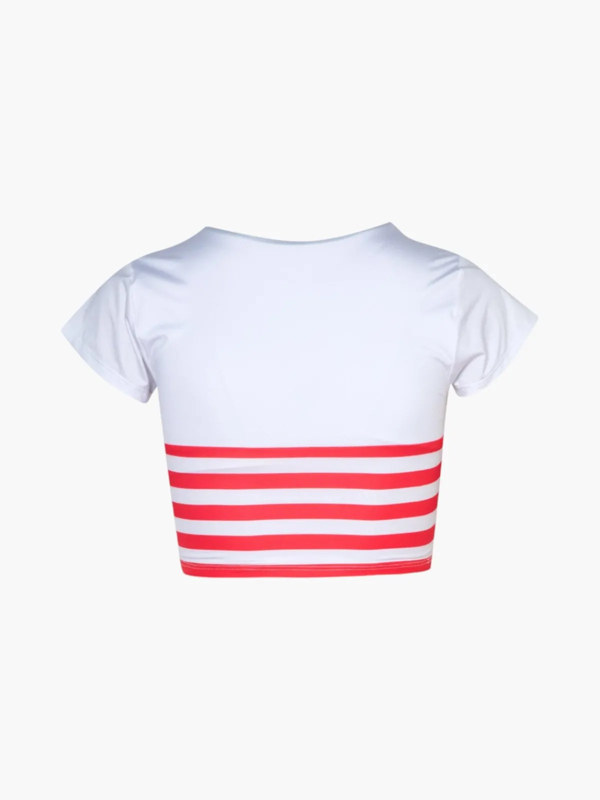 Our Verdelimon Mathilde Top in Cherry Stripes is a short sleeve cropped bathing suit top. Pair this top with the matching Banes Bottom. Handcrafted by female heads of households in Colombia.