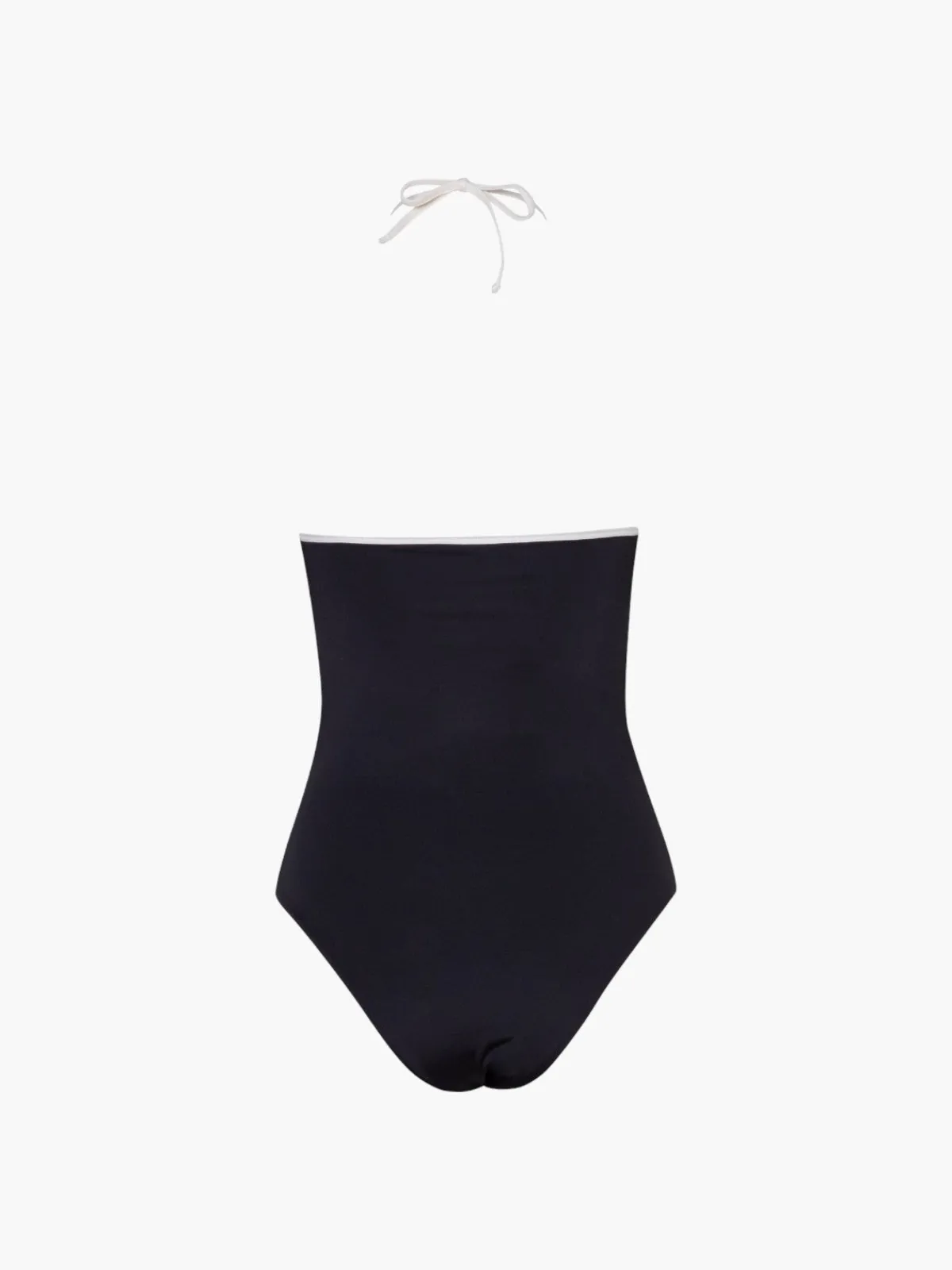 Our Verdelimon Nauta One Piece in Ivory/Black is a black one piece with a white trim halter neckline. Handcrafted by female heads of households in Colombia.