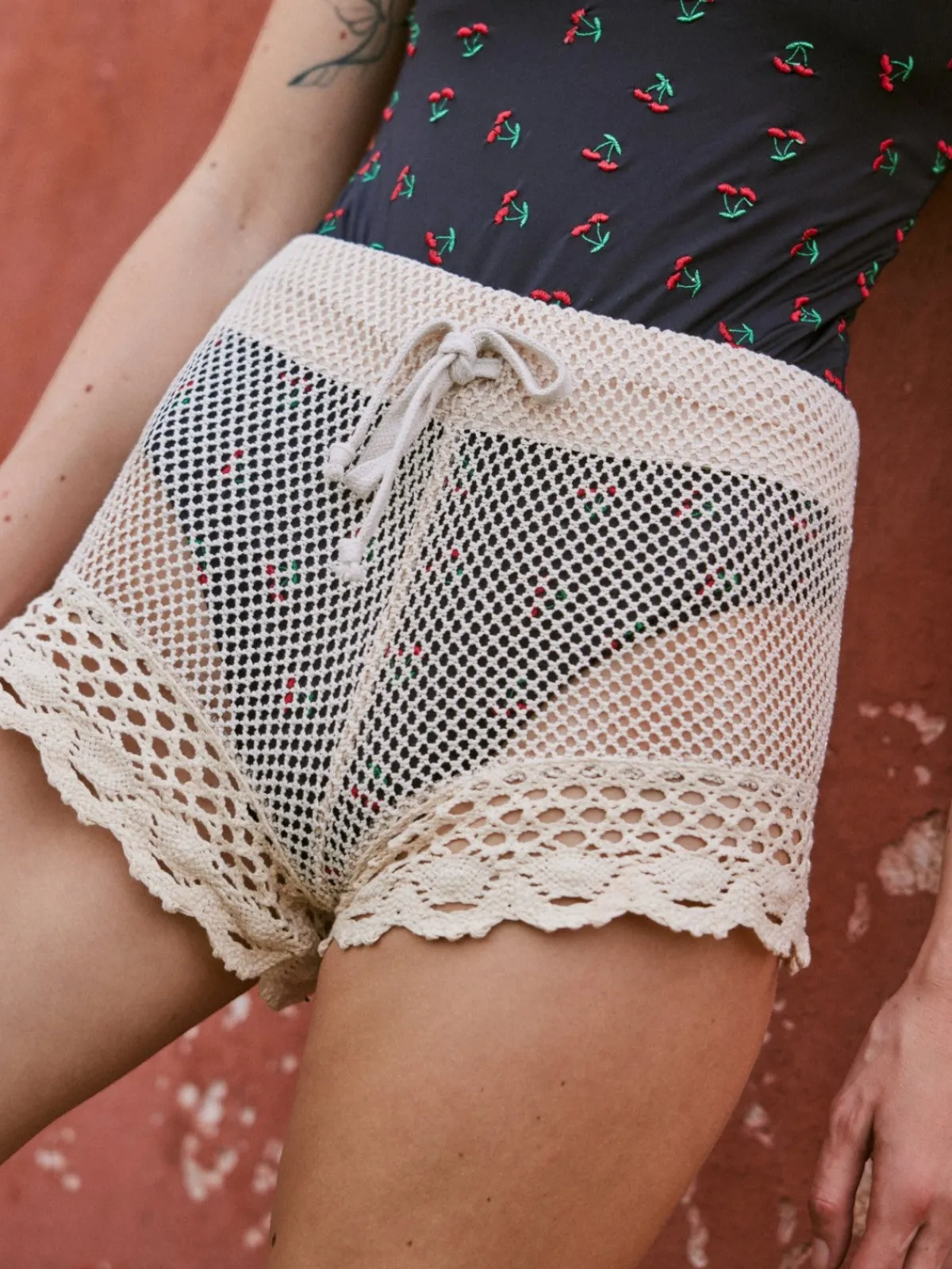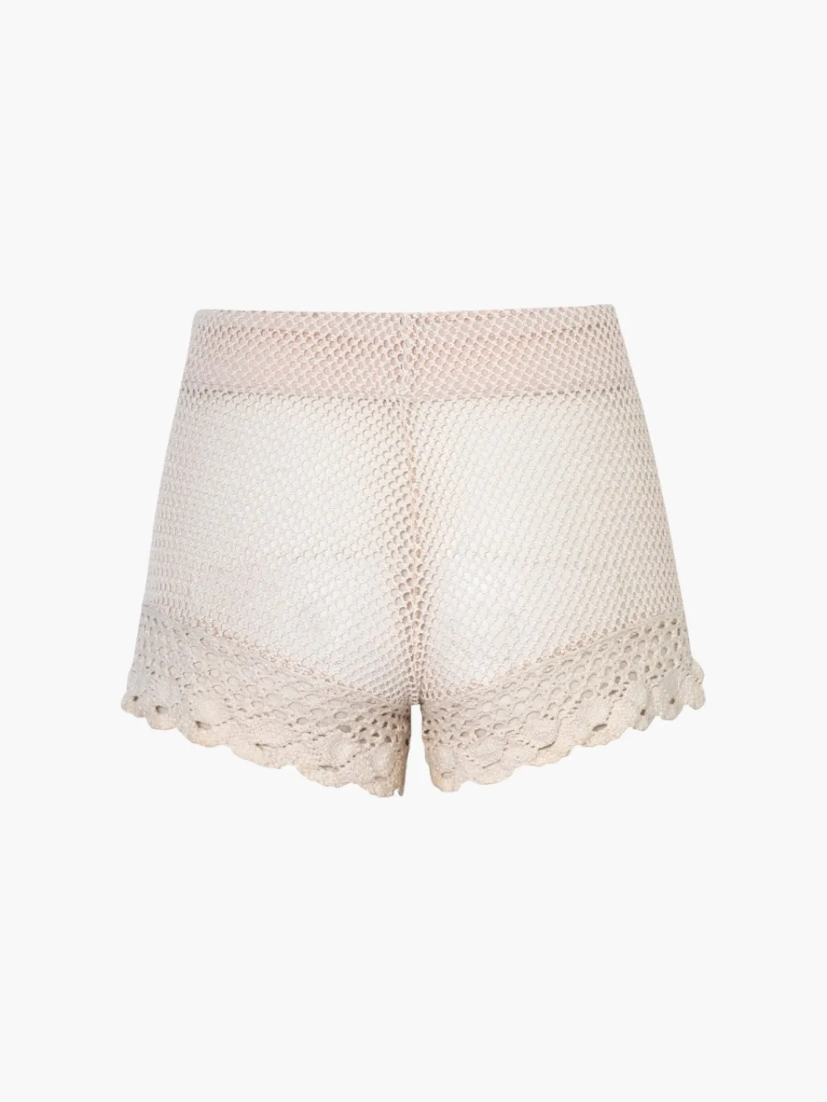 Our Verdelimon Sophie Shorts in Sand are a ribbed mini short featuring a crochet, scalloped hemline. The shorts have a drawstring elastic waistband. Handcrafted by female heads of households in Colombia.