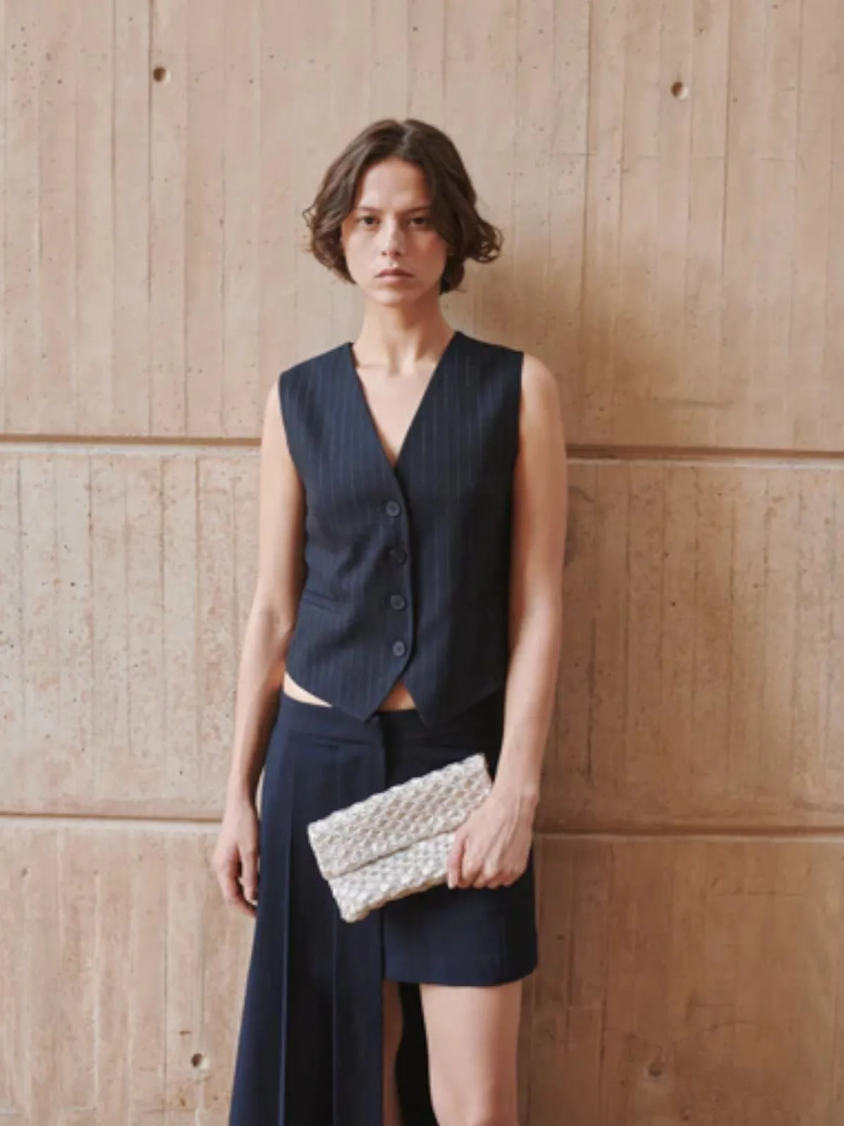 Our Verdi Clutch in Silver is an exquisite, hand-woven creation, meticulously crafted in a delicate seashell weave that evokes the elegance of nature. This piece is fashioned from silver-plated metal threads, with a soft velvet lining that adds a luxurious touch. It features a refined magnetic closure. Each bag is entirely handwoven by female artisans in Colombia and takes up to 15 days to complete.