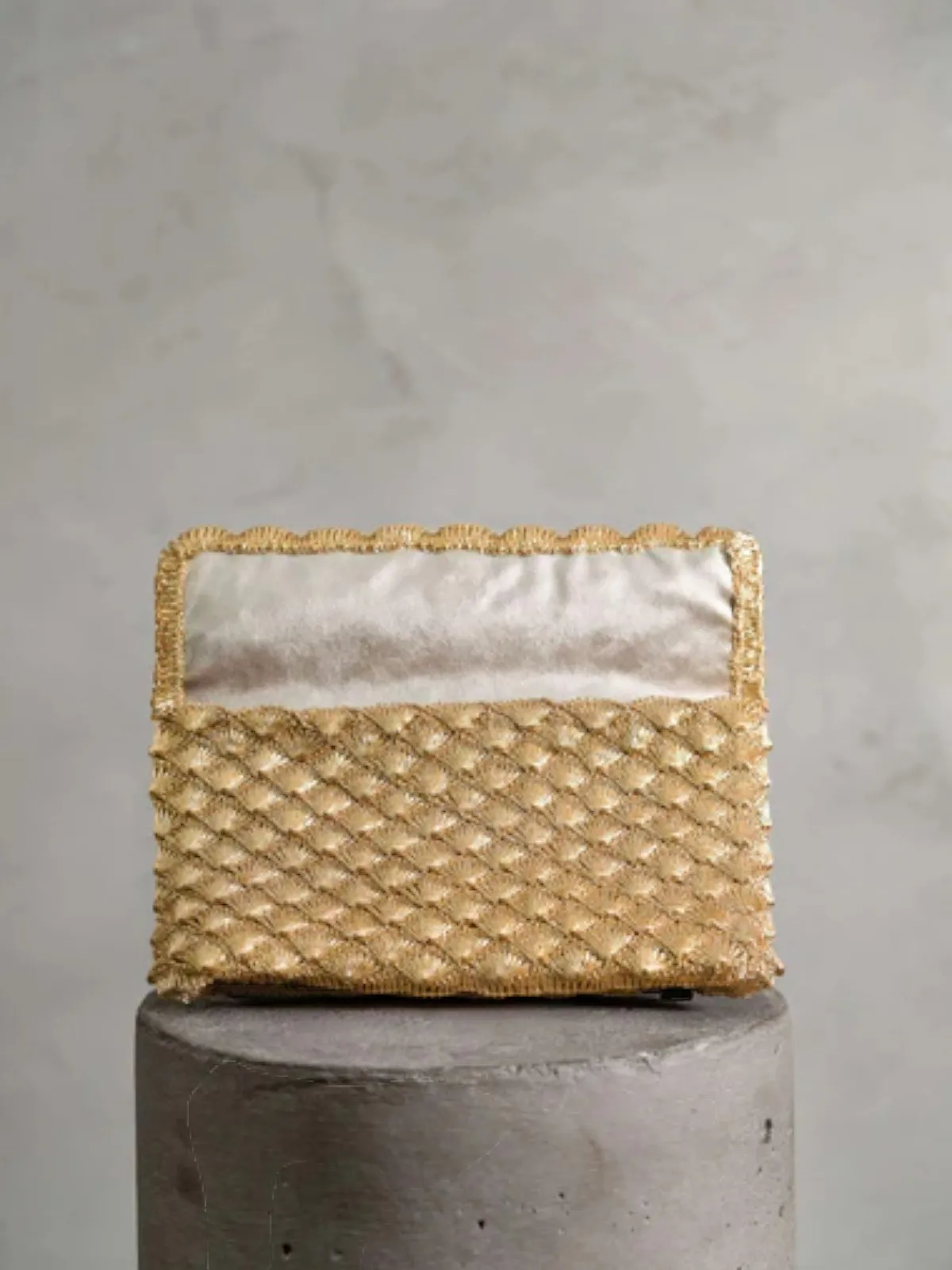 Our Verdi Clutch in Gold is an exquisite, hand-woven creation, meticulously crafted in a delicate seashell weave that evokes the elegance of nature. This piece is fashioned from silver-plated metal threads, with a soft velvet lining that adds a luxurious touch. It features a refined magnetic closure. Each bag is entirely handwoven by female artisans in Colombia and takes up to 15 days to complete.