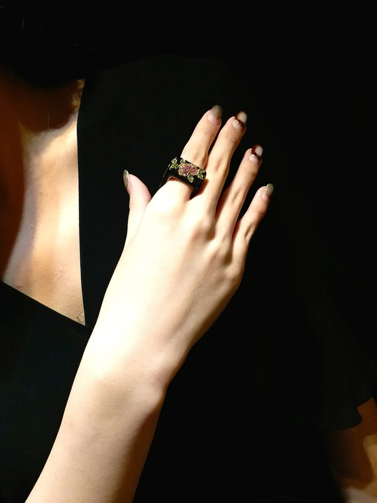 Part of our partnership with Vogue Italia, Yewn’s Reclaimed Wood Ring showcases reclaimed rose wood decorated with a diamond and pink and yellow sapphire flower, which is set in yellow gold. Tsavorites adorn leaves that appear to be falling on either side of the ring. Handcrated and one-of-a-kind. 10% of all proceeds goes to Space for Giants.