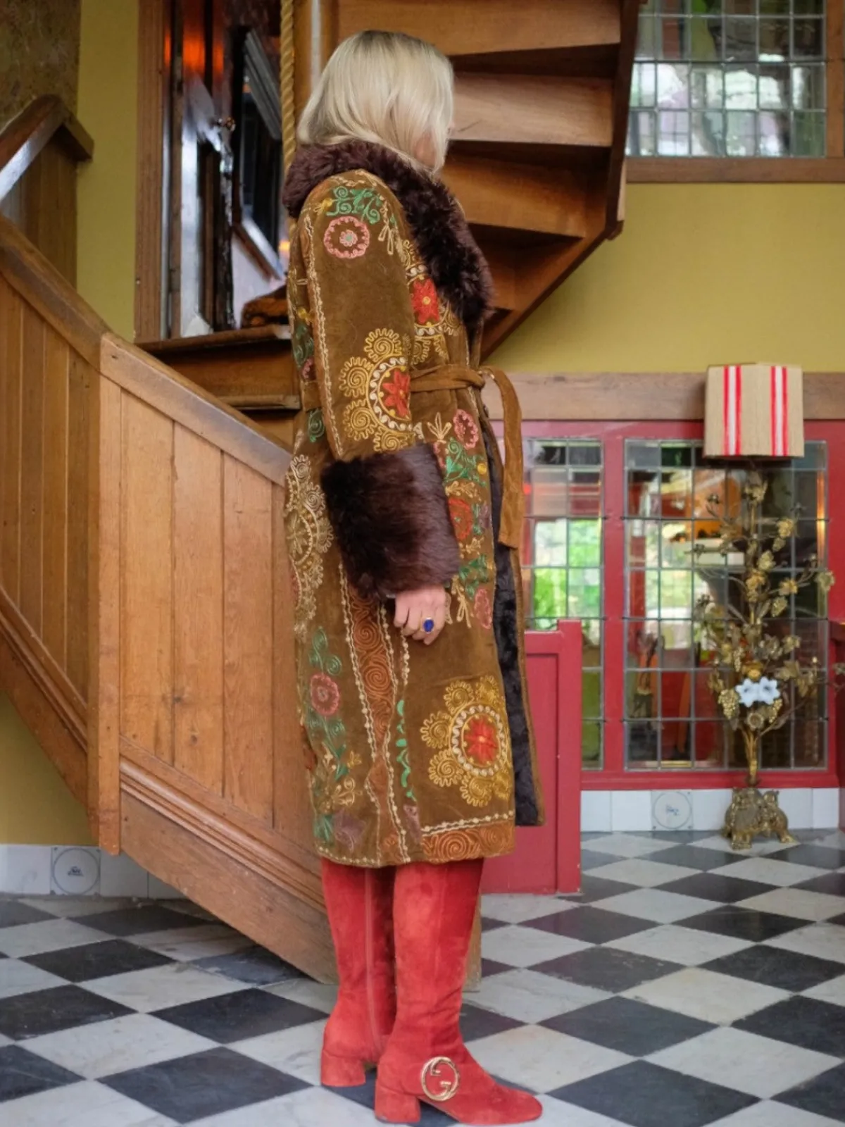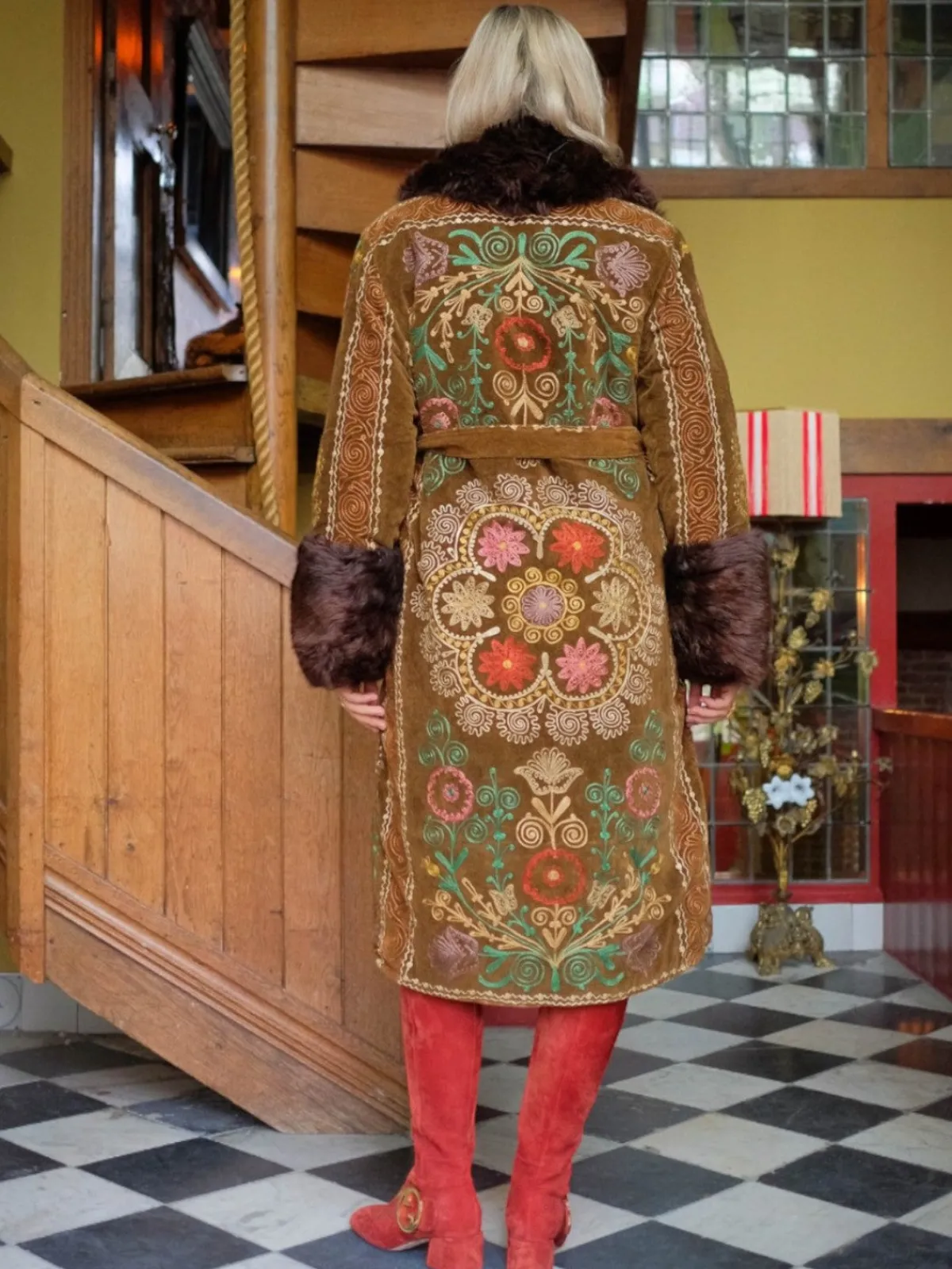 Our ZAZI Aisara Wrap Coat in Multi Print/Brown epitomizes the artistry and dedication of skilled women, with each piece showcasing meticulous craftsmanship. Infused with a distinct 70s allure, it is expertly handcrafted from curated vintage velvet suzani embroidery, intricately woven with upcycled sheepskin, and finished with a luxurious fur trim. With two front pockets, vintage button closure, and a removable belt, this stunning coat will turn heads. Given the vintage nature of the textiles, each coat is entirely one-of-a-kind and only available in the indicated size.Handcrafted by female artisans in Afghanistan.